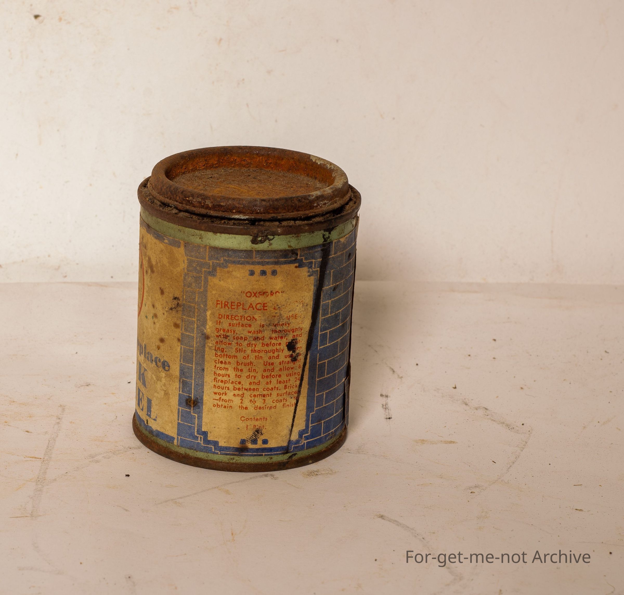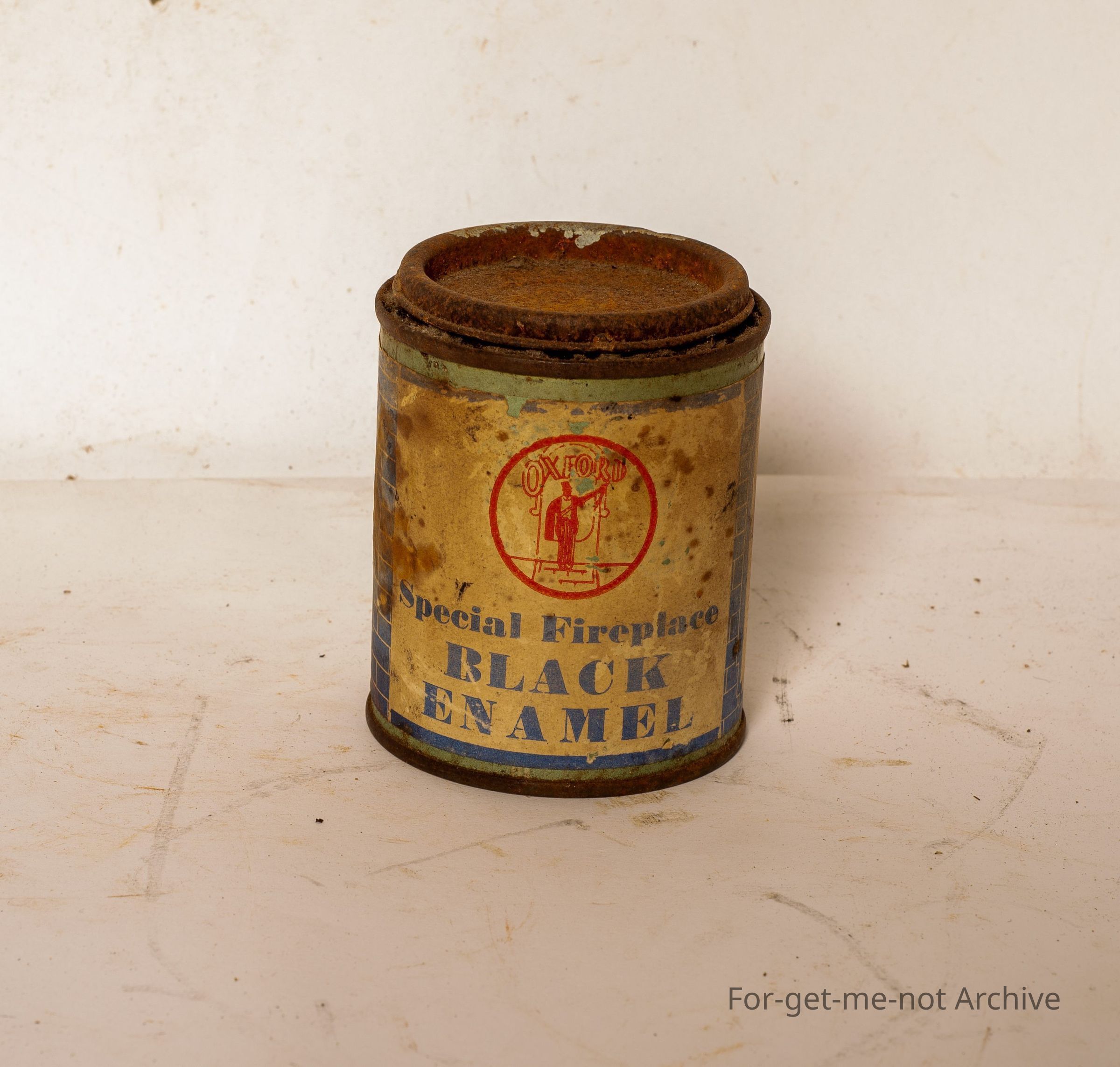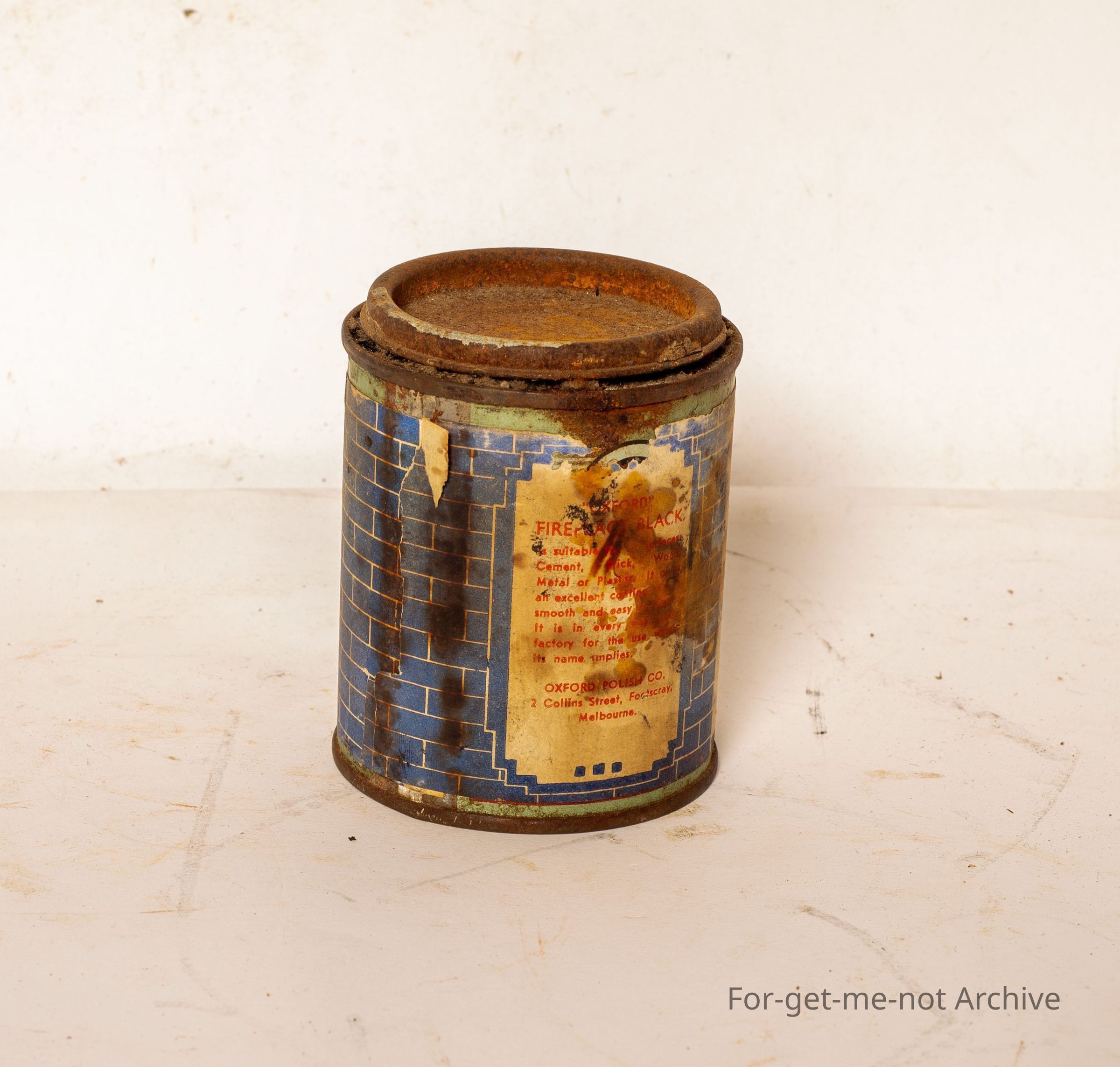 A can of black stove enamel, This is called special fireplace black enamel, from the Oxford Company. This is a Melbourne tin from Oxford House, Foot Footscray, Malvern. Contents included.Collection