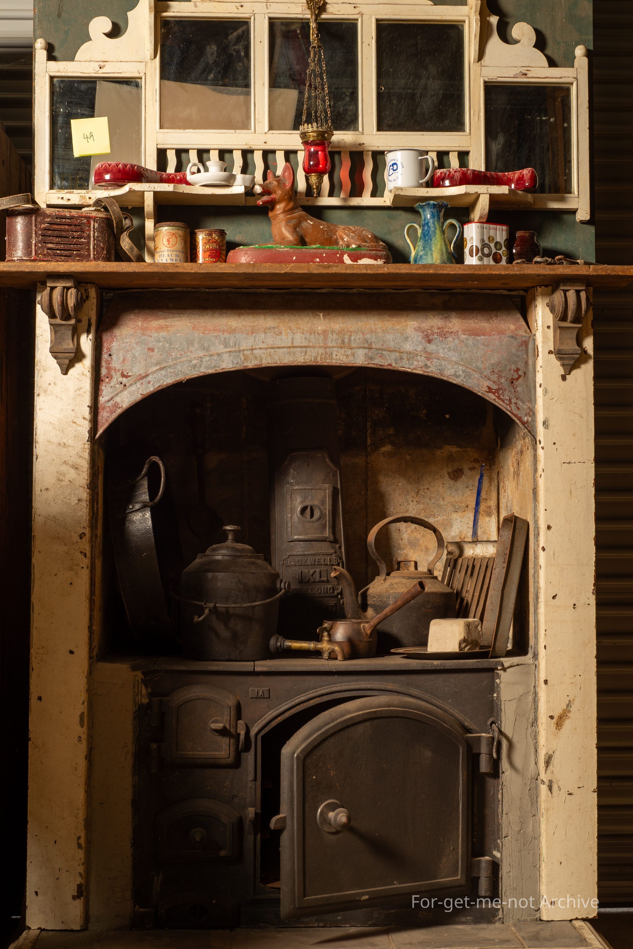 Tin fireplace with cast iron stove. this is a manufactured tin chimney. The The stove is a genuine oil cast iron stove in very good condition with, all the functions of it working. A nice decorative mantle piece on the unit as well. It is being mounted on roller casters to for the ease of moving about.Collection