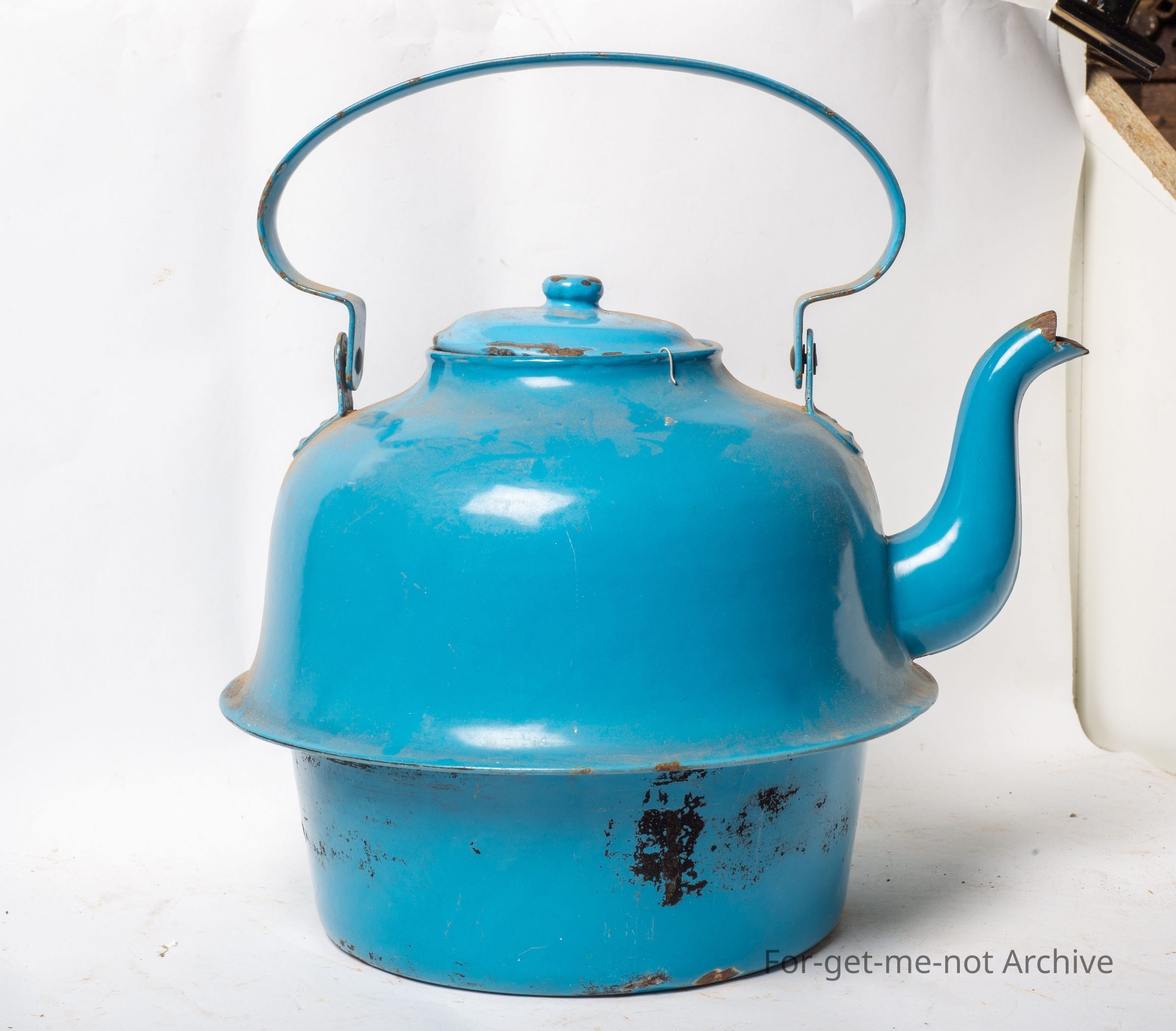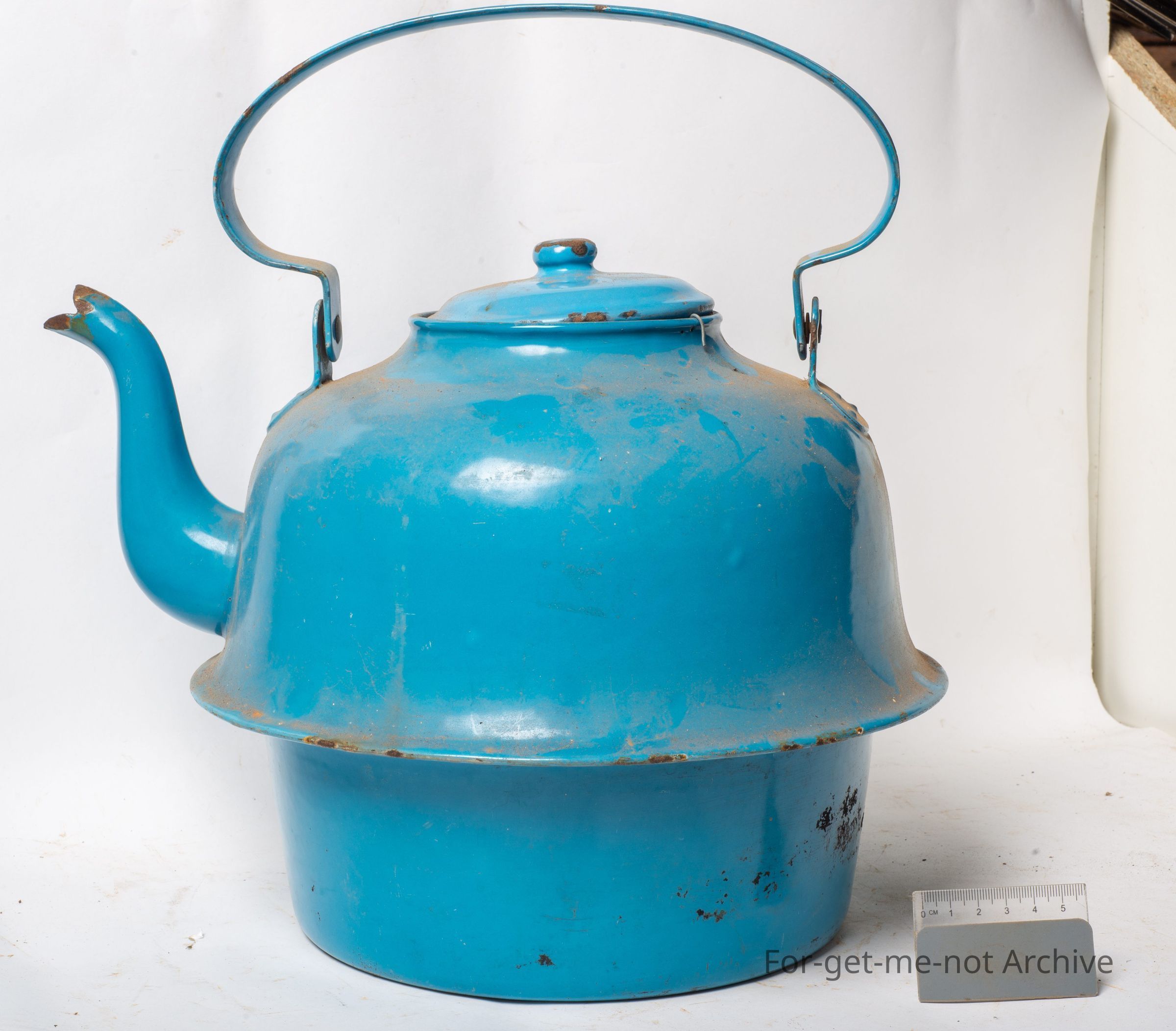 This is a very large enamel kettle, 22 gallon capacity. This has a rim halfway around the body for lifting the circular top out of a big old cast iron range stove, to allow it to boil a lot quicker. Has lid the perf the blue enamel is in very good condition. This was, bought recently from Hawker in South Australia.Collection