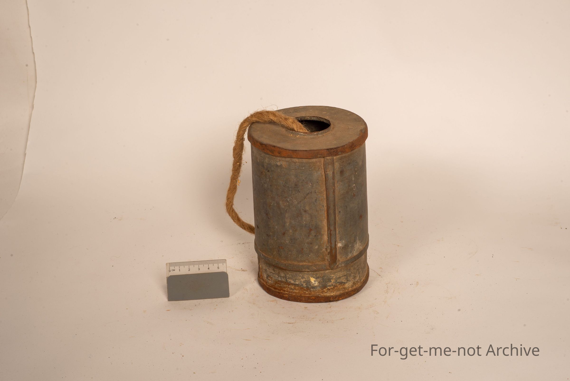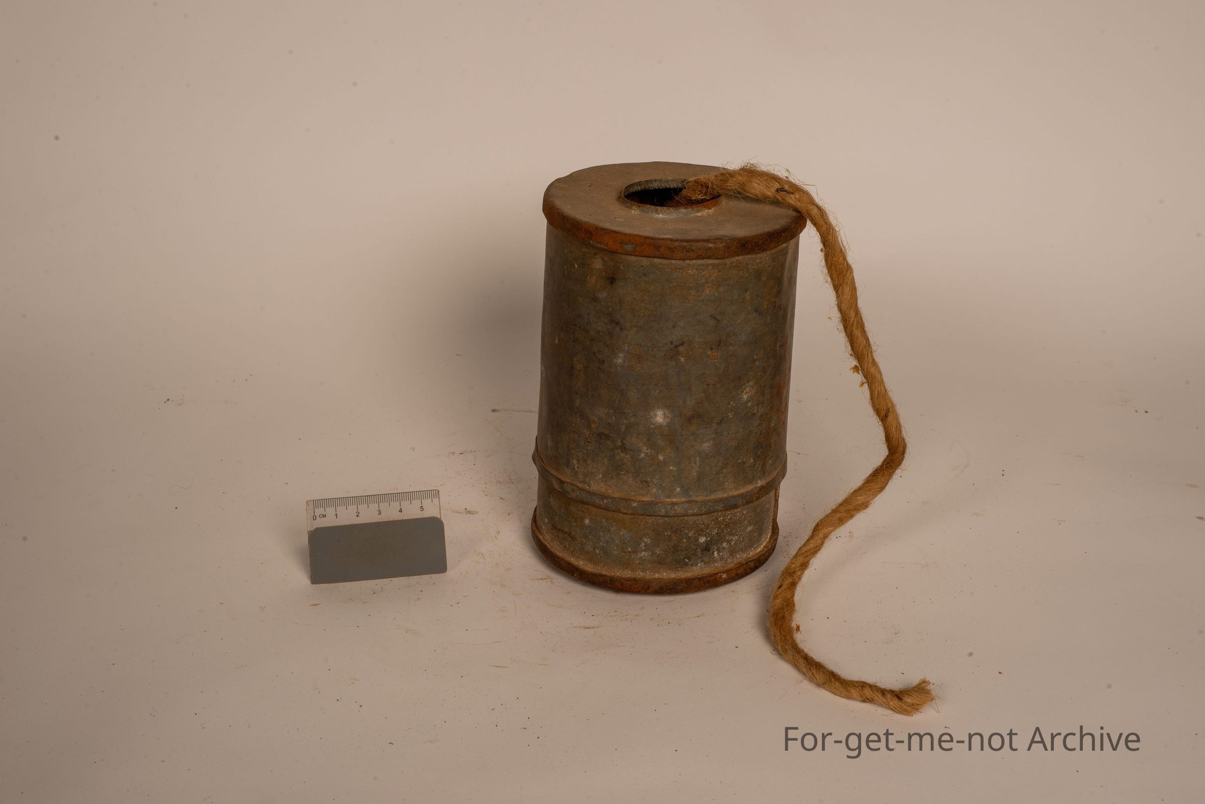 This is a string dispenser but for, like, heavy rope. This is a homemade canister with a hole in the top with a rolled edge so I don't continuously cut the string. The heavy rope is in a ball inside. Probably a depression era piece.Collection