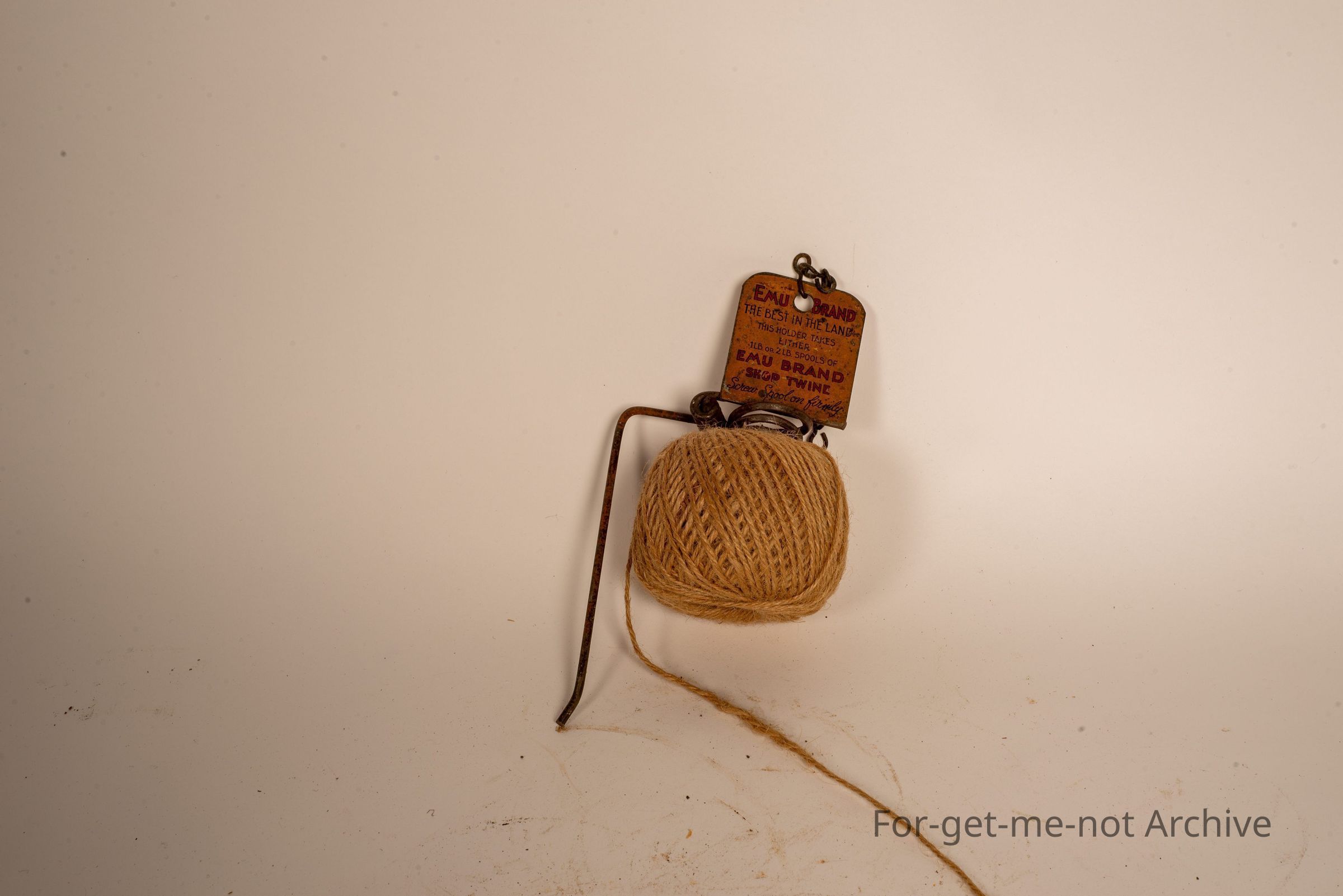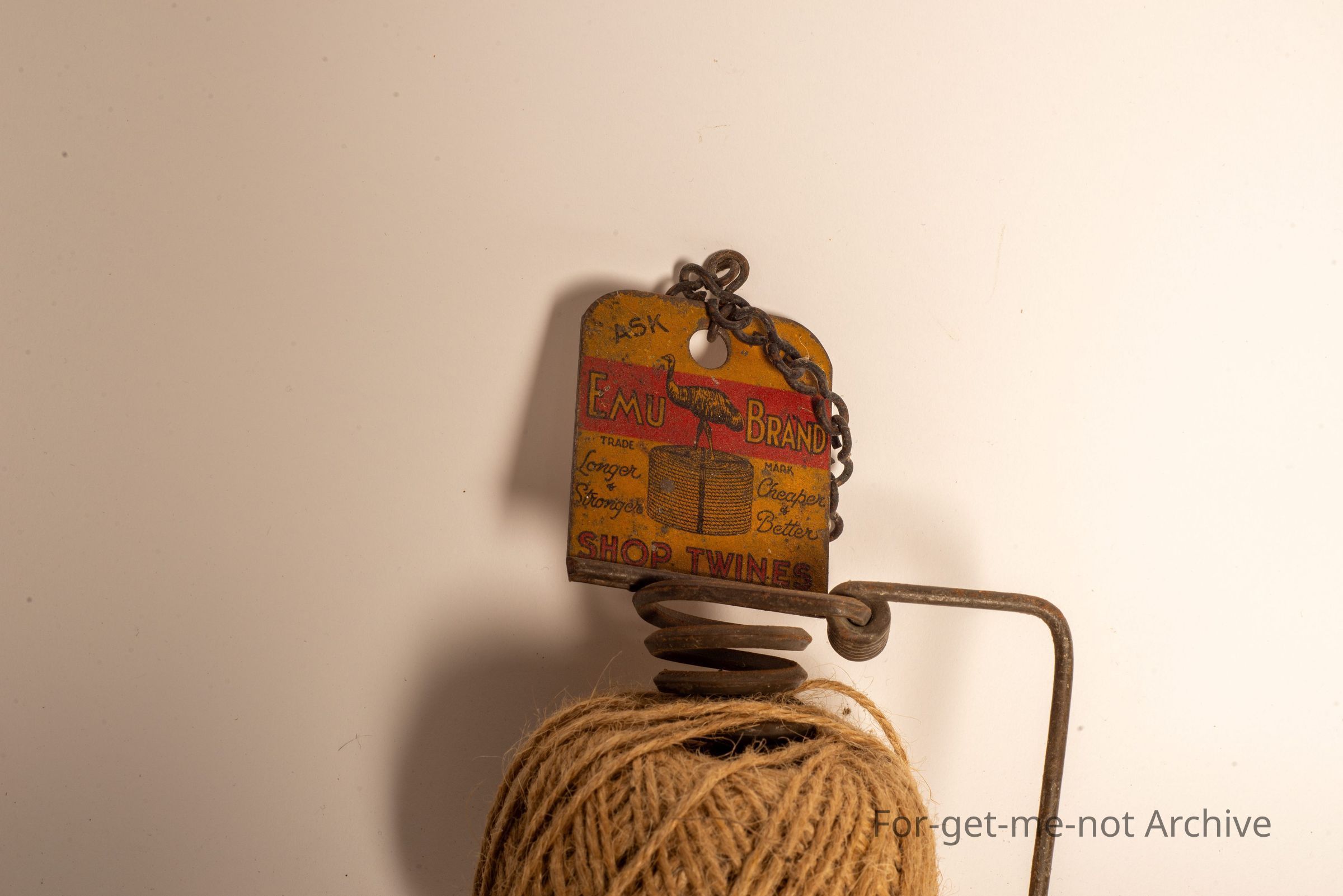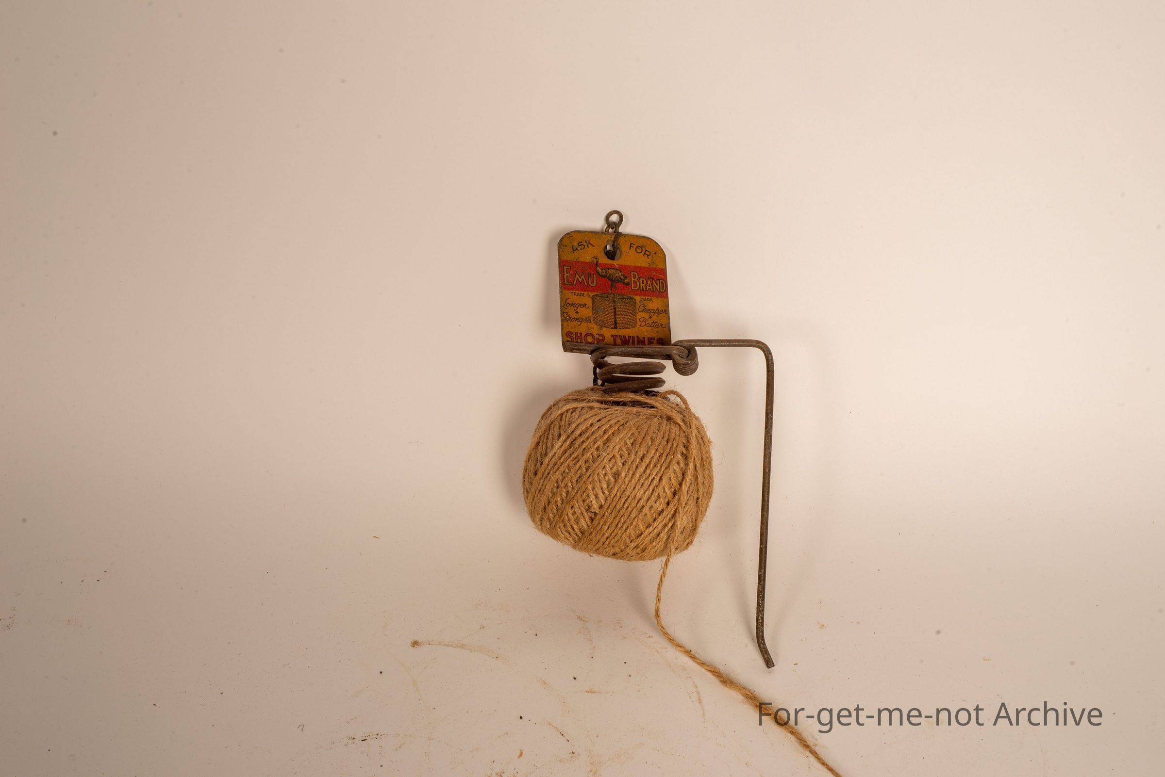 This is a little string dispenser with an advertising plaque for emu brand, twine and rope . Advertising both sides of it. Emblem of the emu from Kineers Rope