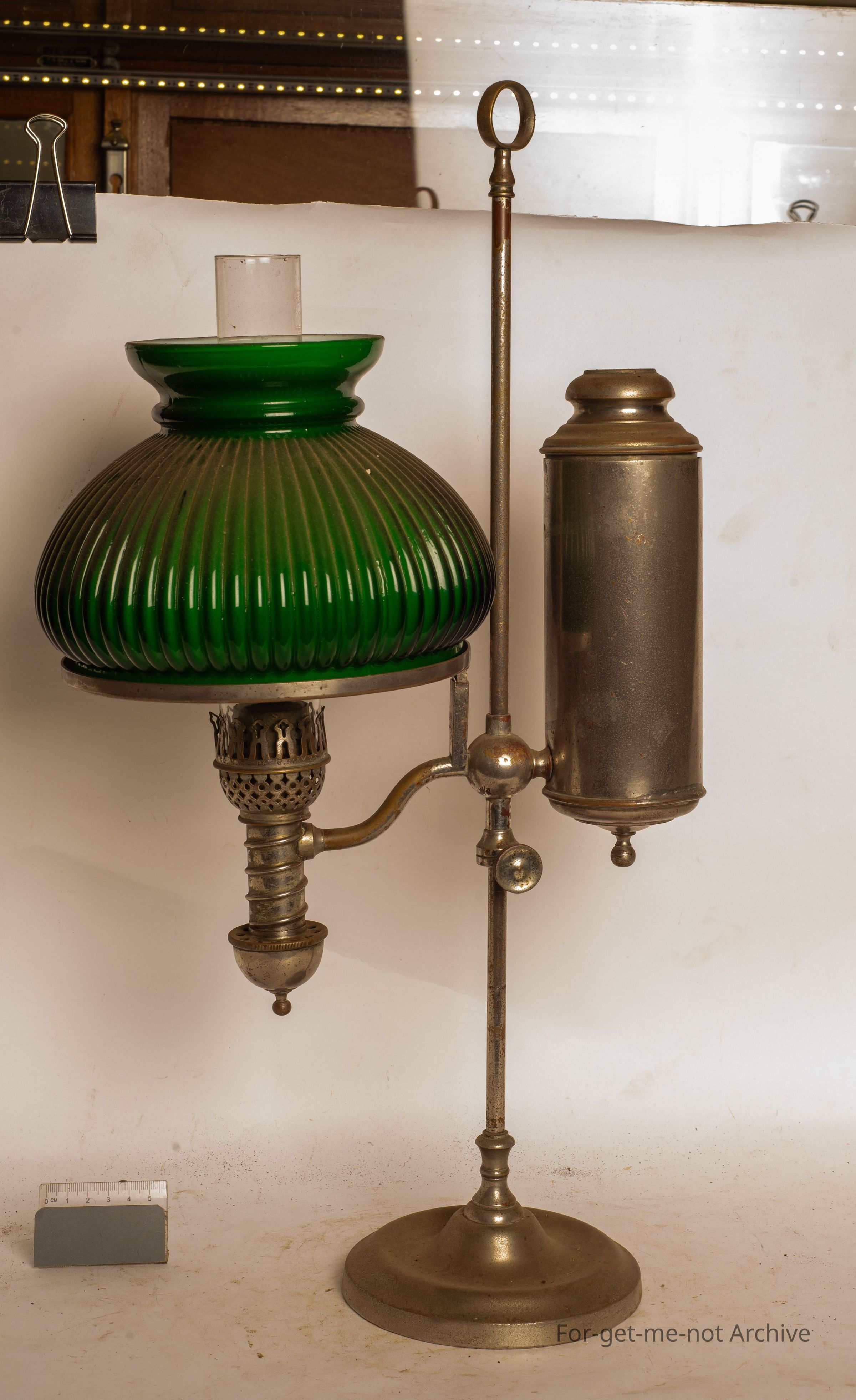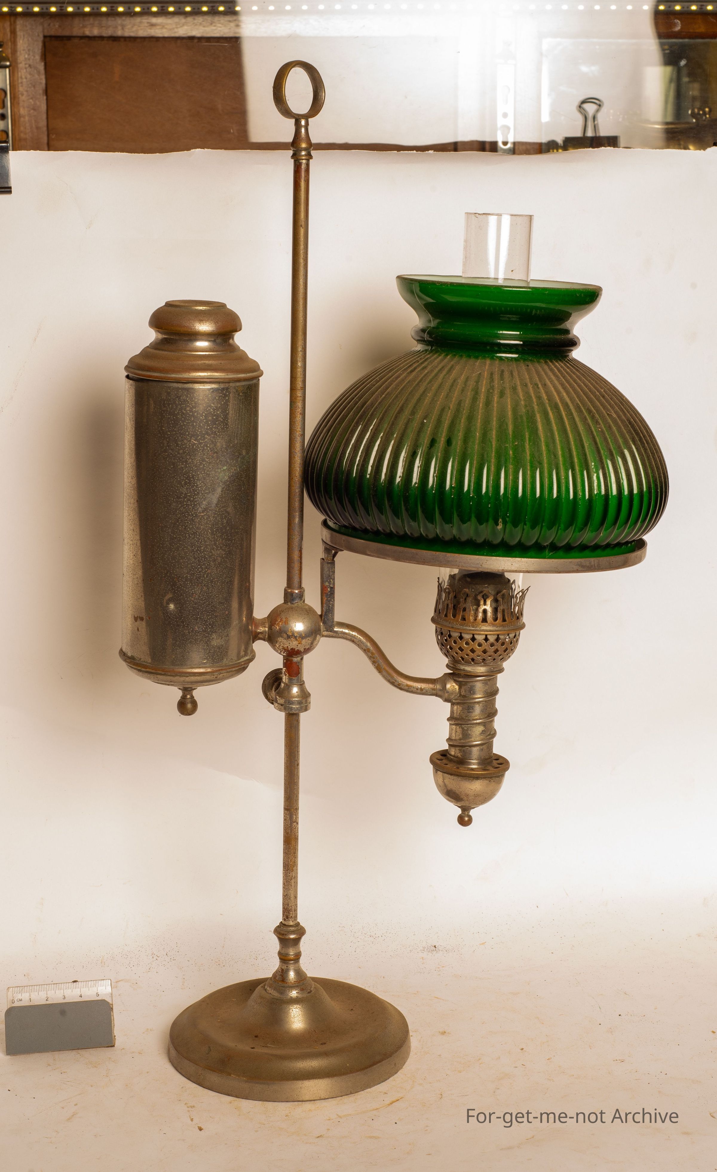 This is an American student lamp. Beautiful fluted green shade. Got the argand burner very early, very primitive. All complete, Usable condition. Quite an unusual piece to see altogether.Collection