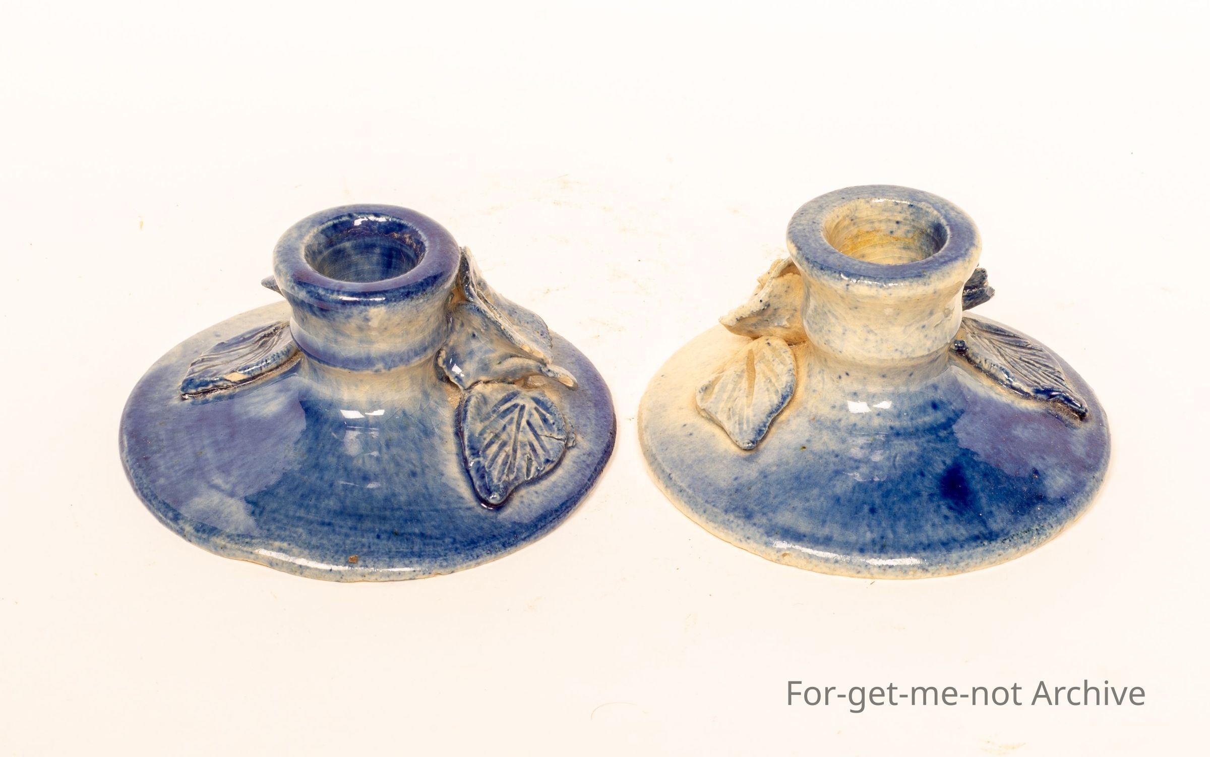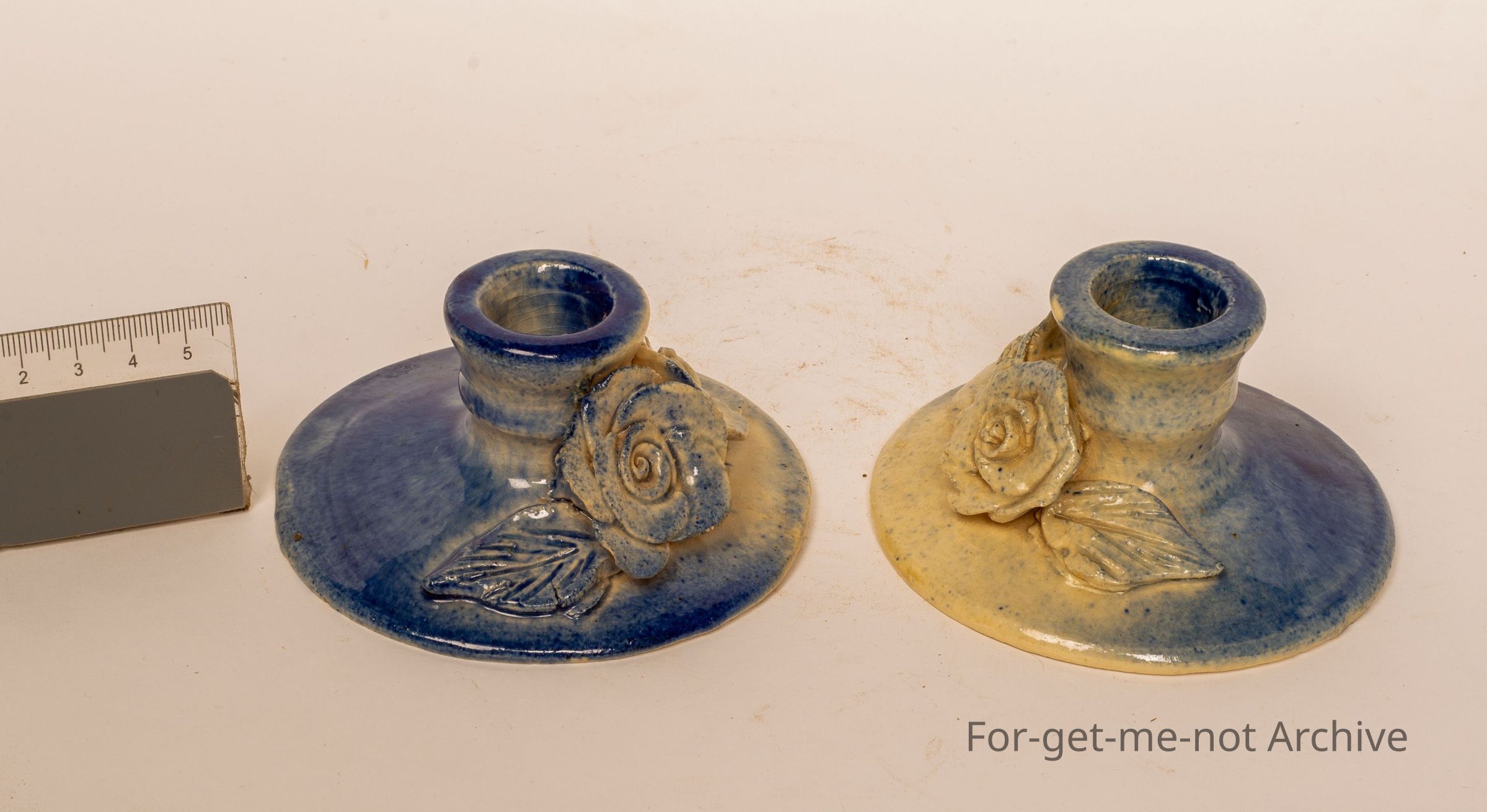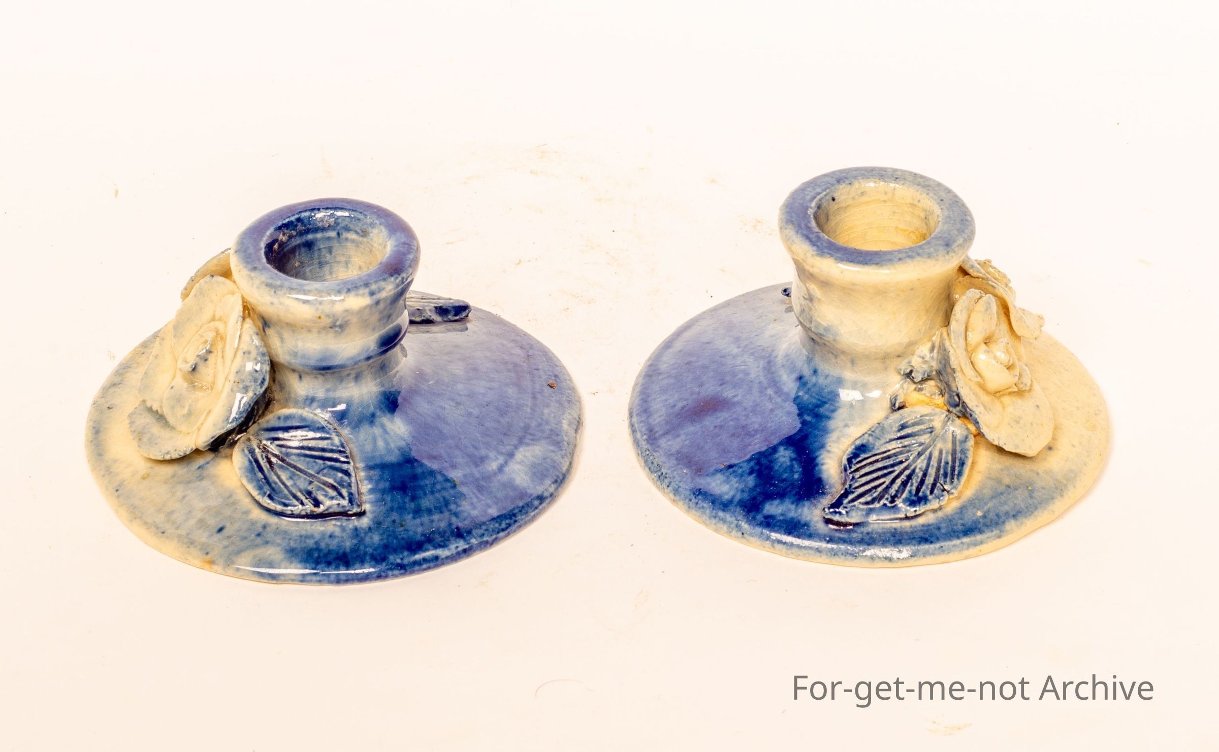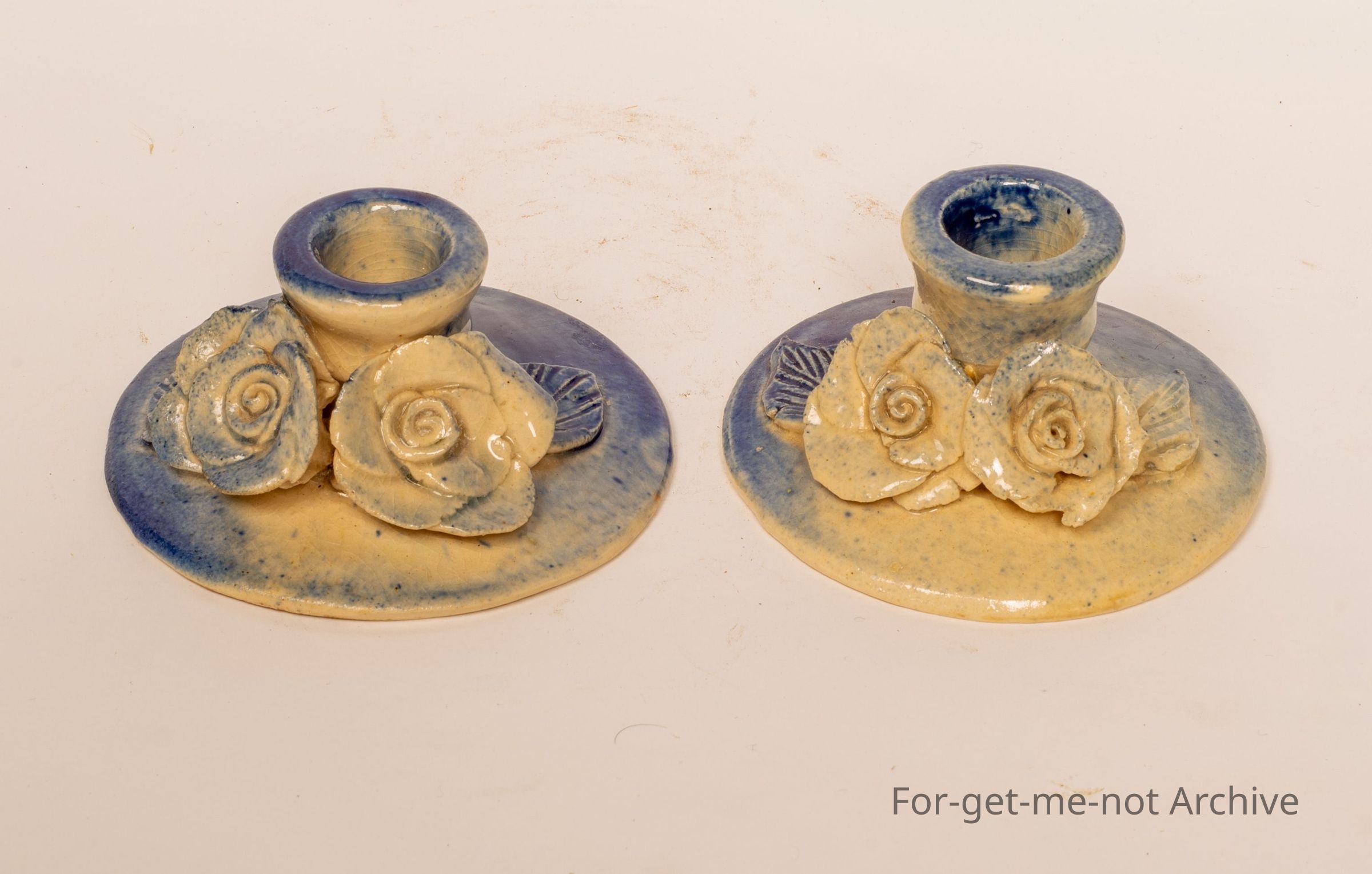 These are 2 delightful, squat little candle holders, quite a broad base decorated with flowers, could be roses, the fading light blue appearance. Signed on the back, Maisie Murphy. Murphy was an Adelaide potter, very collectible.