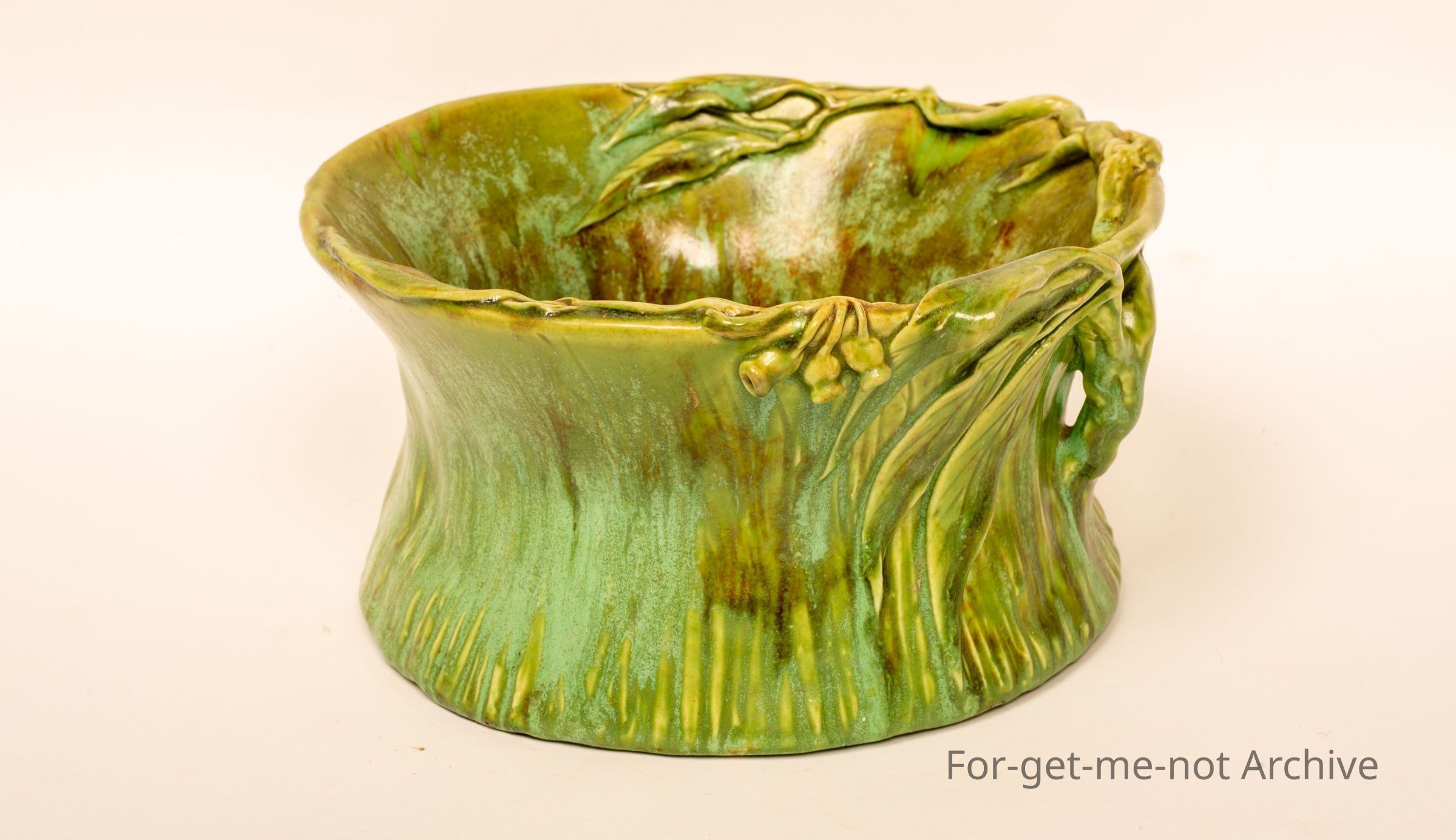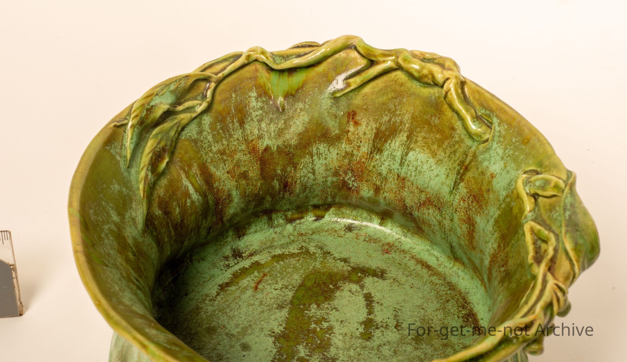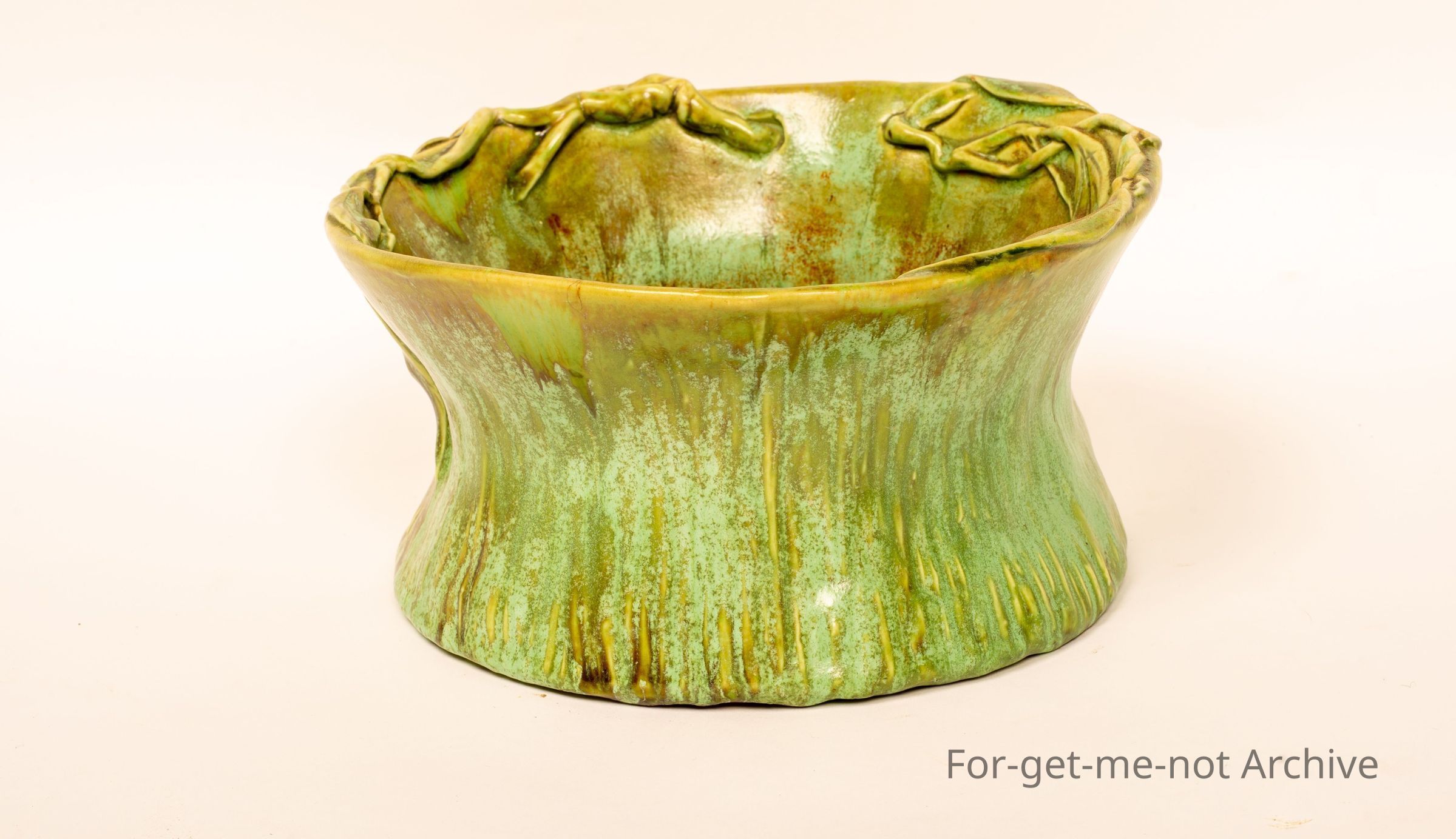 This is a large leafed bowl, green glaze, very decorative. Signed Eric Bryce Carter Sydney.