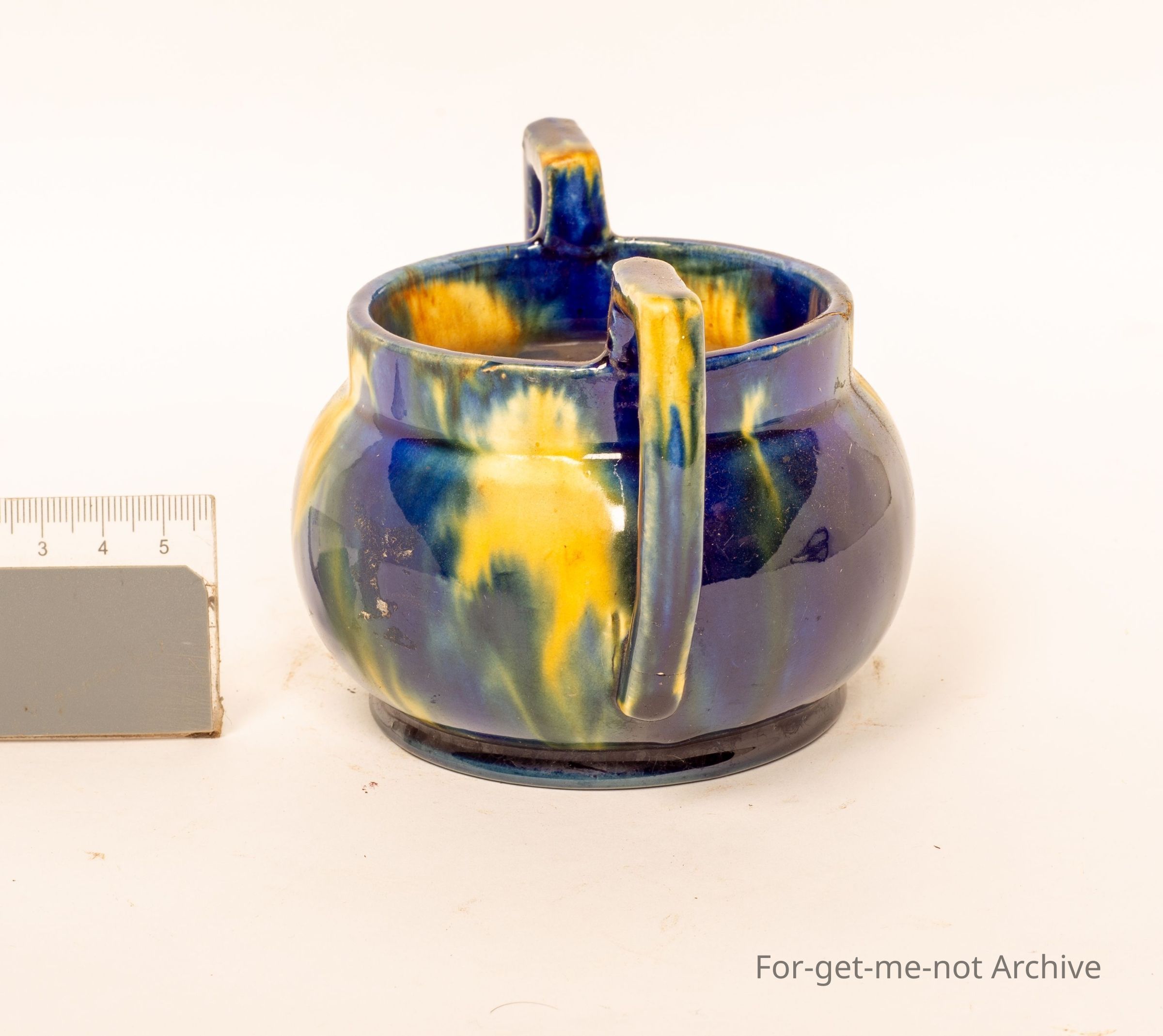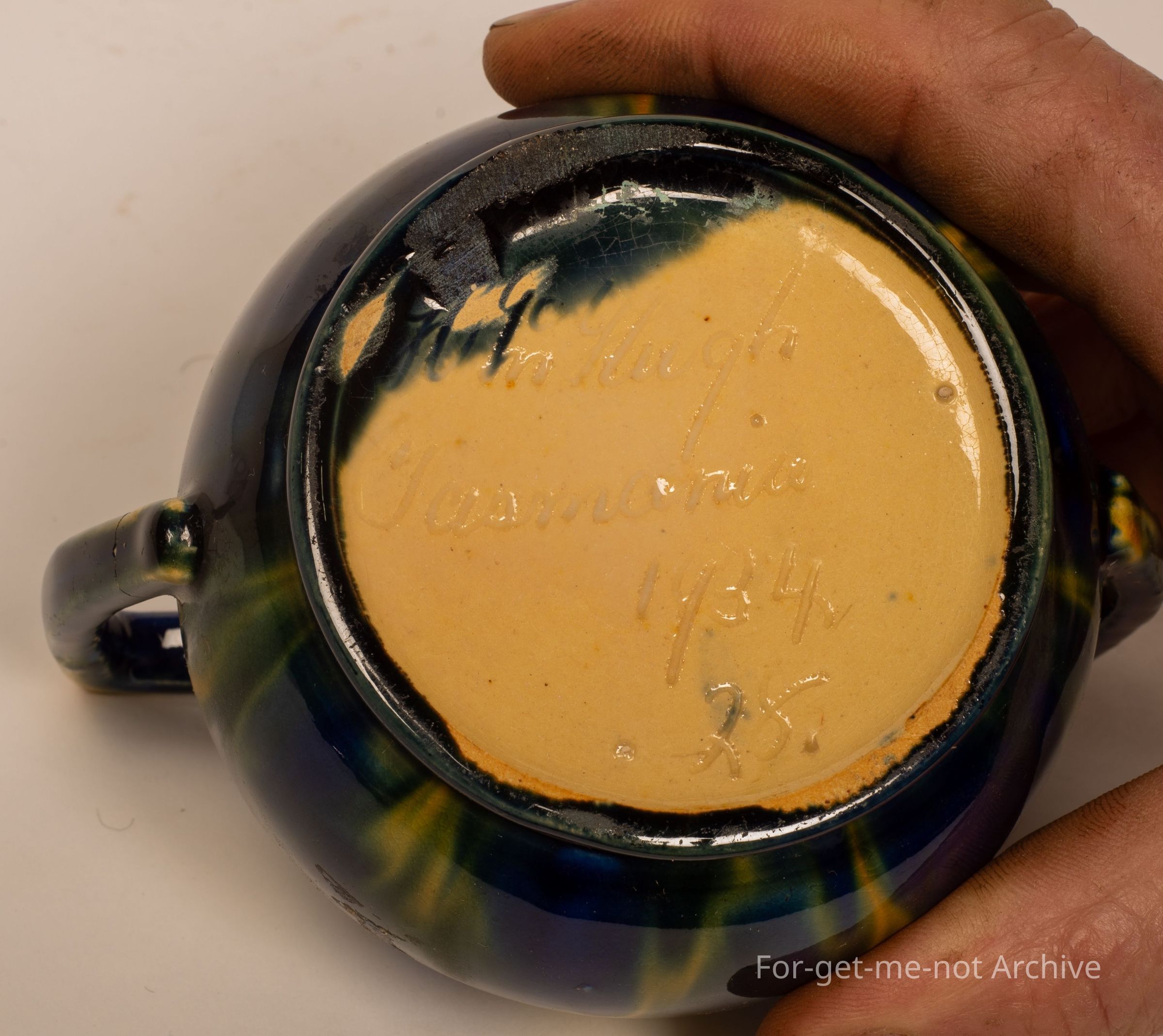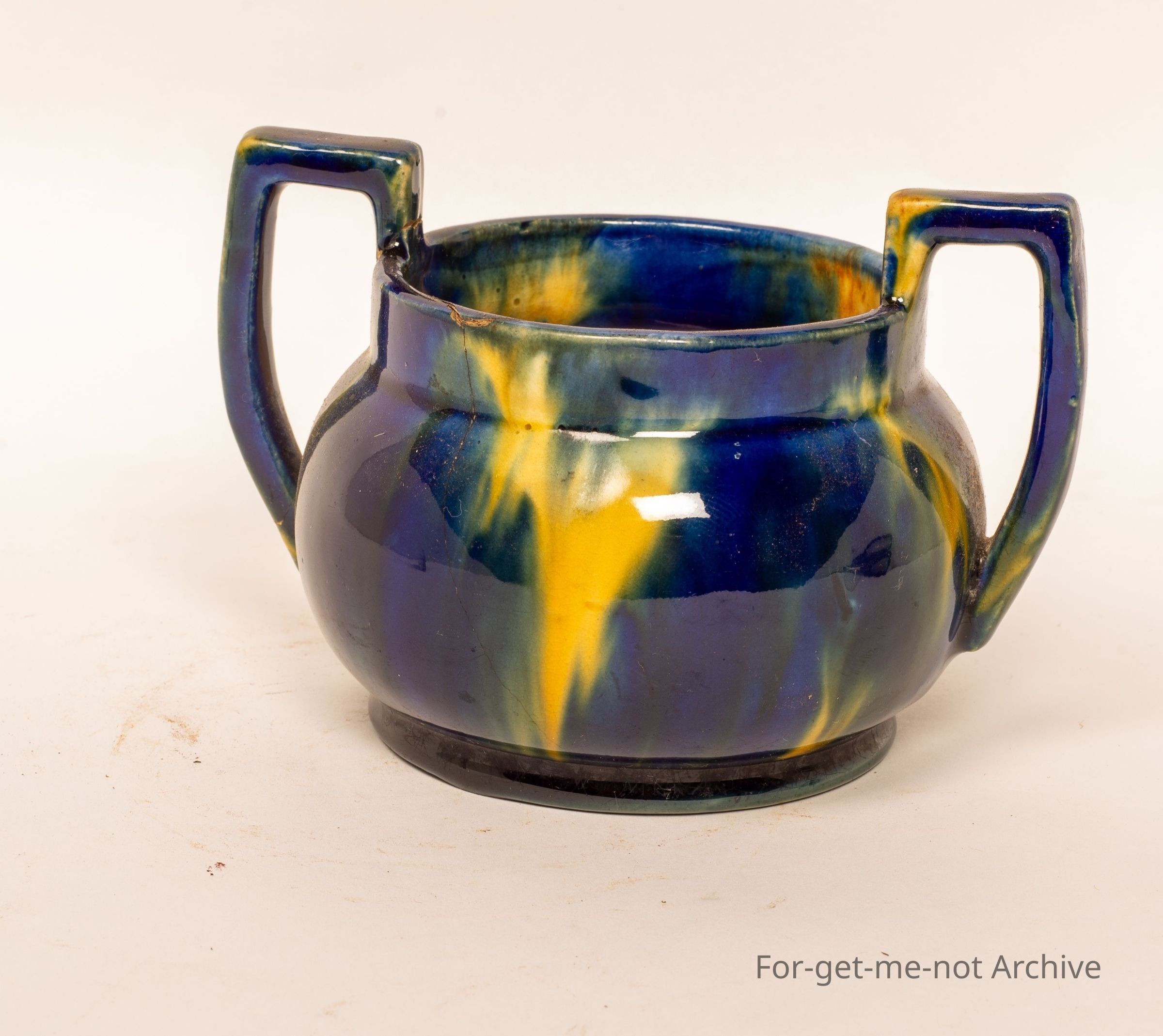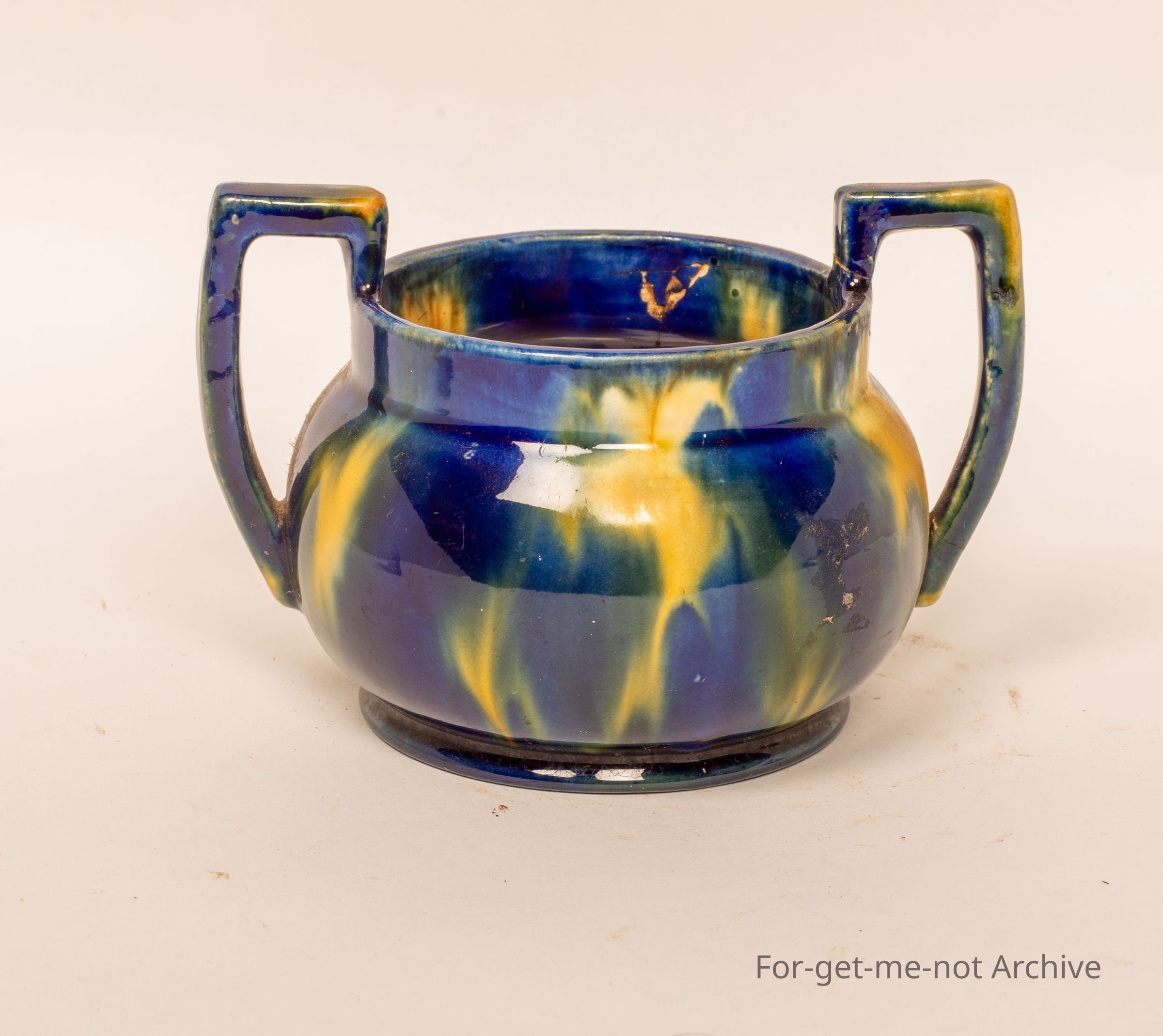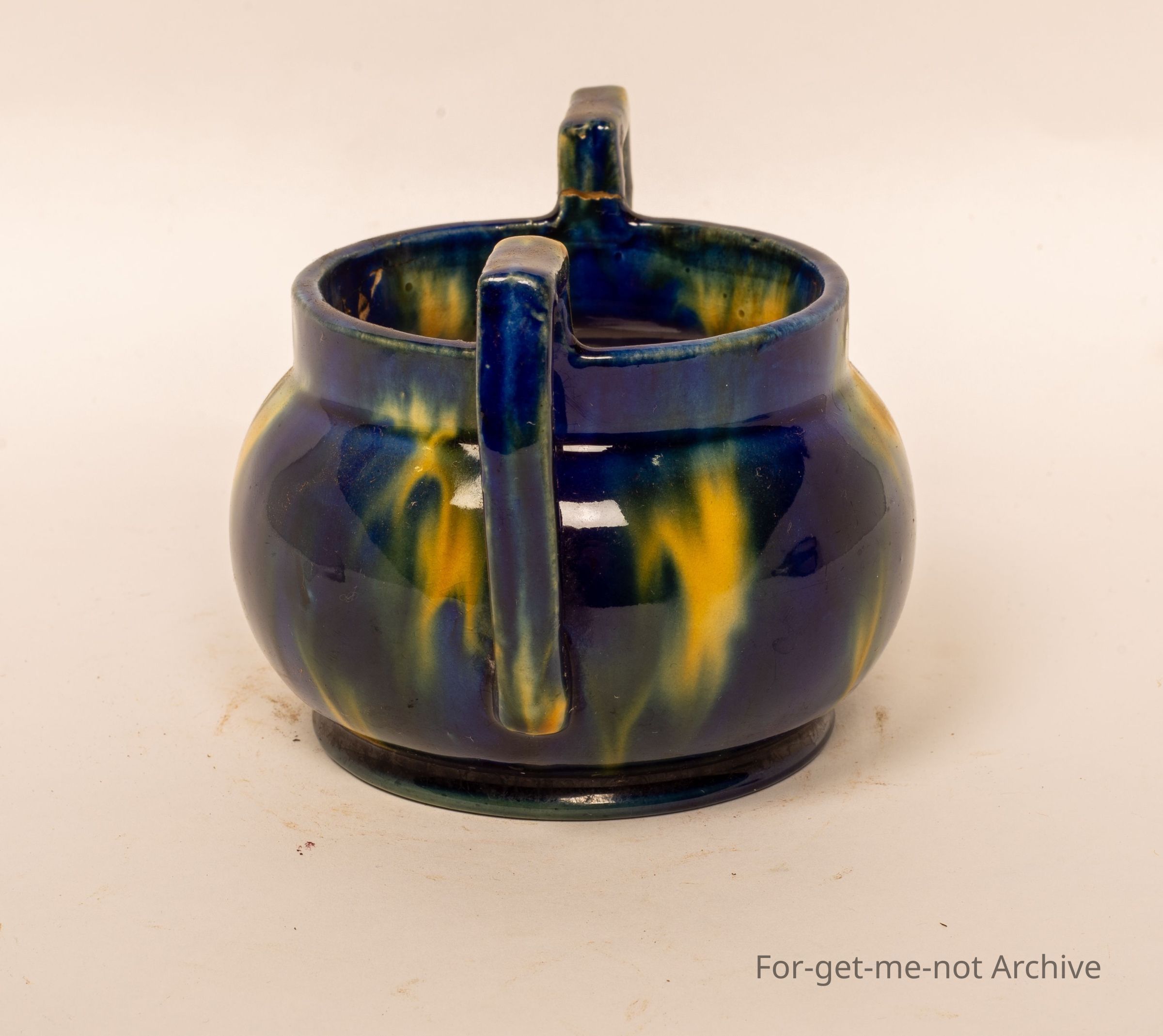 This is a small 2 handle vase. Classical McCue glaze, dark blue with cream blotches, signed on the base. McCue Tasmania.