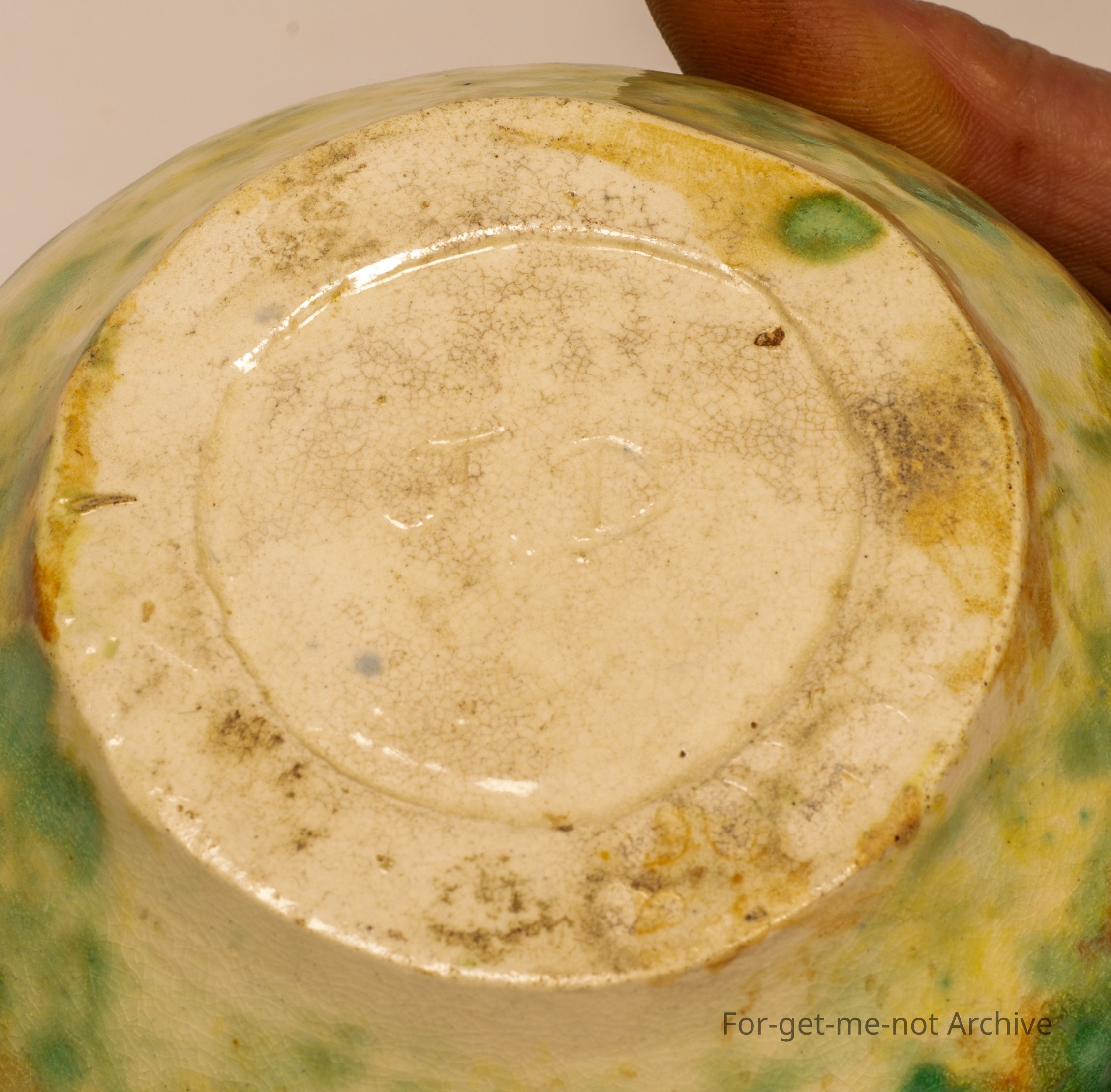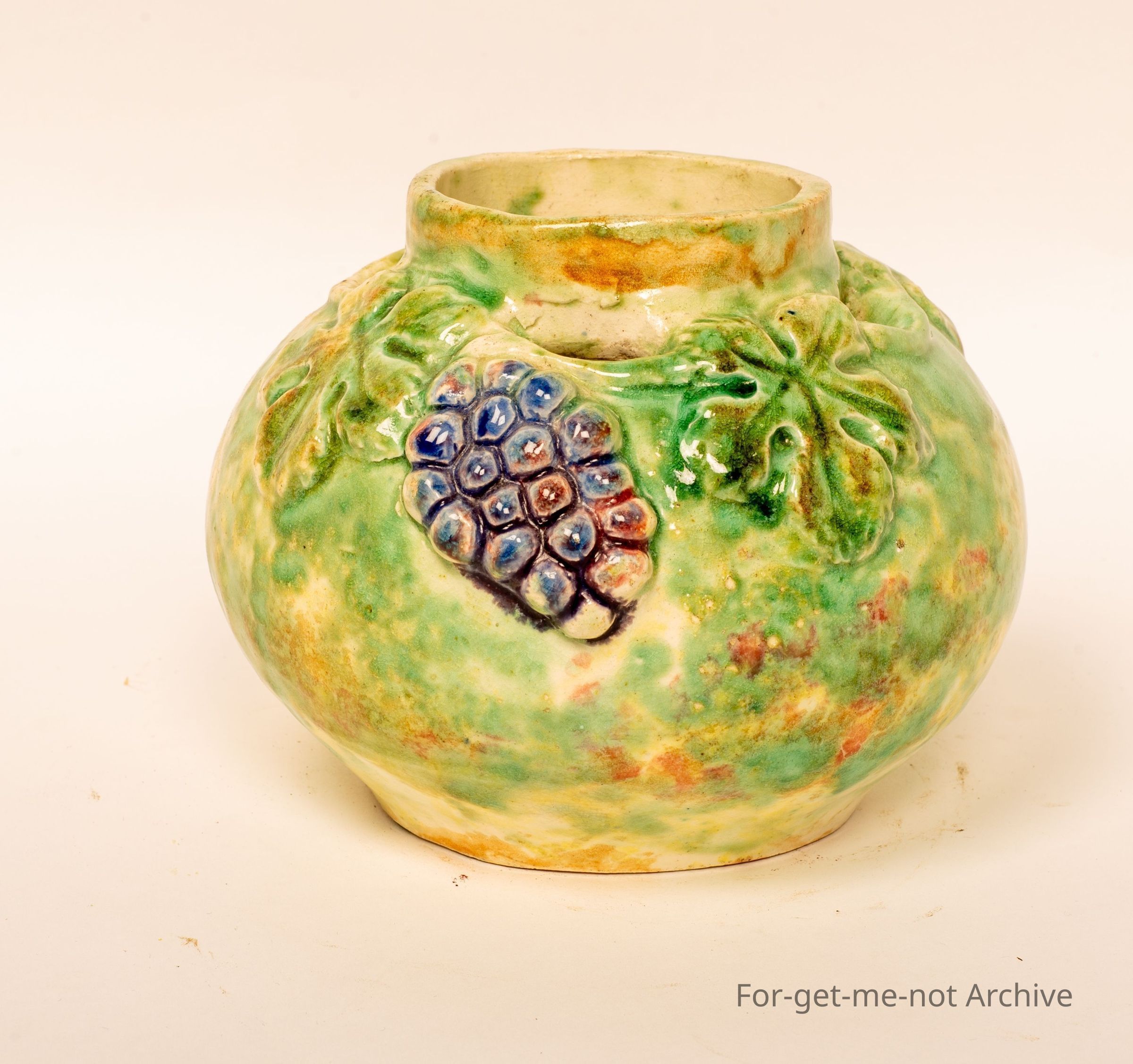 This is a small decorative vase, decorated with grape. A series of leaves surrounding the outer side, a light green glaze signed JD, who was a husband and wife, pair in in Adelaide that ran a pottery school.Collection