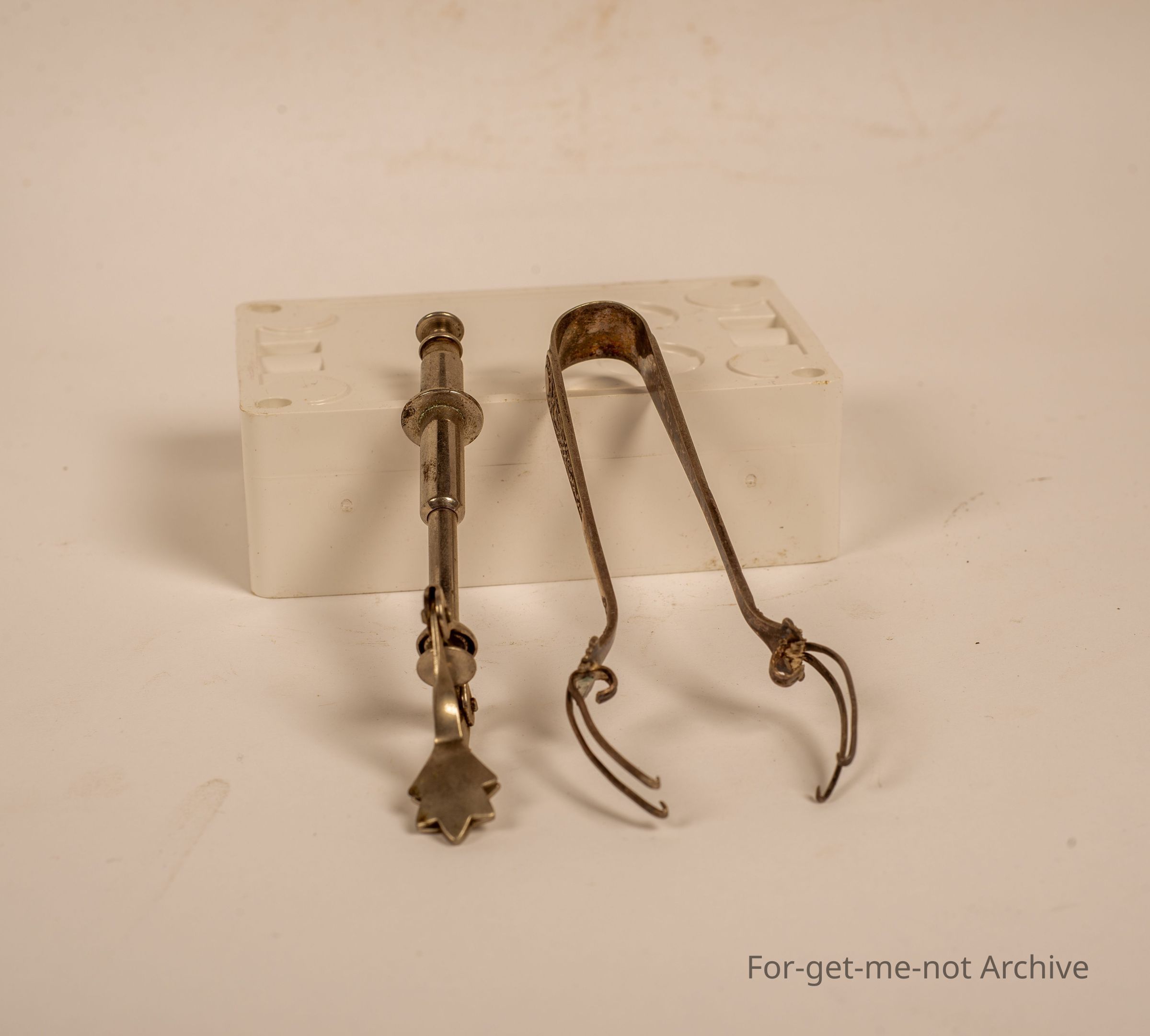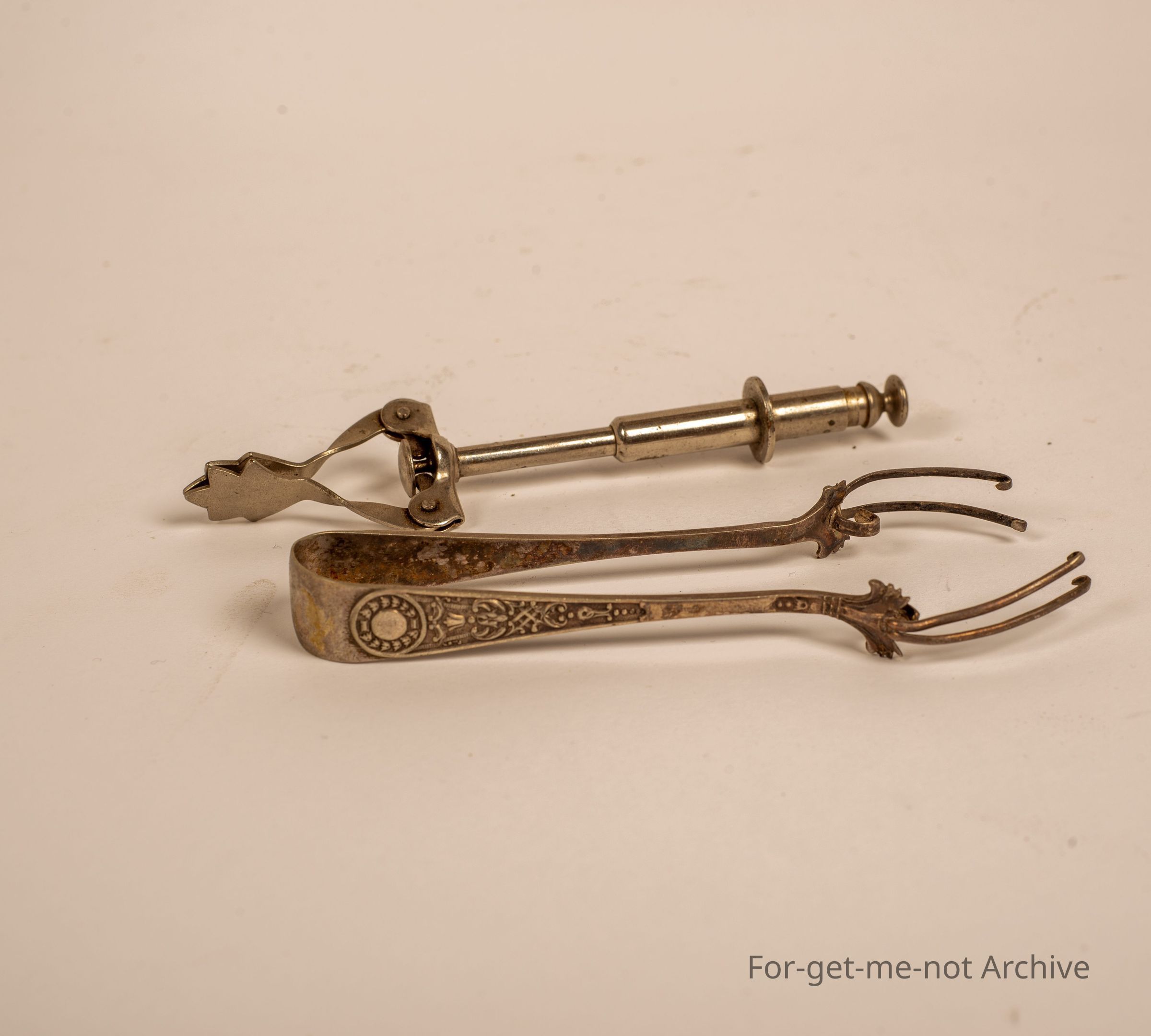 Pair of, electroplated sugar cube lifters. One operates off of spring and the other one is hand operated.