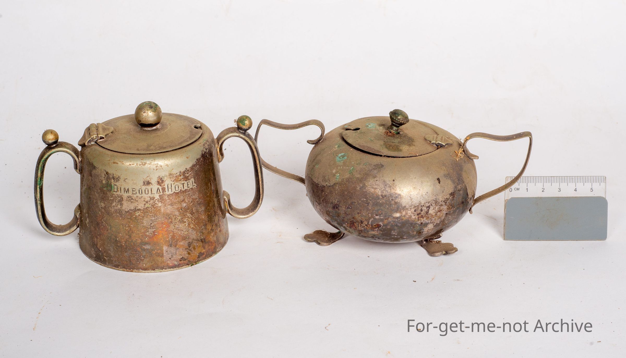 This is a sugar pot, Plated silver, engraved Dimboola hotel in lovely order. Pretty tarnished but still quaint. The second piece is another sugar pot. This one is a more circular one. No engraving, quite lightly madeCollection
