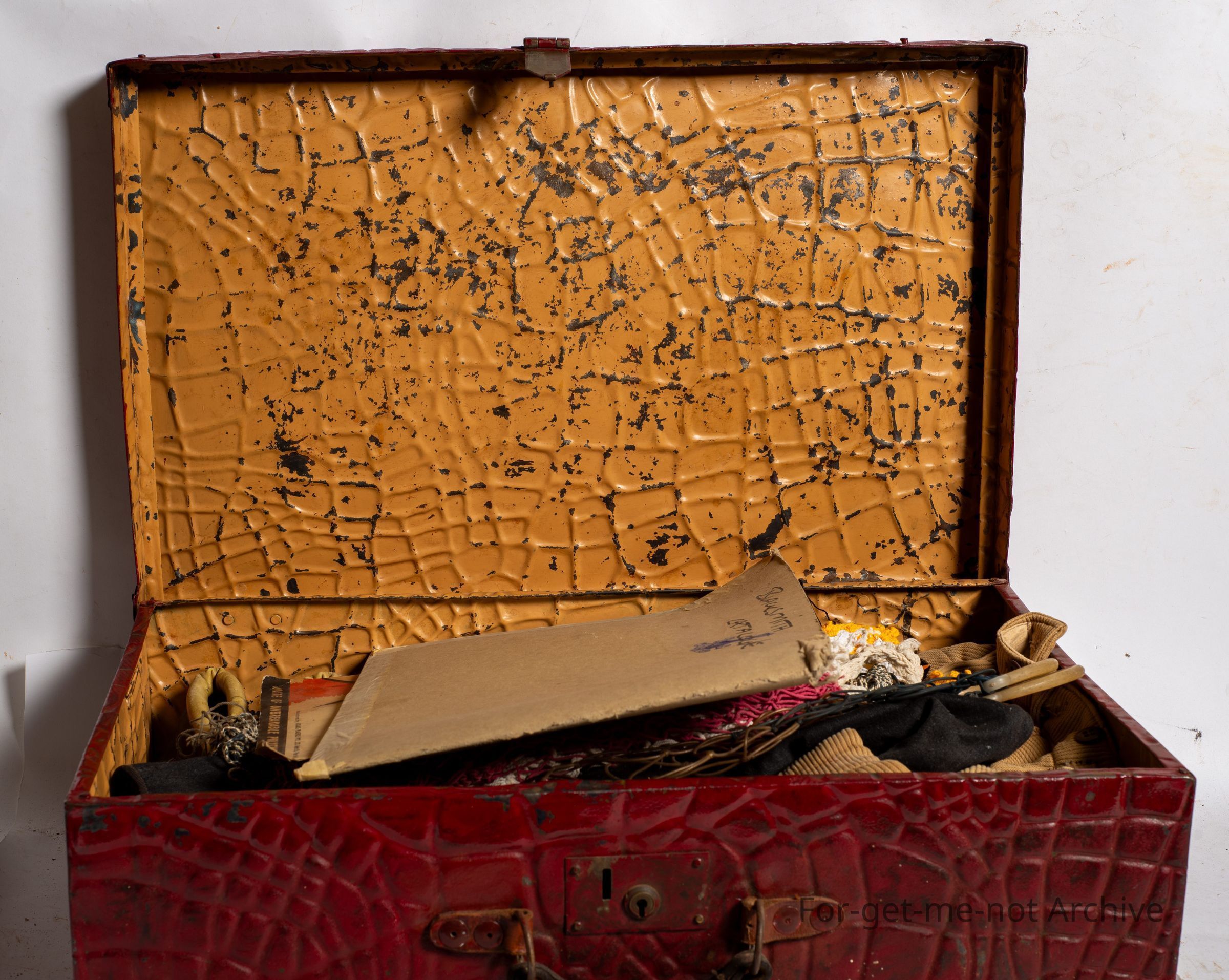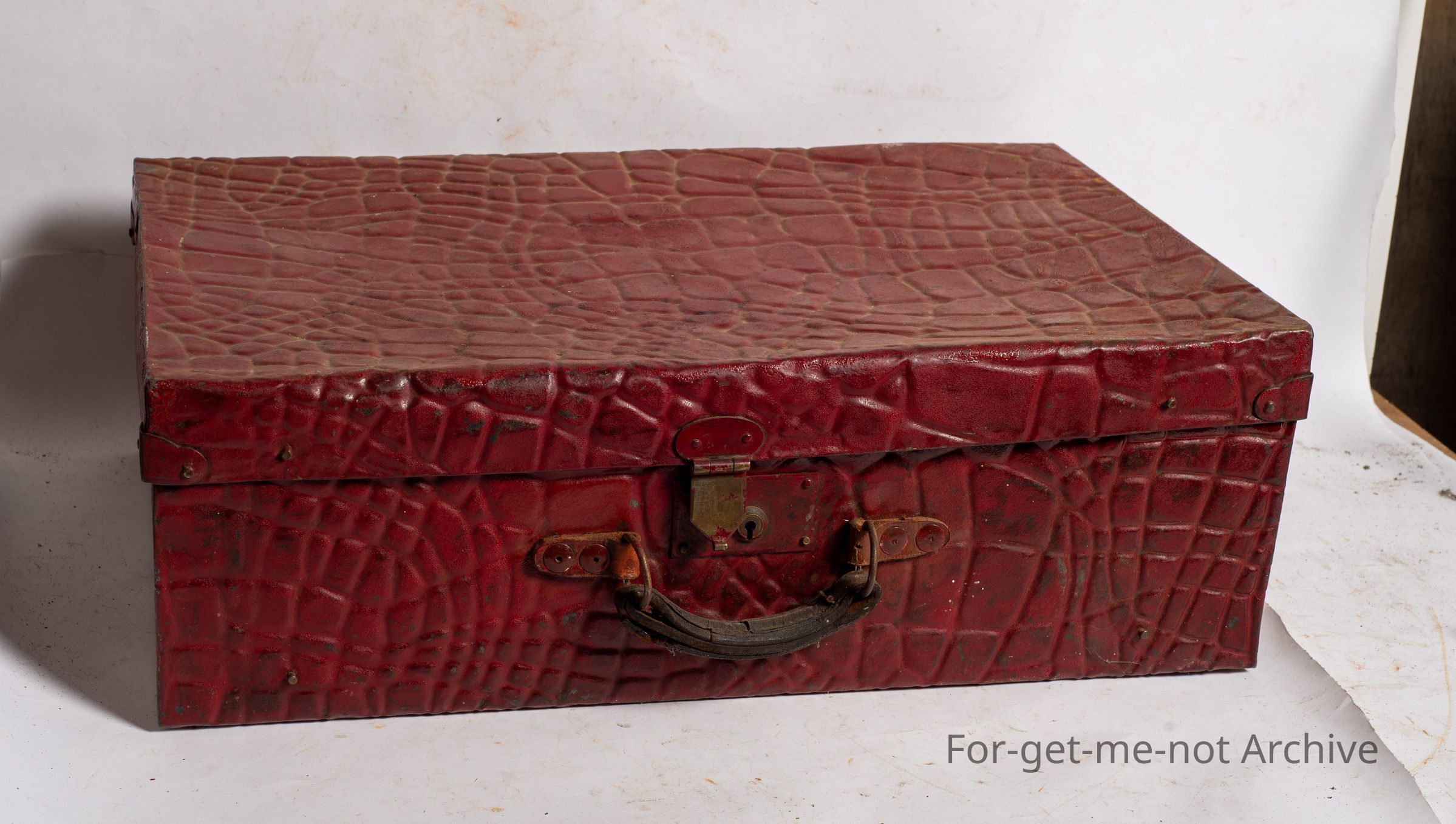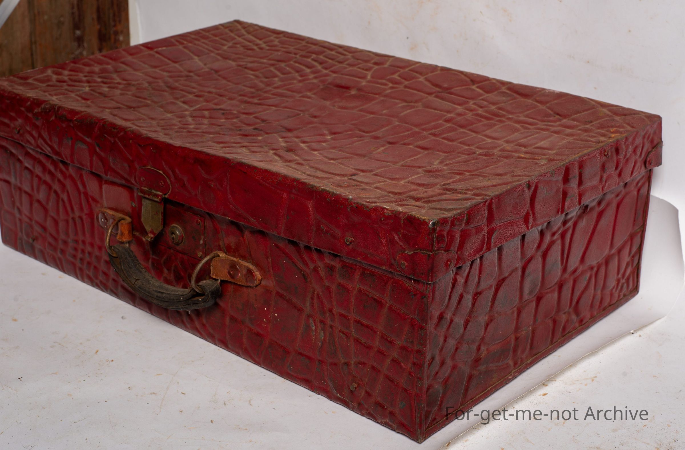This is a tin suitcase of press metal, which gives the impression that it could be crocodile skin. Quite cleverly done. Quite an attractive thing. The contents of the case are some old clothing.Collection