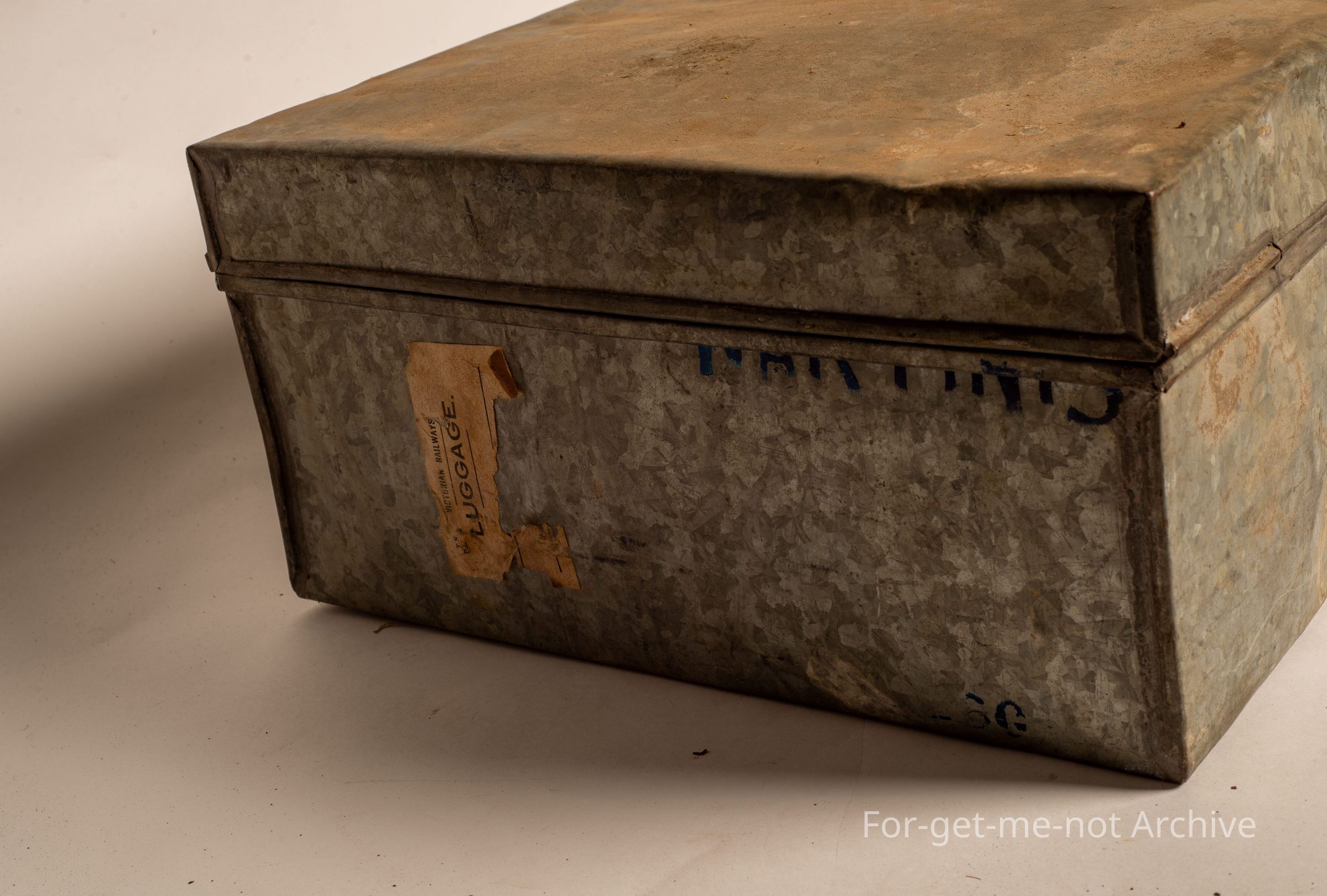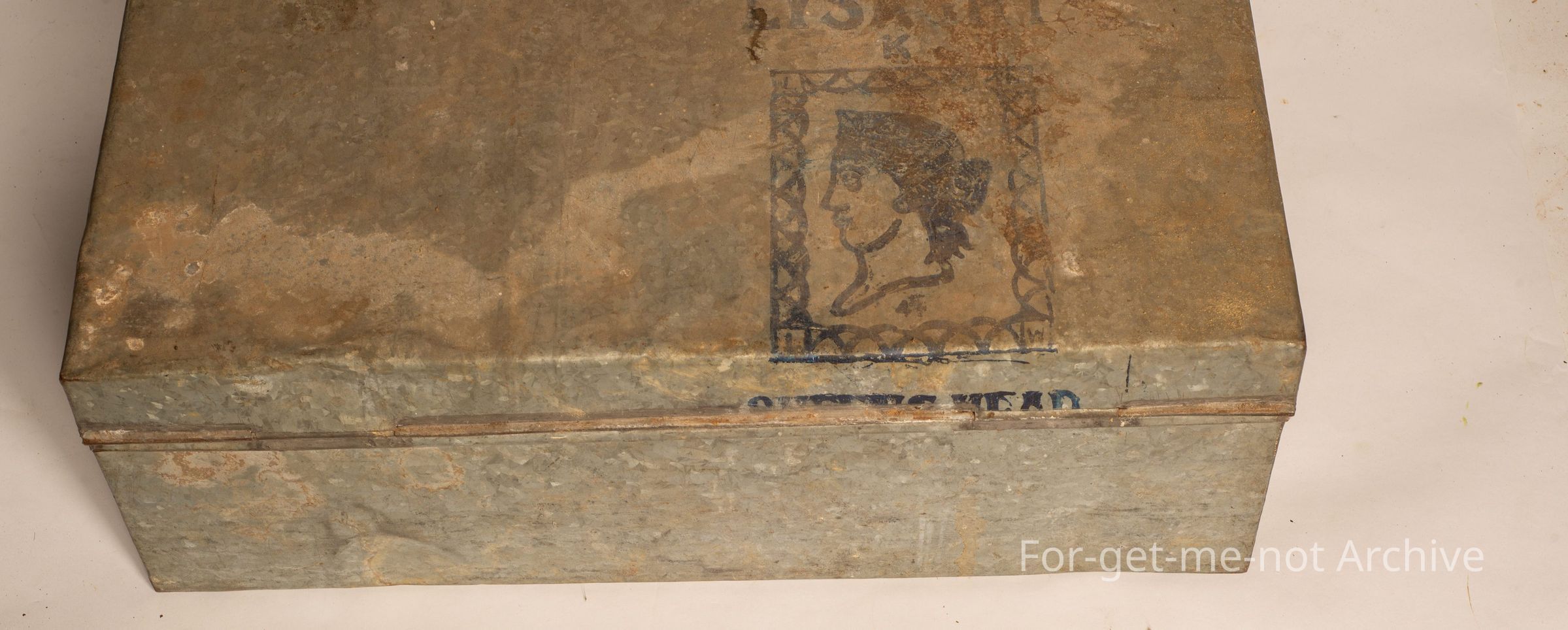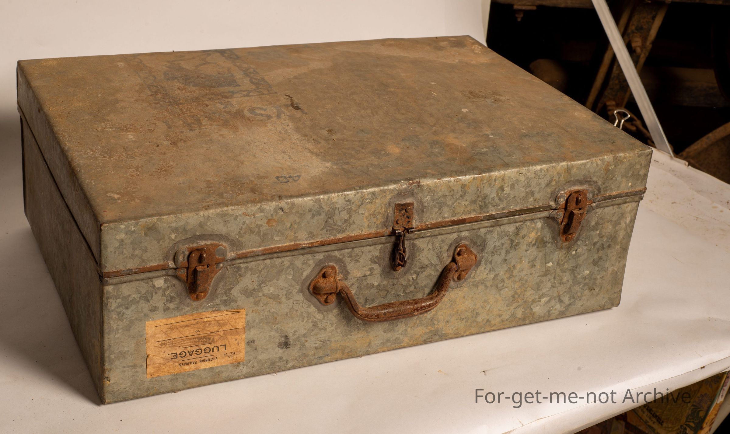 This is a beautiful, improvised suitcase made of galvanized tin. It has the Lysaght, stencil on the lid with the Queen Victoria head. Also has luggage labels, from an earlier trip stuck to it.Collection