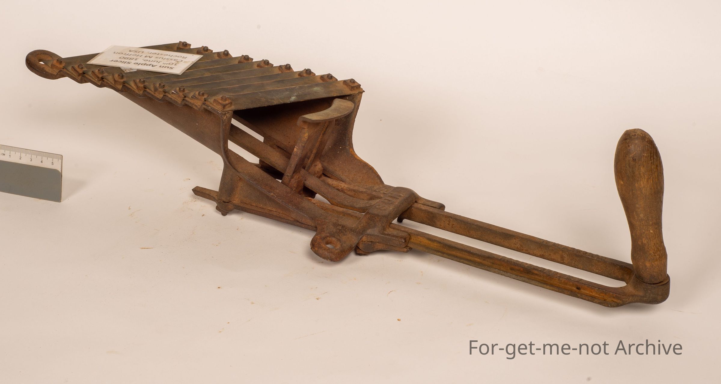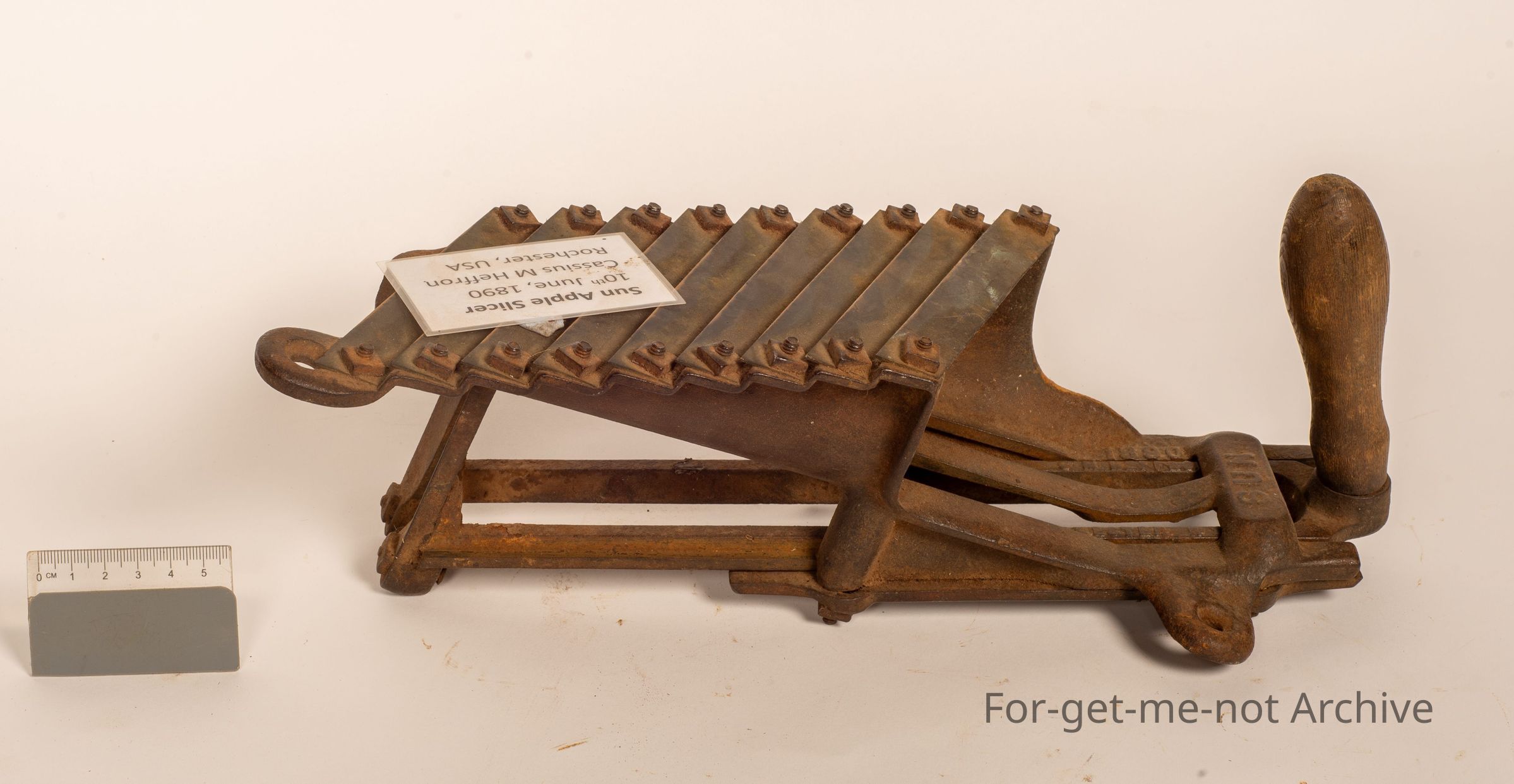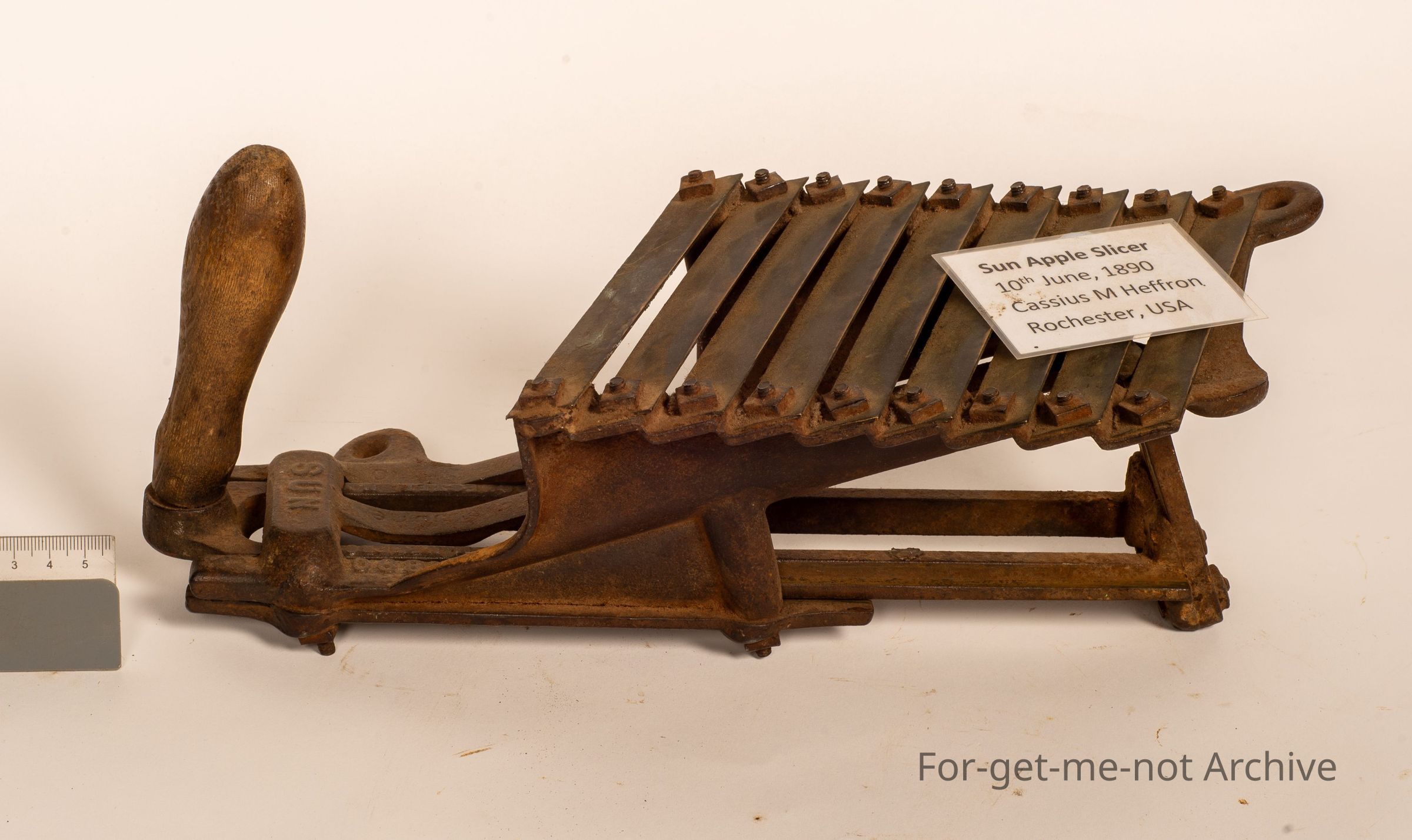 This is the Sun Apple Slicer made by Cassius M Heffman, Rochester USA, 1890. Hand operated, a range of slices. The apple is put in the top and the handle pushes the, plunger pushes the apple through the slices, and they fall out the bottom. This is quite a rare piece, not many of them about.Collection