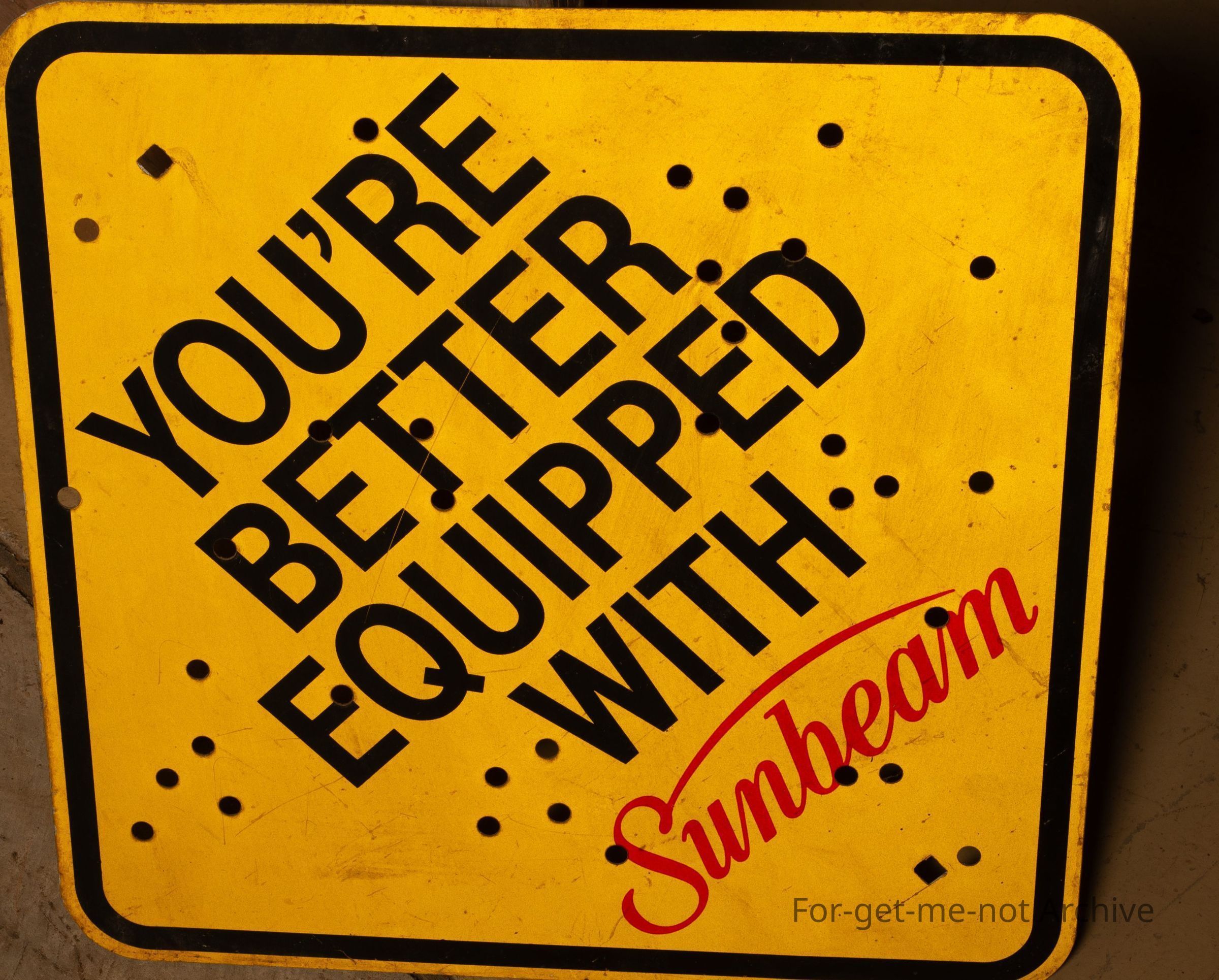 This is a diamond shaped sign put out by Sunbeam Shearing Equipment. We are better equipped with Sunbeam. It's made to depict bullet holes scattered through it. This caused a lot of uproar at the time for it was seen to be promoting roadside vandalism of signs. The advertising promotion was soon withdrawn so this sign is hard to findCollection