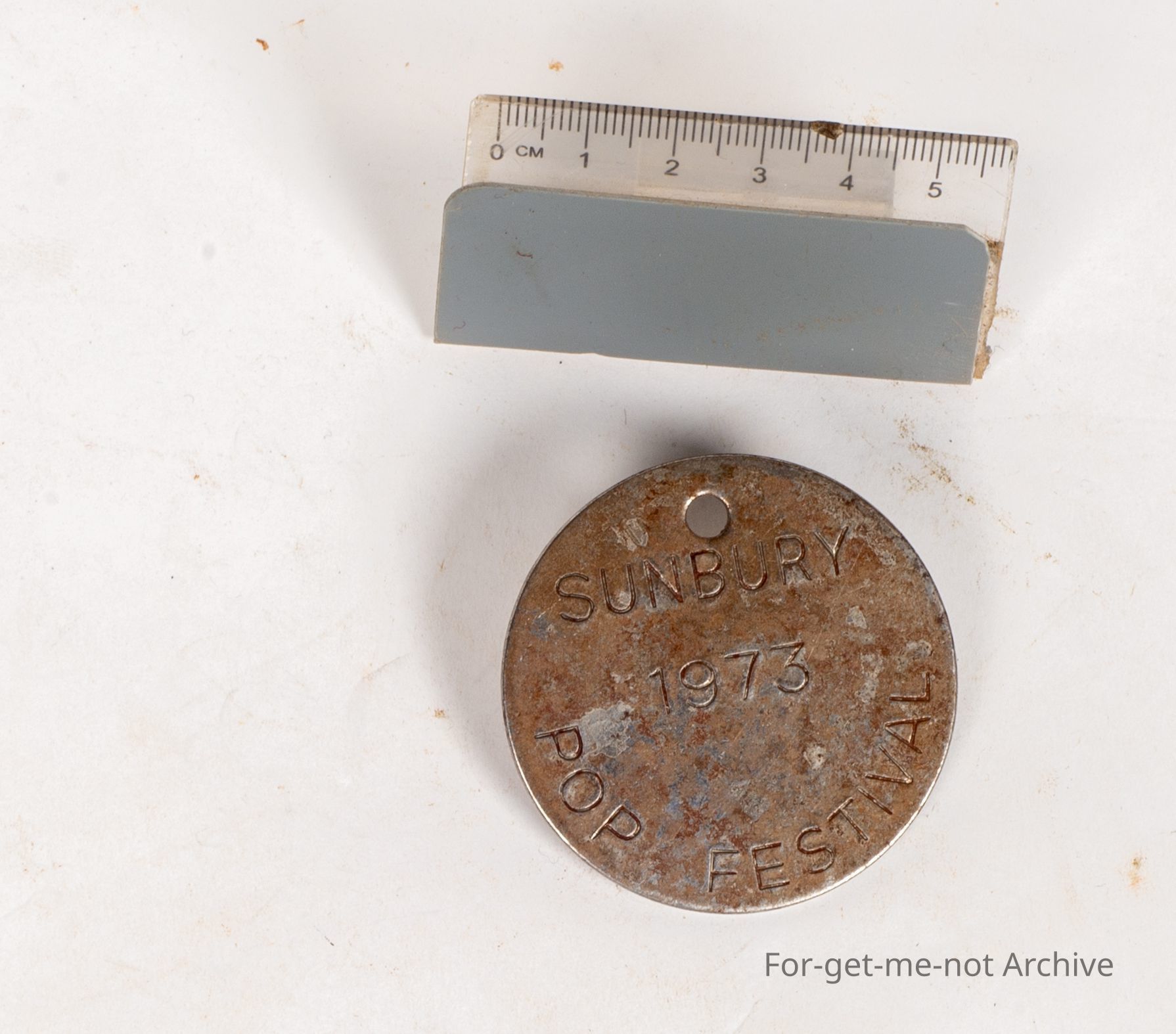 This is the metal disc that was issued as a pass out tag from the 1973 Sunbury Pop Festival. Very important. Great memories.