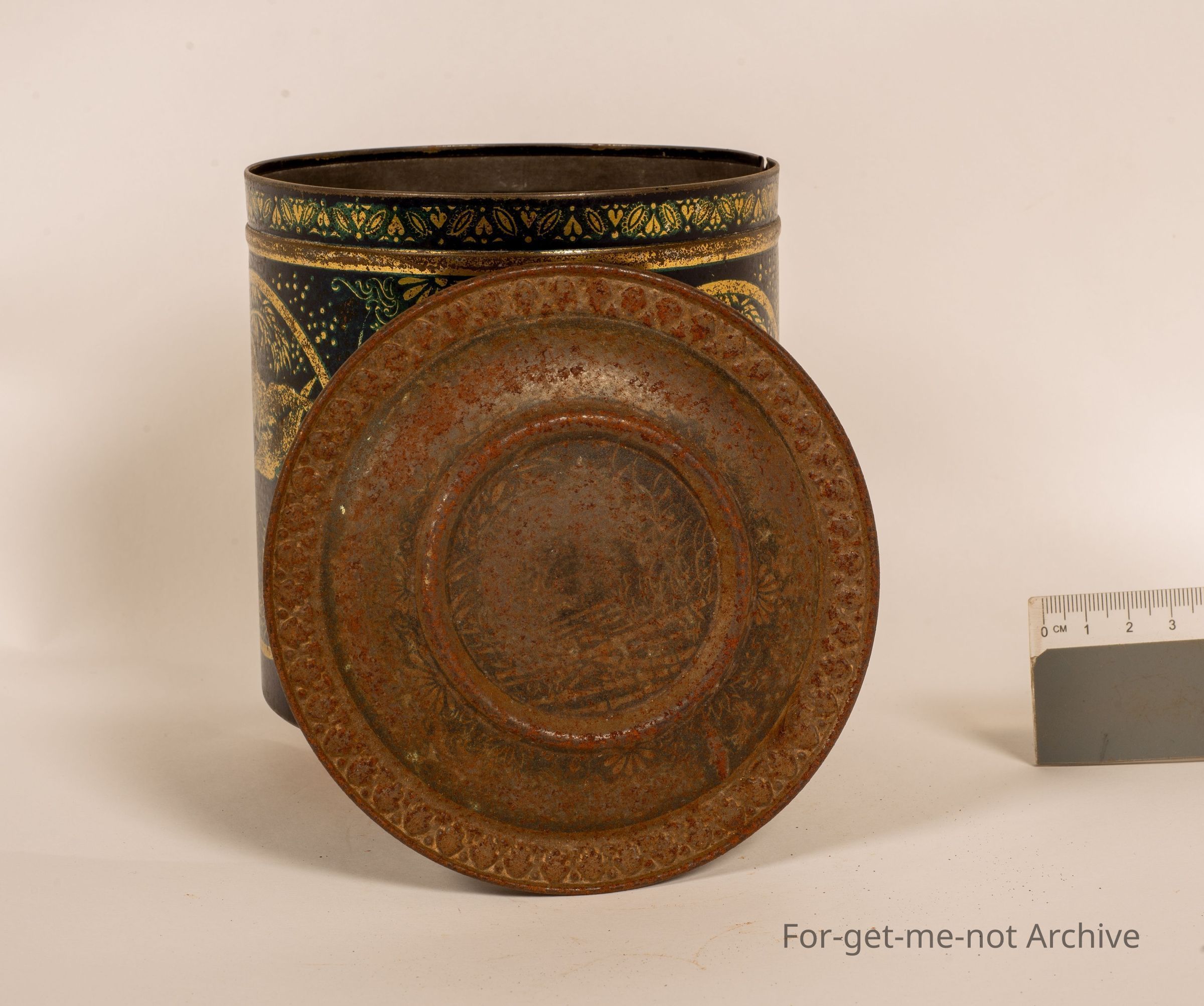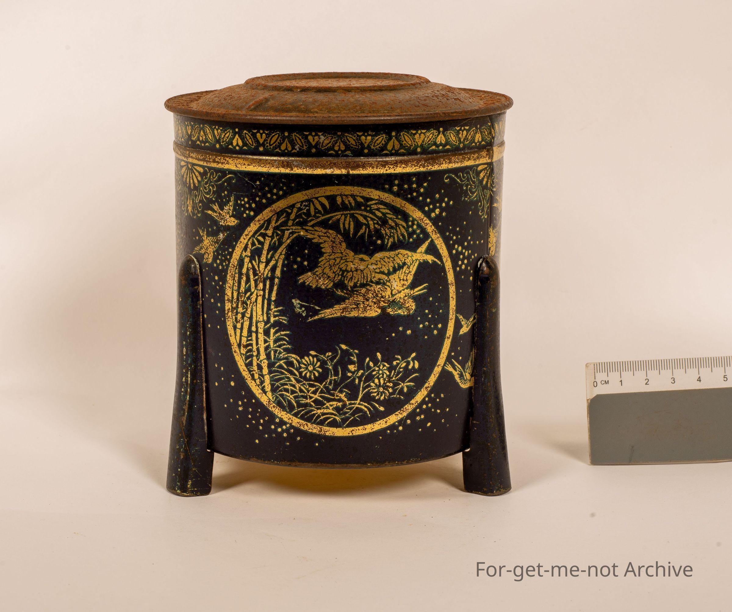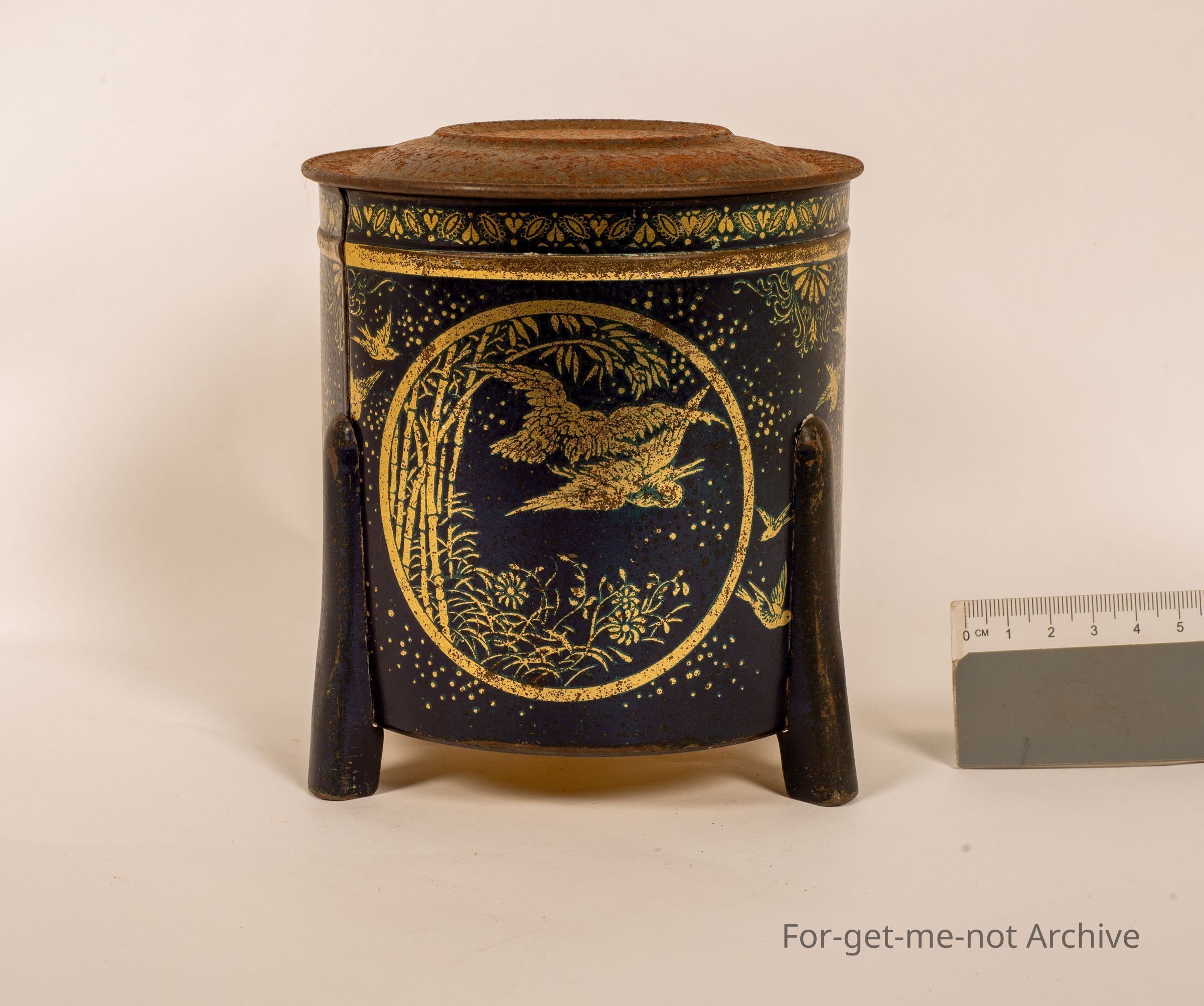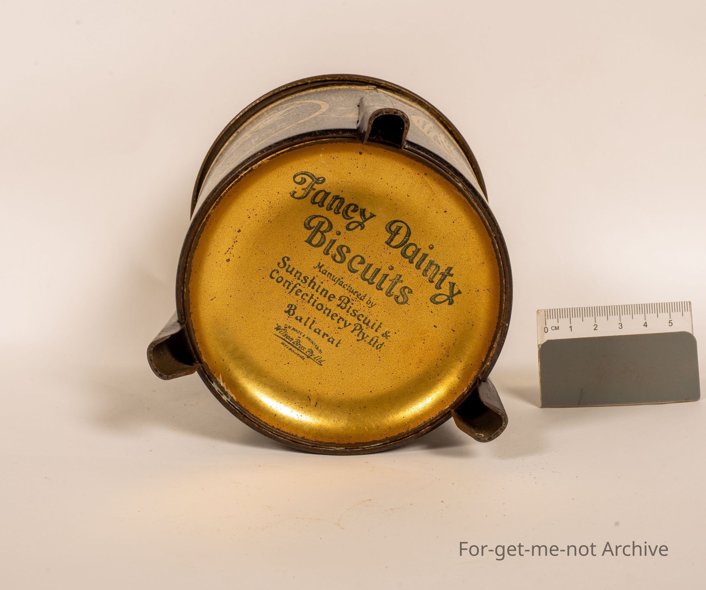 Biscuit tin. This is a little squat biscuit tin on 3 legs stamped on the bat bottom. Fancy Dainty Biscuits manufactured by Sunshine Biscuit and Confectionery Ballarat Victoria. This tint is made by Wilson Brothers North Melbourne. The top is a little down. The rest of it in beautiful condition.Collection