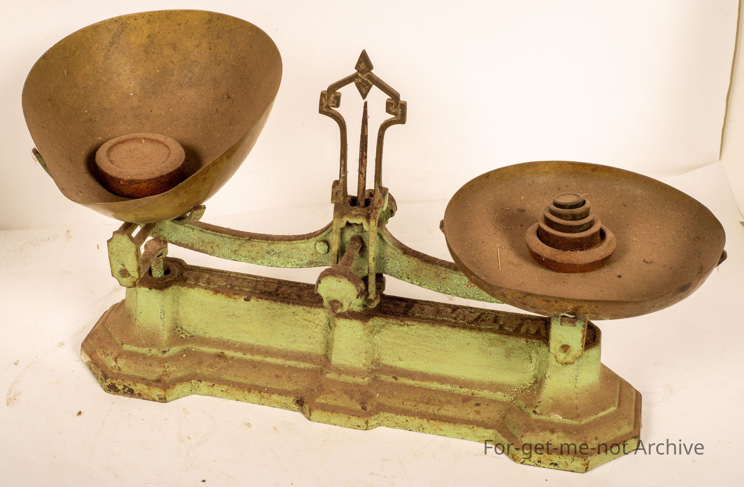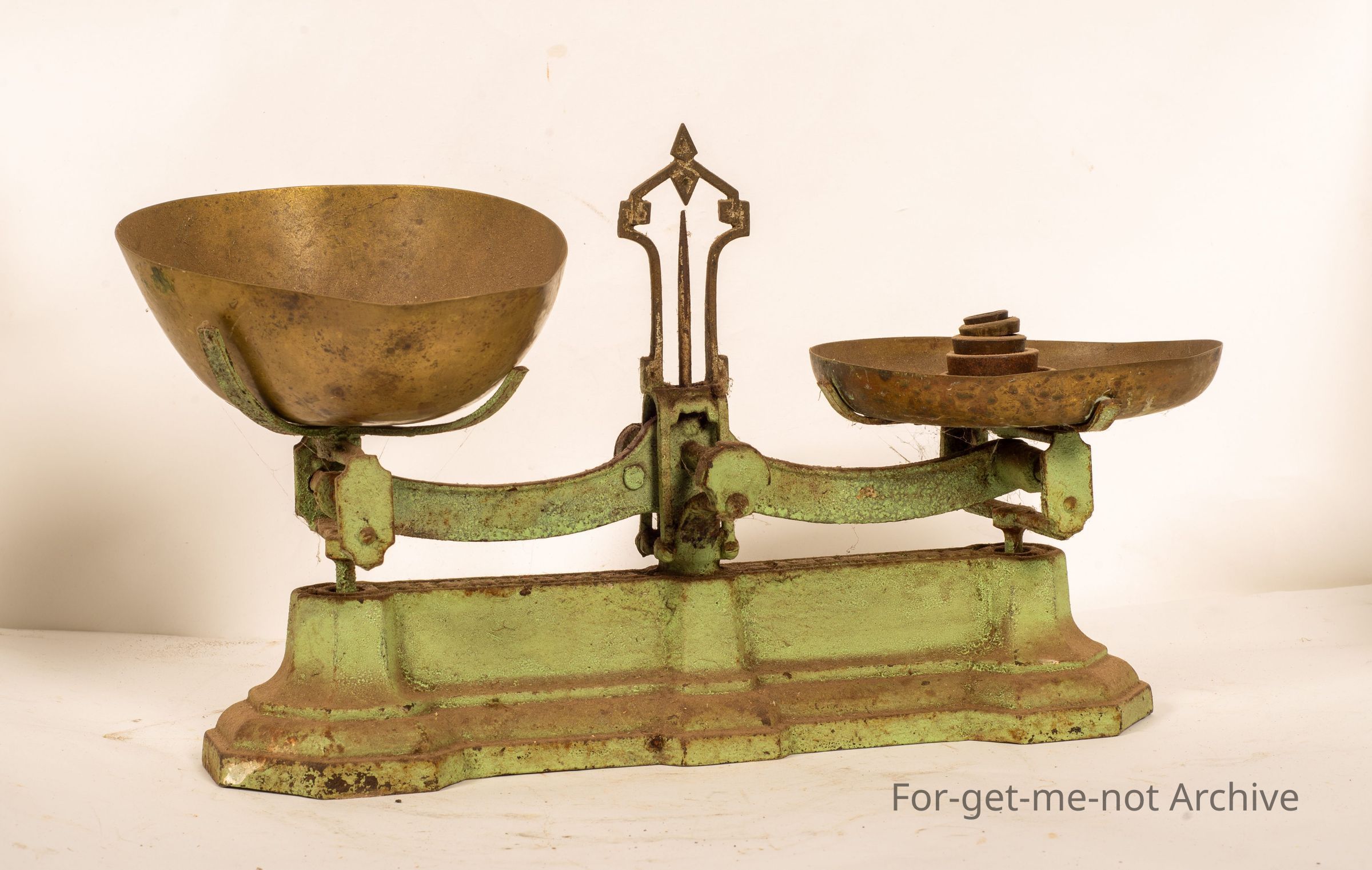A cast iron set of scales from a sweets shop. This set is, has a wonderful story. This came from Mrs. Warren's sweet shop in Eureka Street, Ballarat, which was just up from Eureka Street State School. I remember going into that shop as a kid very often and, this set is very complete with a brass bowl. The flat end, like a saucer, holds all the weights. It is very accurate and works perfectly.Collection