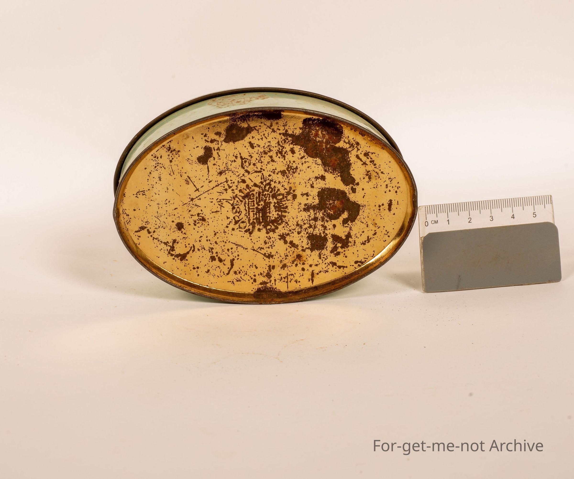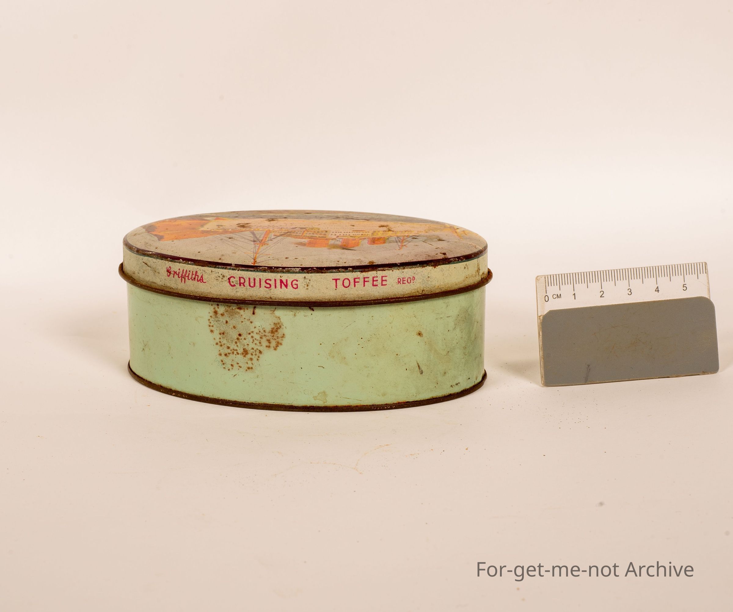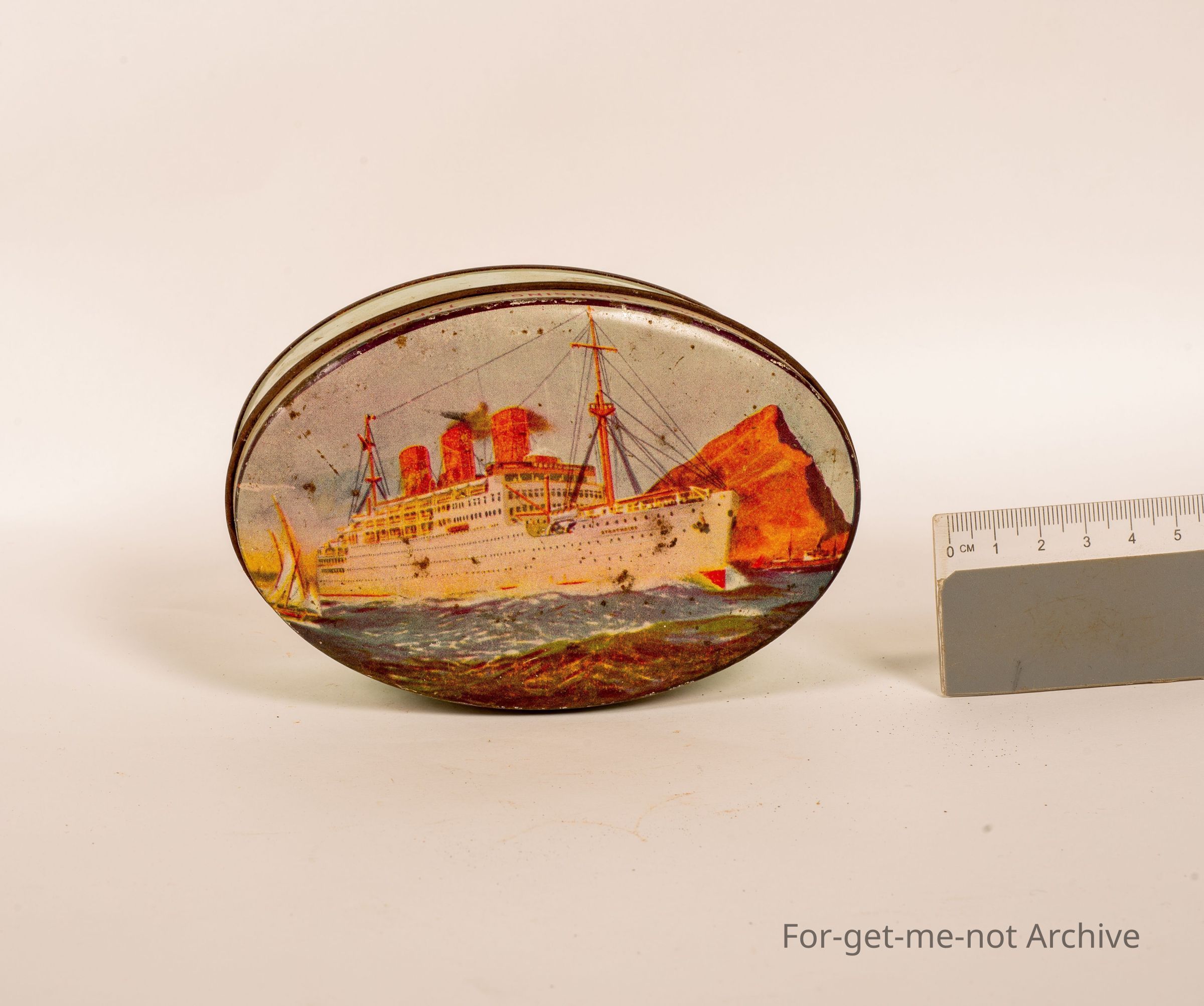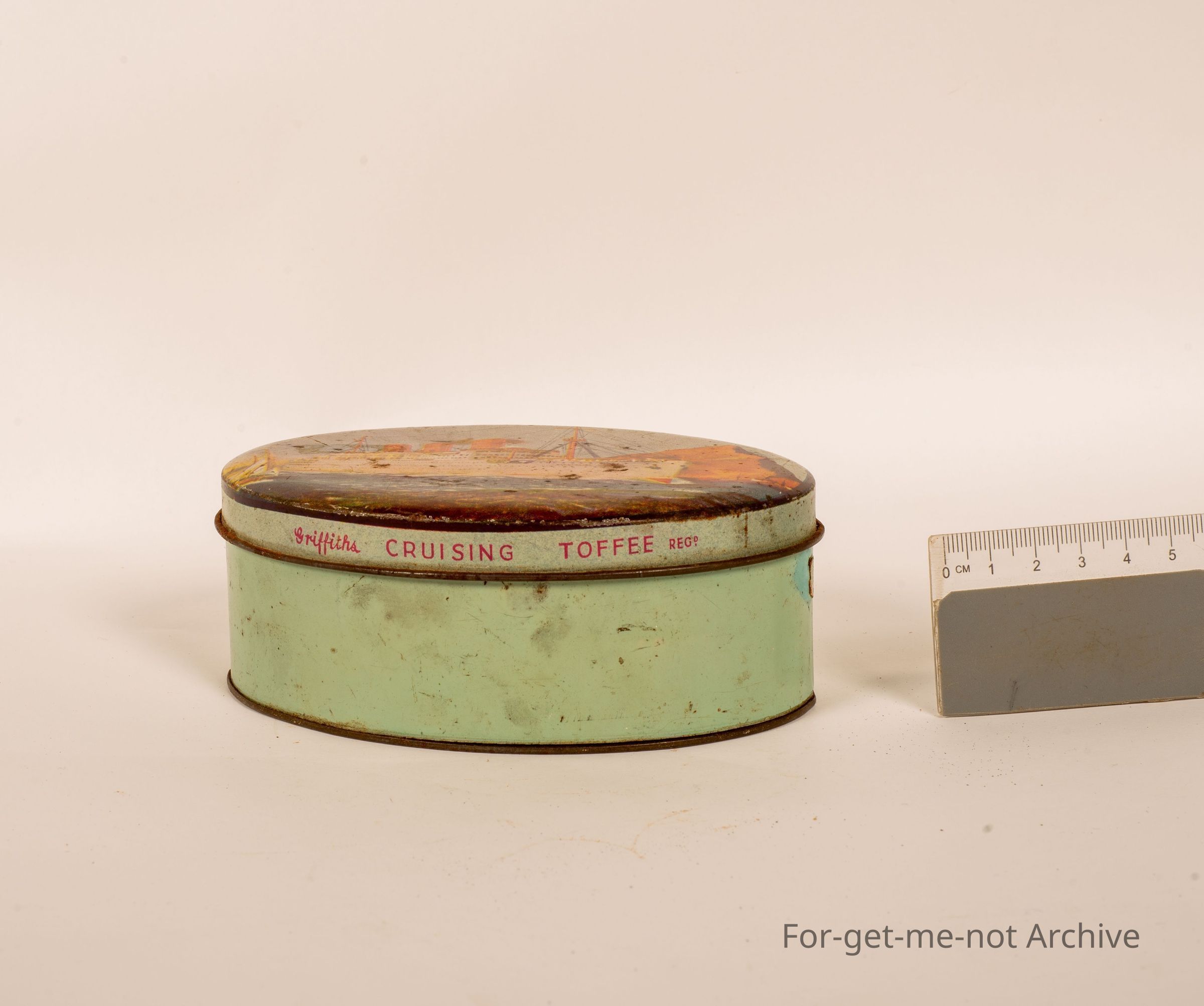 Sweet tin, This is a small oval tin with a image of a large passenger ship passing, what appears to be the Rock of Gibraltar. This this tin is produced or has Griffiths Cruising Toffee. This tin maker is stamped Horsfall, Richmond, made in, Melbourne.Collection