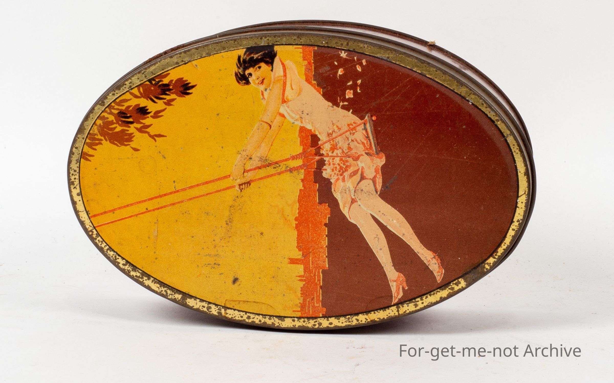 Oval shaped tin possibly MacRobinson featurs a girl on a swing on the front