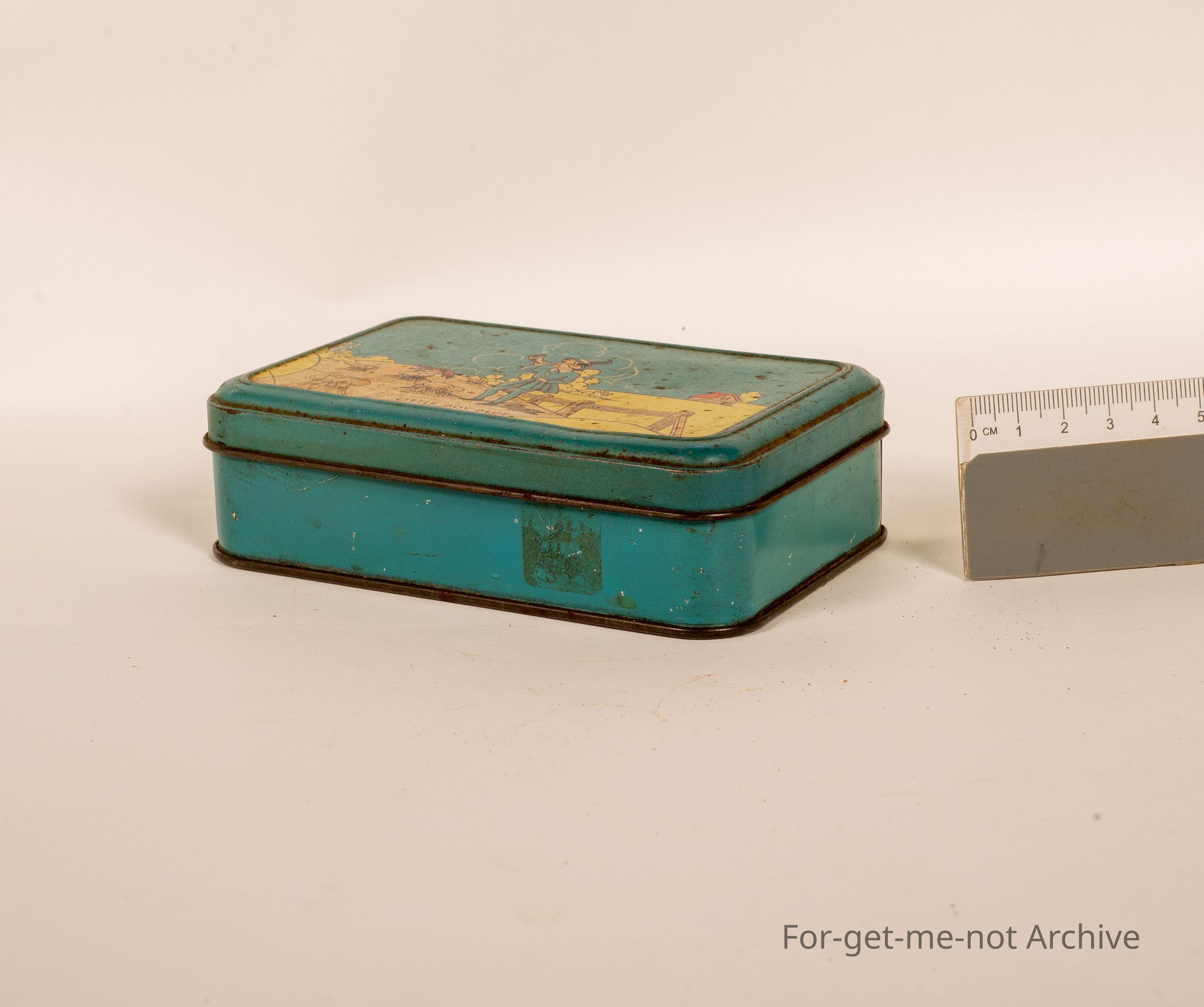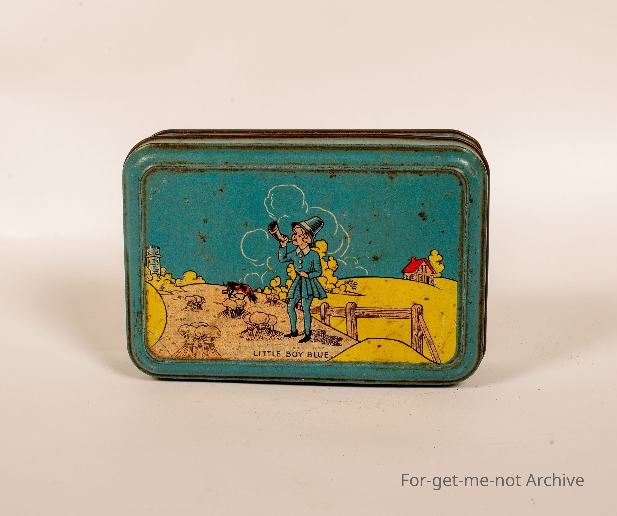 Confectionery tin. This is a small rectangular tin from AW Allan Australia. This chin has the graphics of little boy blue in a paddock on the front, in a quite good order.