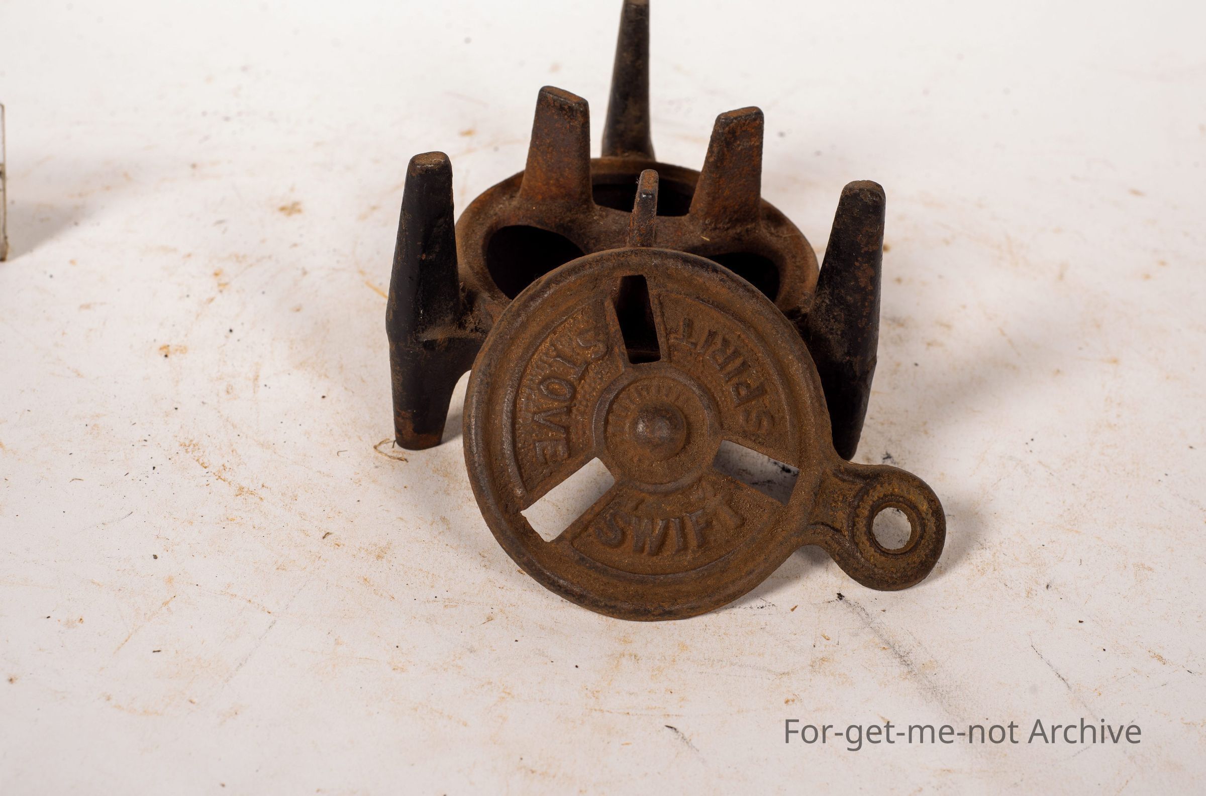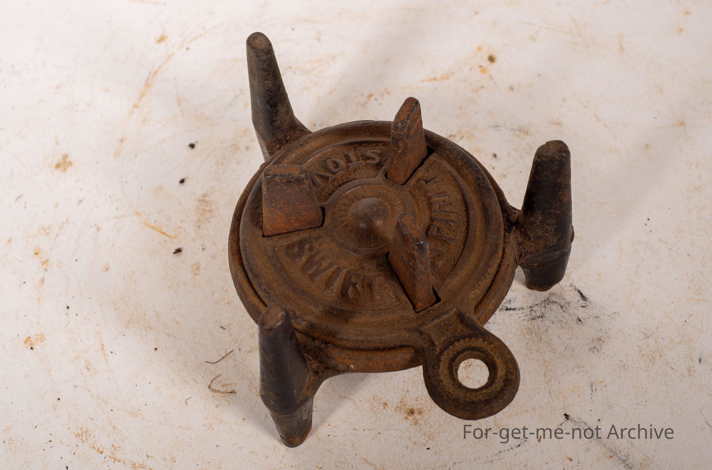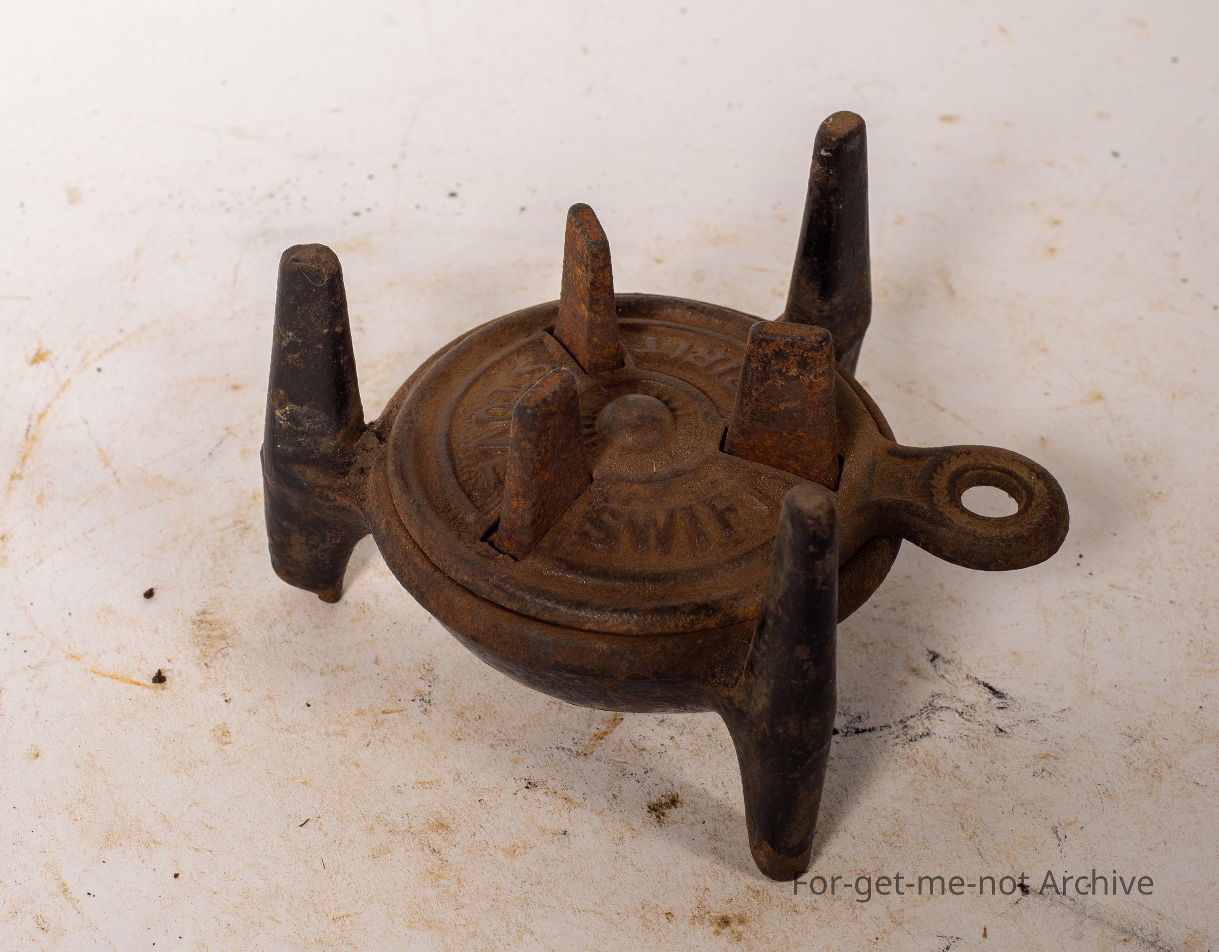 This is a little cast iron, portable stove called the, Swift what is it? Spirit stove. Swift Spirit stove. Quite beautifully made. A little bowl for putting the spirit in underneath. All complete could be used today.Collection