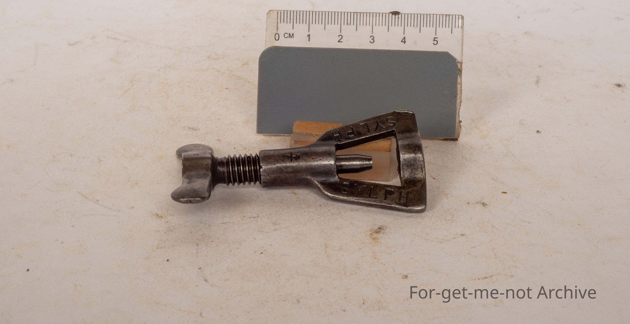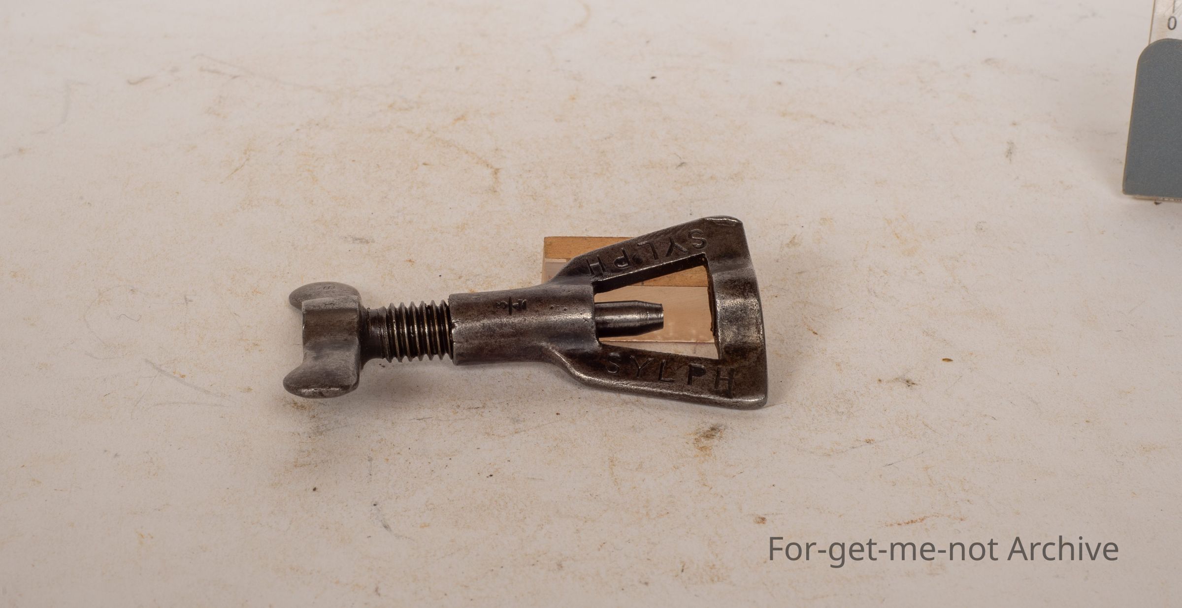 This is a little, very small tool with a butterfly screw on the top, stamped sylph for itself. It's got 3 quarters of an inch. Seems to have a cutting action for holes