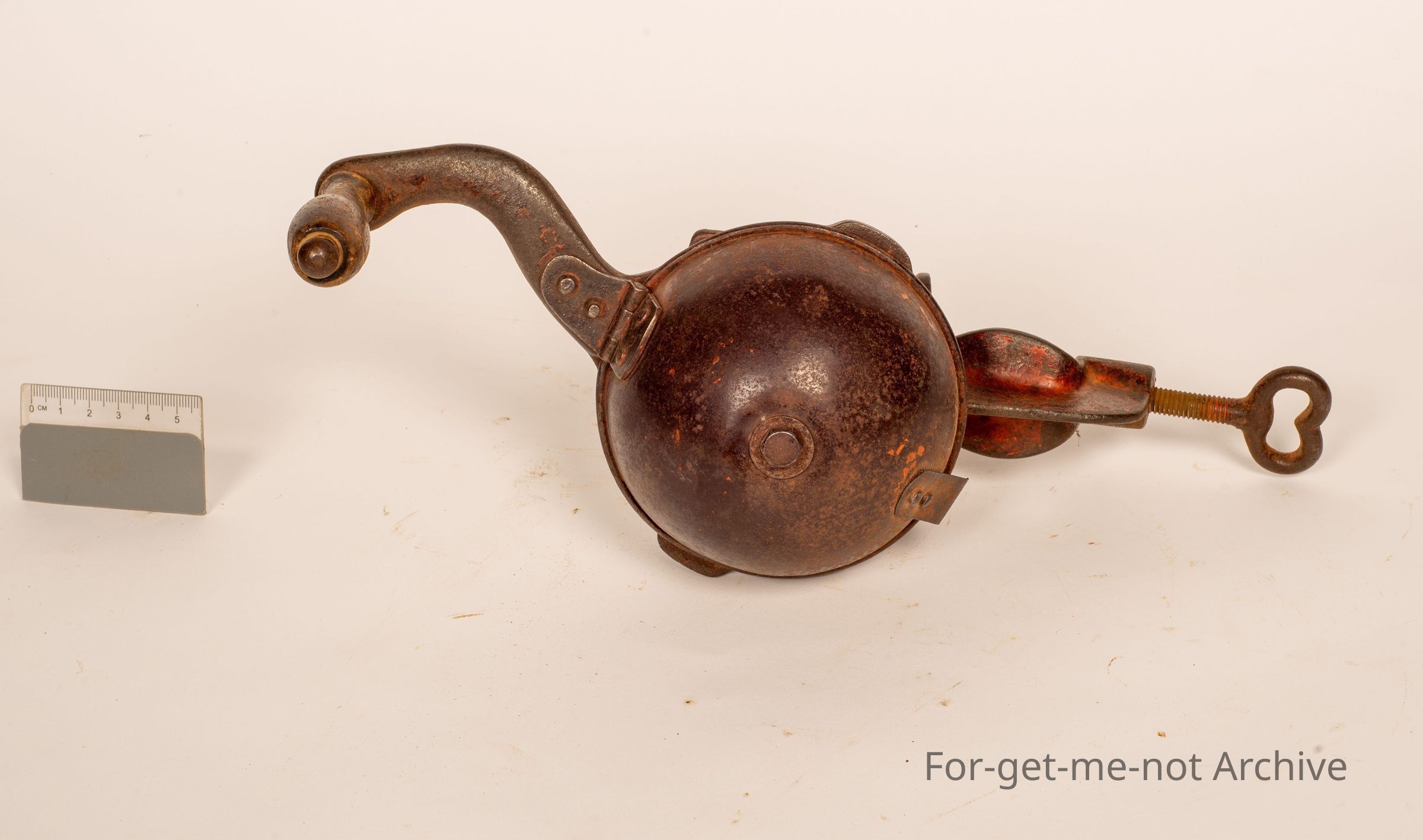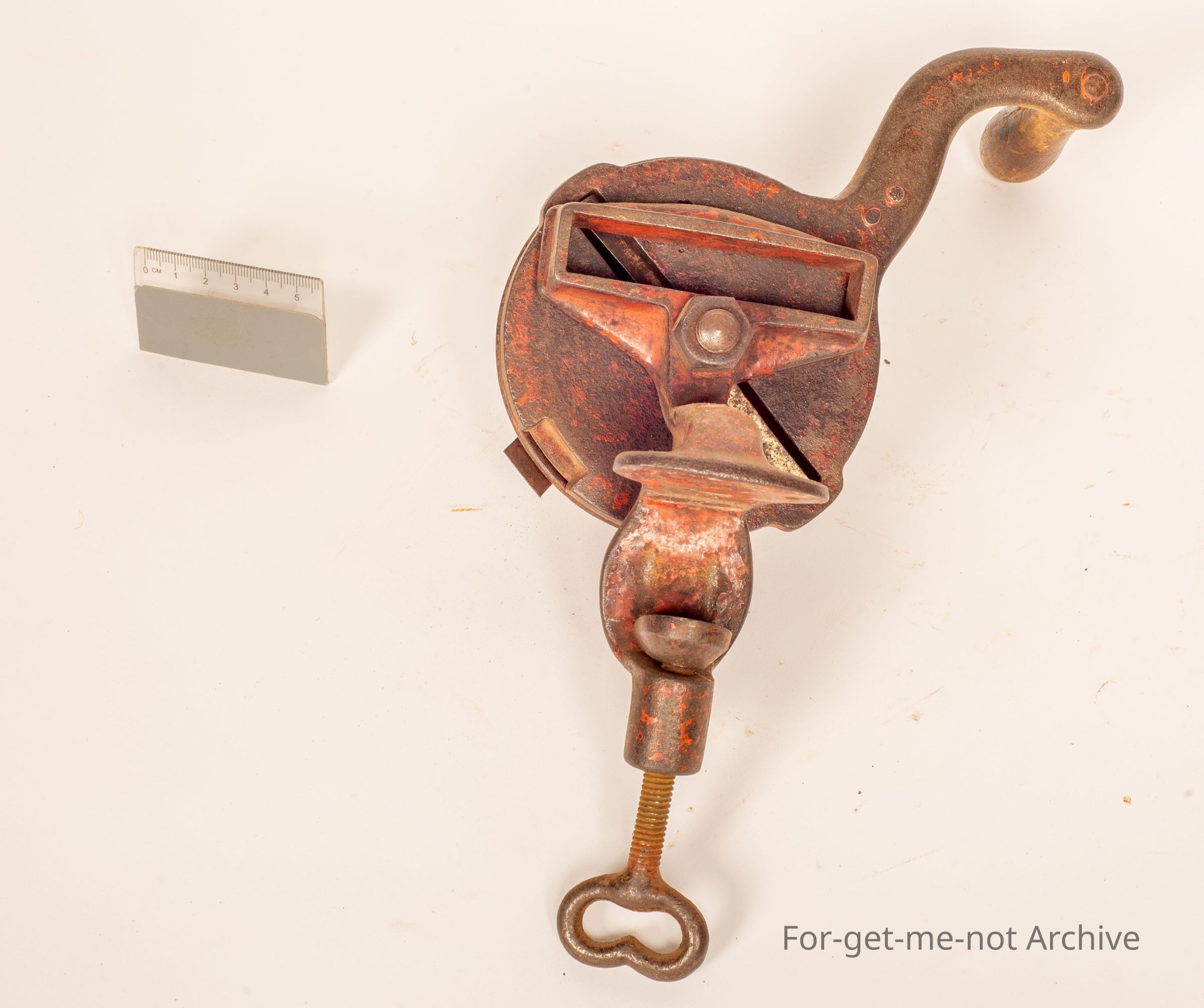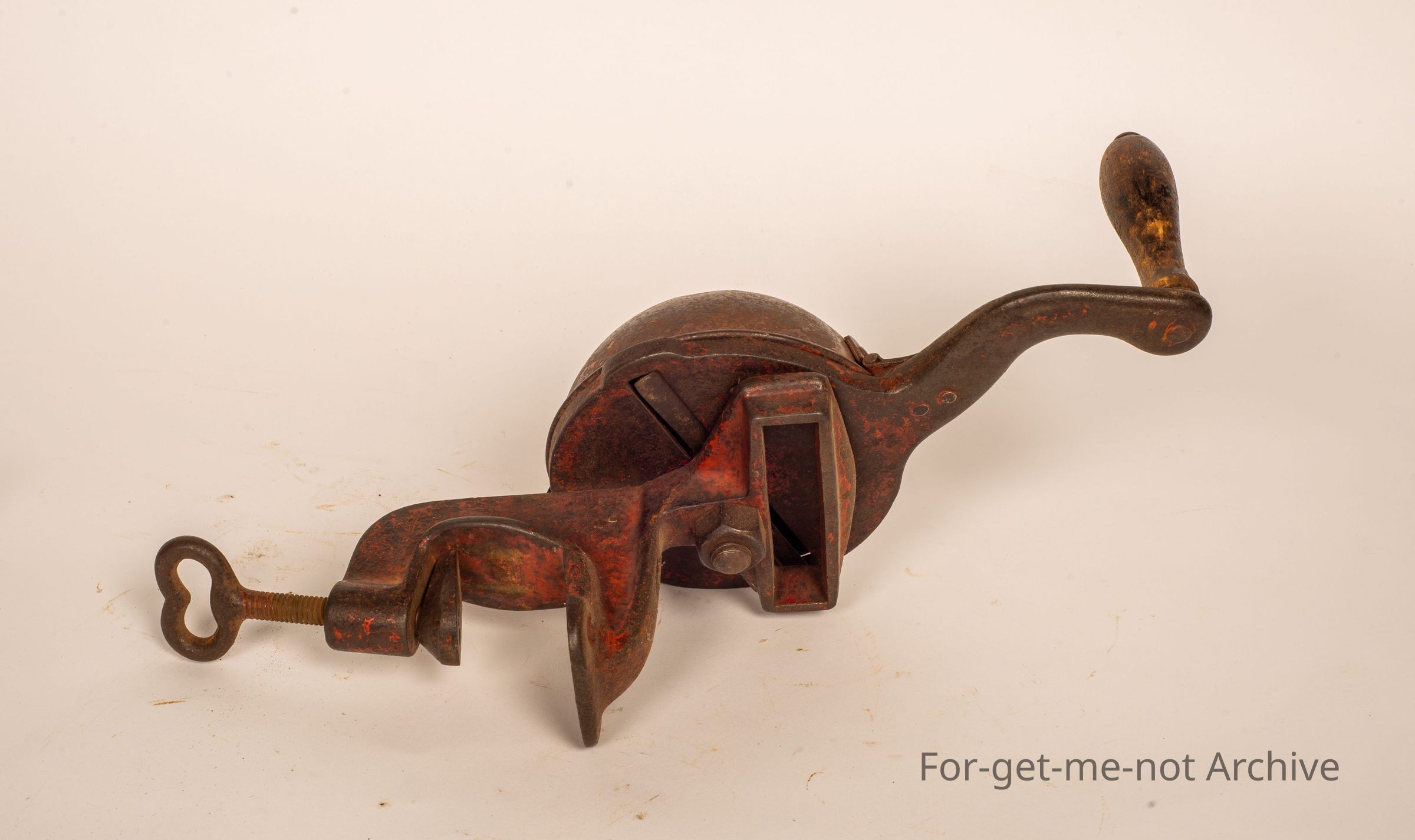 This is, a table clamped slicer, hand operated with a catcher on the back of the blades. No information in the stamping.
