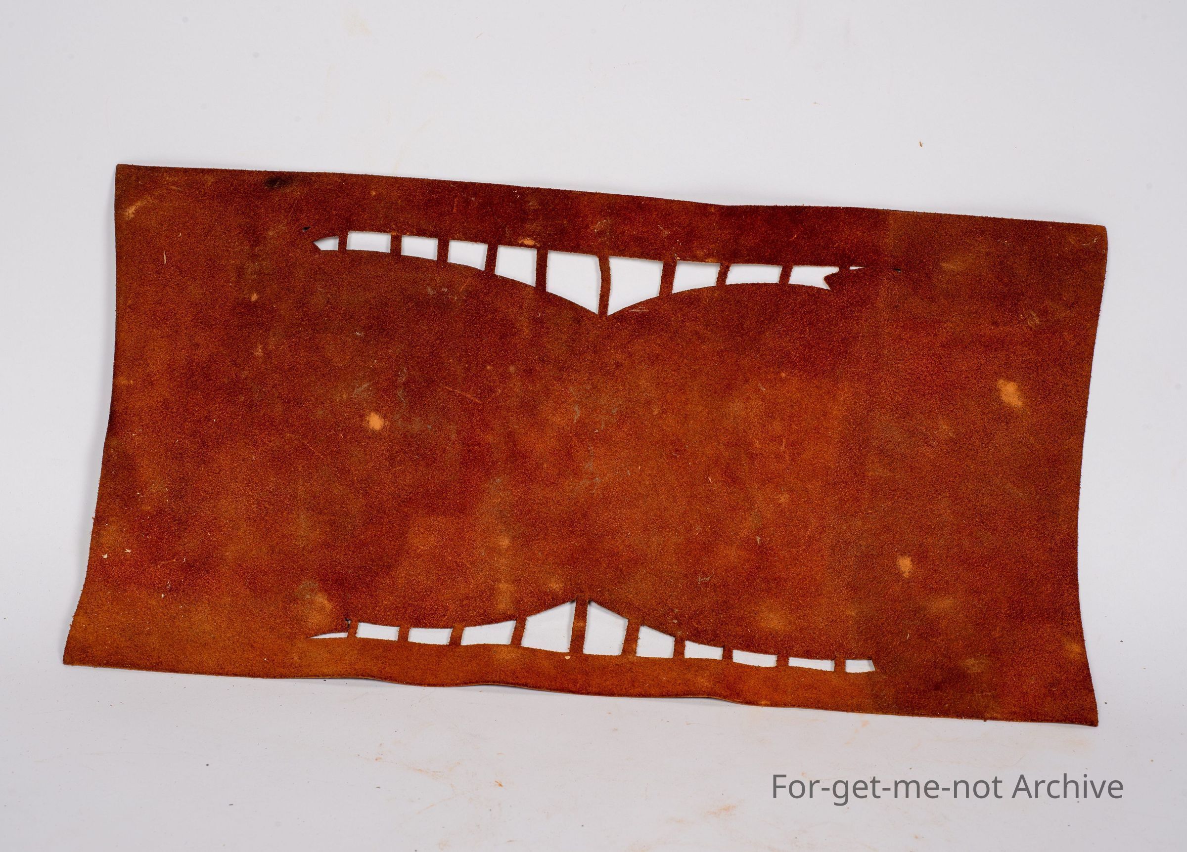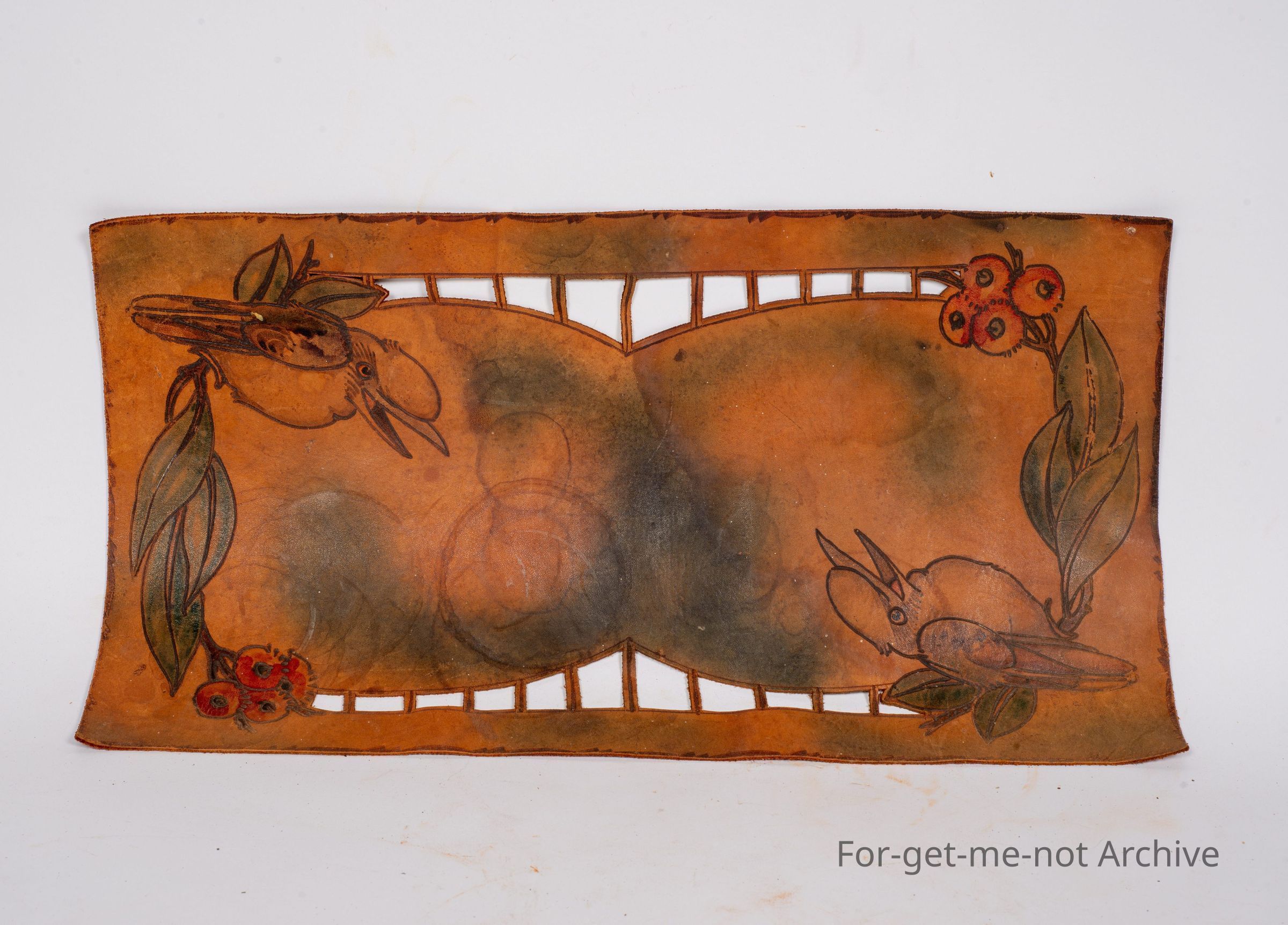 Is like a table mat. This one made from leather. This one has had poker work outline of kookaburra's, gum leaves, and blossoms. In lovely order considering the year and the use of it,