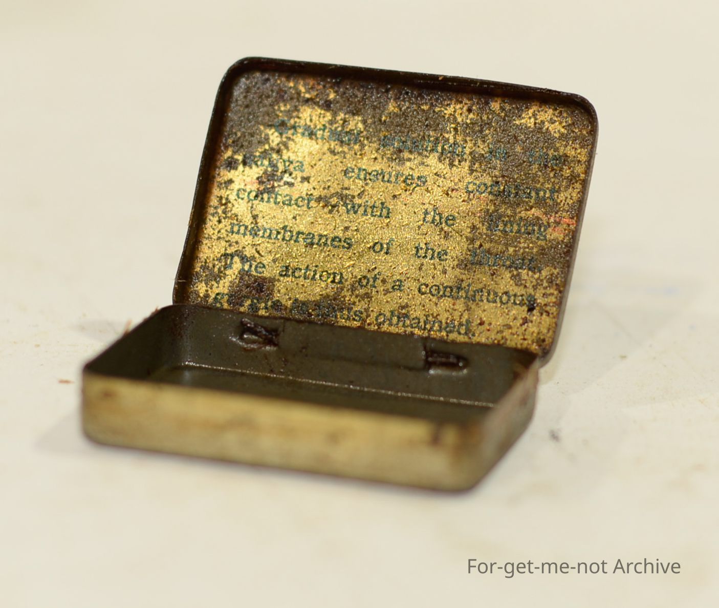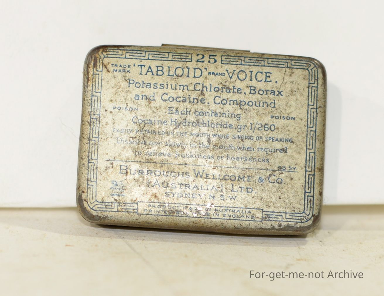 "Tabloid " "Voice" a tablet containing Potassium Chlorate, Borax and Cocaine, is to help your singing voice, small tin, Ave condition