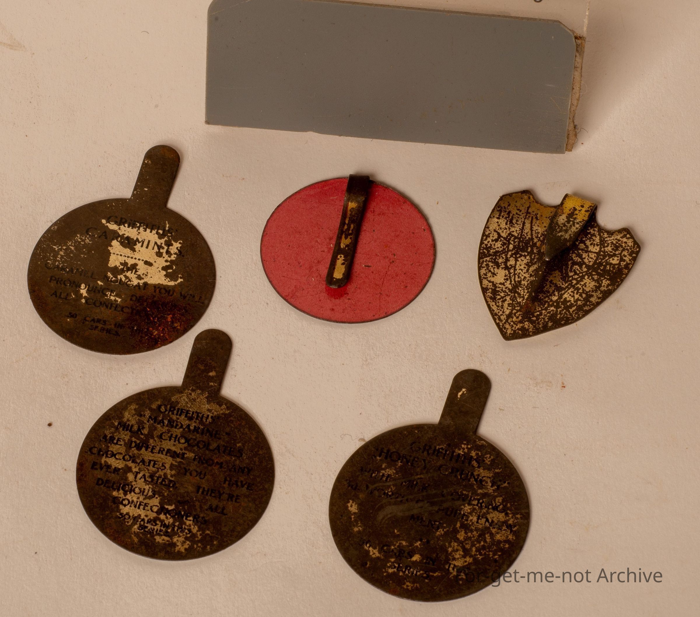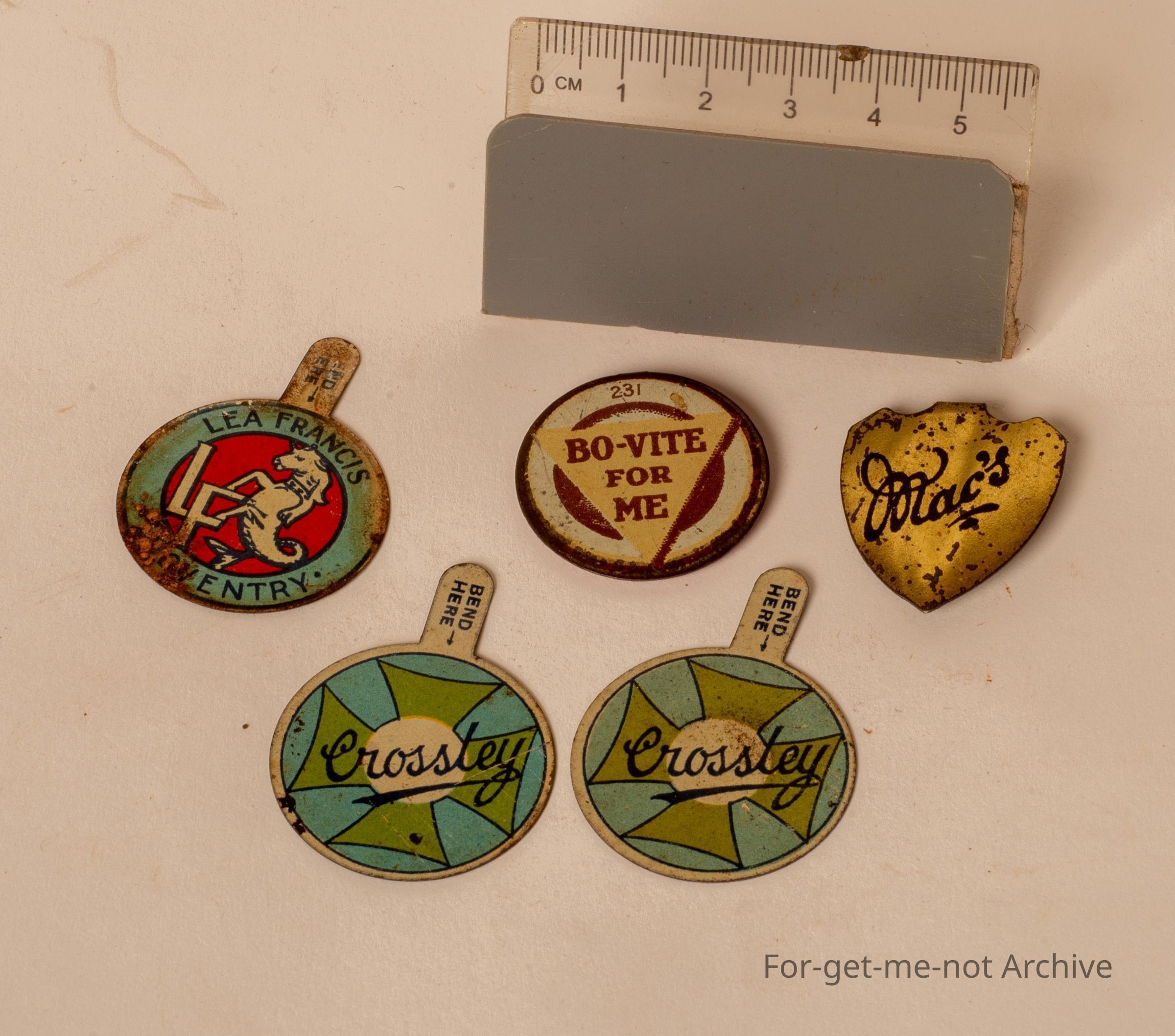 The little tab on the end was to fold over and clip it to the rim of your hat. The first one is Crossley, the second one is also Crossley, then there's Max from Mac Robinson Confectionery, the 4th one is Lee Francis, perhaps Coventry and then the last one is Bo-vite for me, all made of light tin, all with a tab, all from shortly after 1900, into the twenties, very hard to findCollection