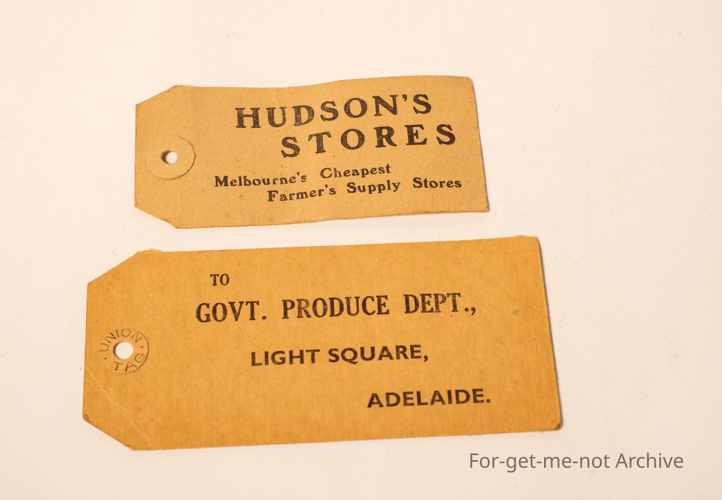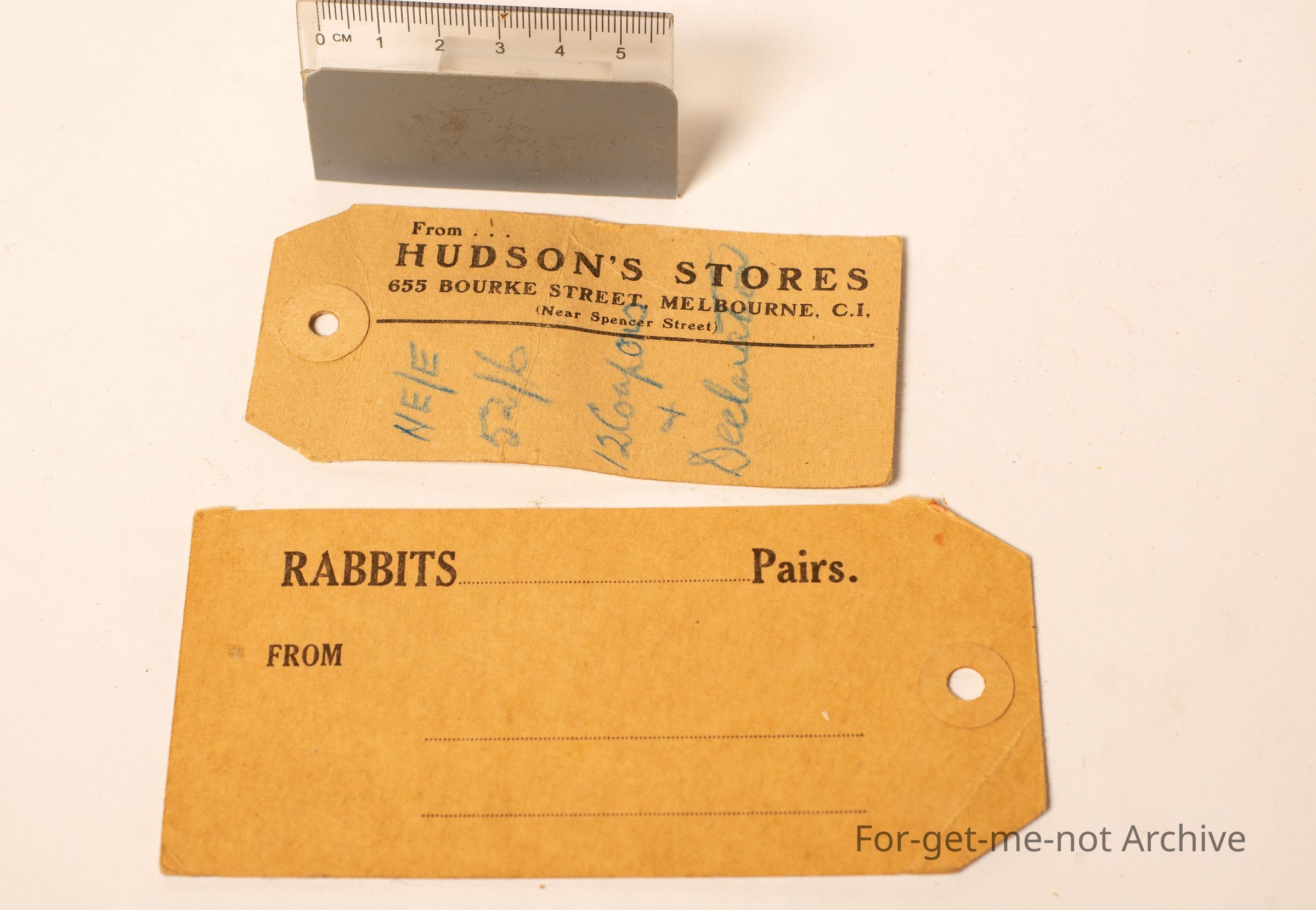 2 cardboard dispatch cards.1 from Hudson's Stores, Melbourne's Cheapest Farmers Supply Stores, Burke Street, Melbourne. The other one to government produce department, Light Square Adelaide. This is for rabbits with the number of pairs from the Rabbiter.Collection