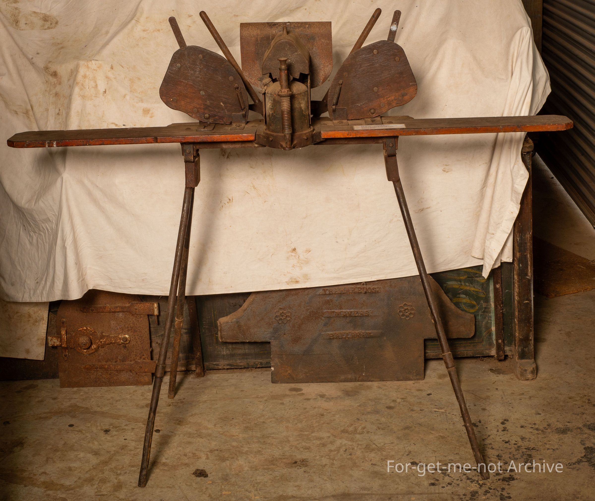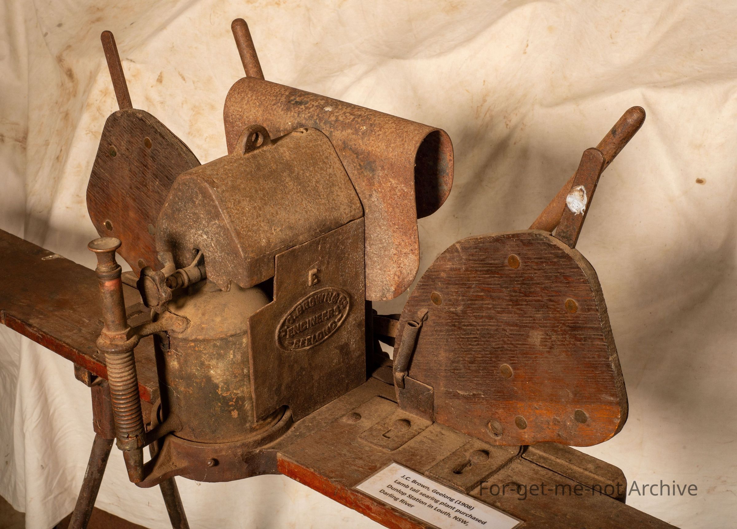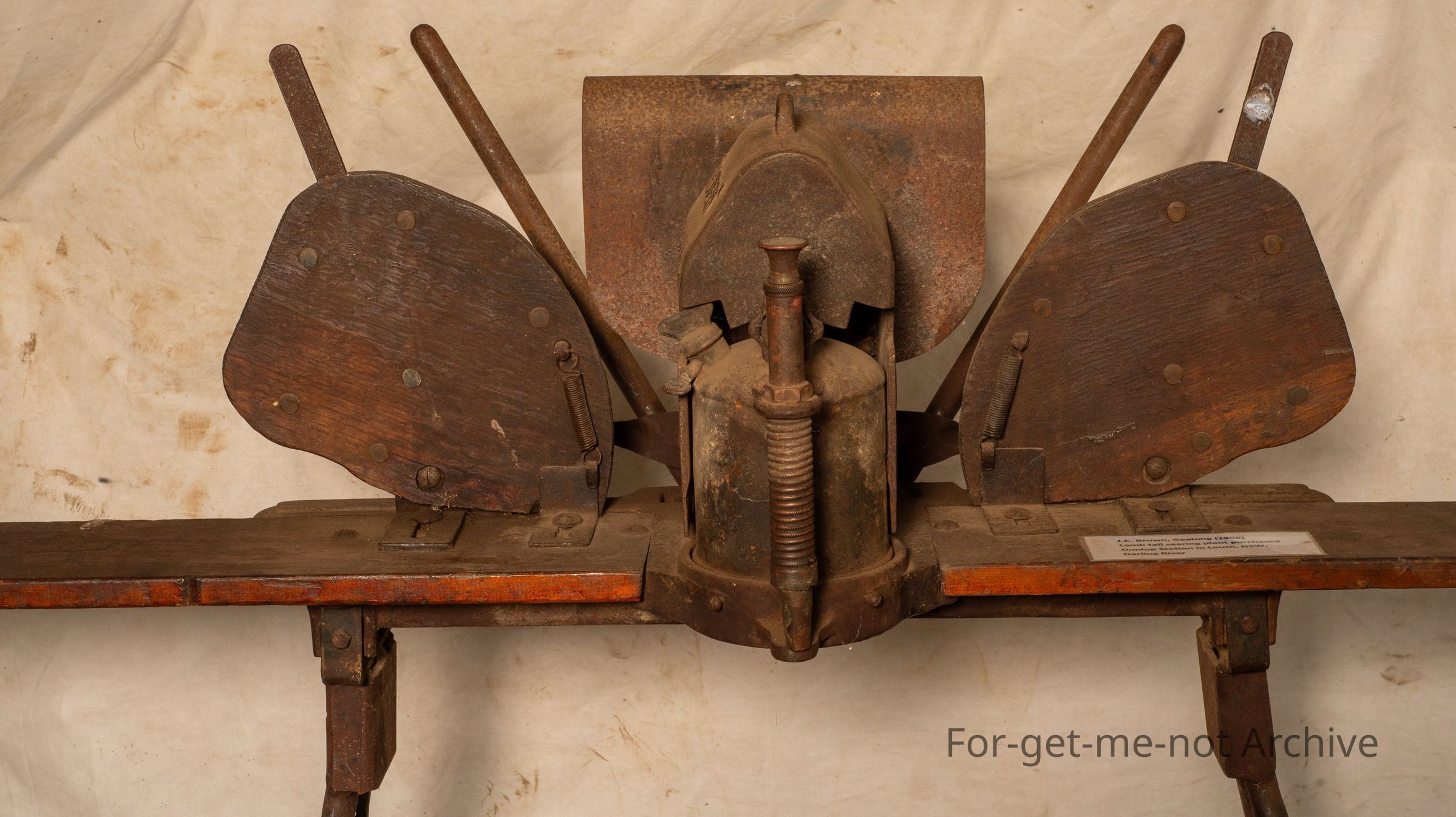 This apparatus was, used by using a blowtorch to heat 2 searing irons that were, in the force of the flame at all time to keep them hot and they alternated from one side to the other. This one originated from Dunlop Station on the Darling River at Louth in New South Wales, came out of the storeroom on the, at Dunlop, been there since the days of Dermot MurrayCollection