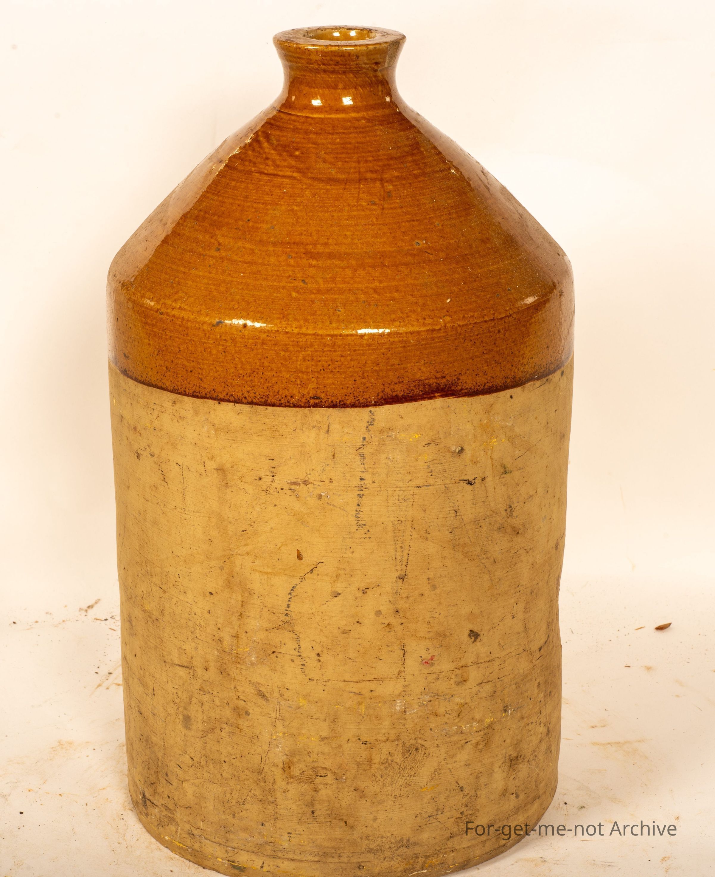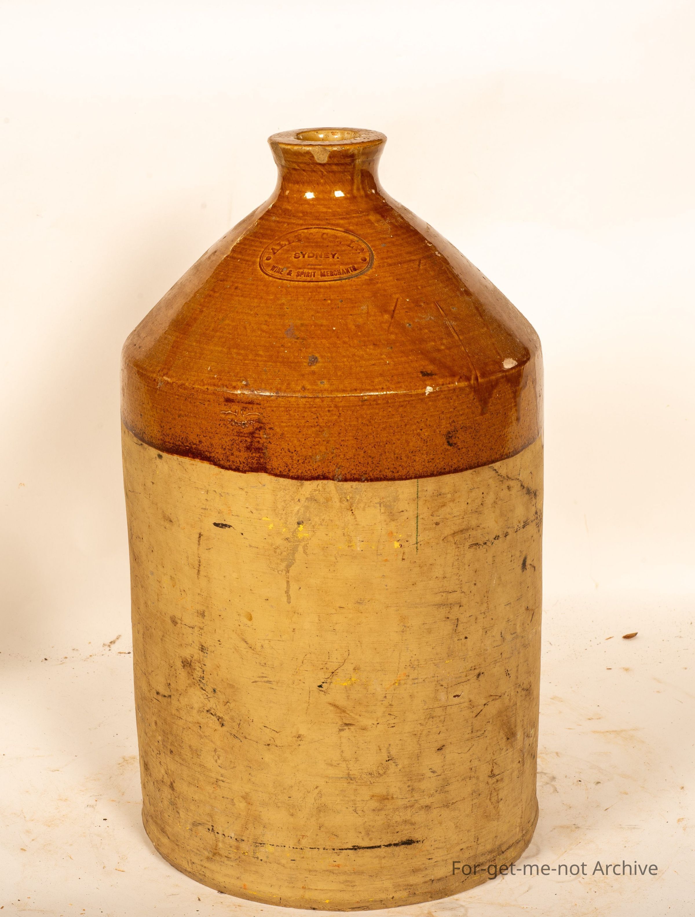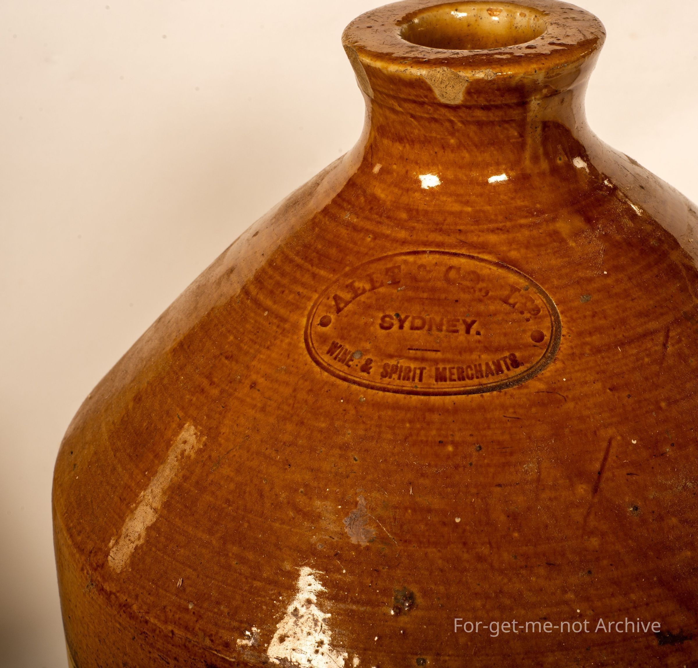 Stoneware pottery. this is a tall jar, no handle, intact neck, stamped Alt. Alt and Co Limited. Alt and Co Limited Sydney, Wine and Spirits. Merchants. Merchants. Wine and Spirit Merchant. This particular bottle has had a woven cane base which is absent.Collection