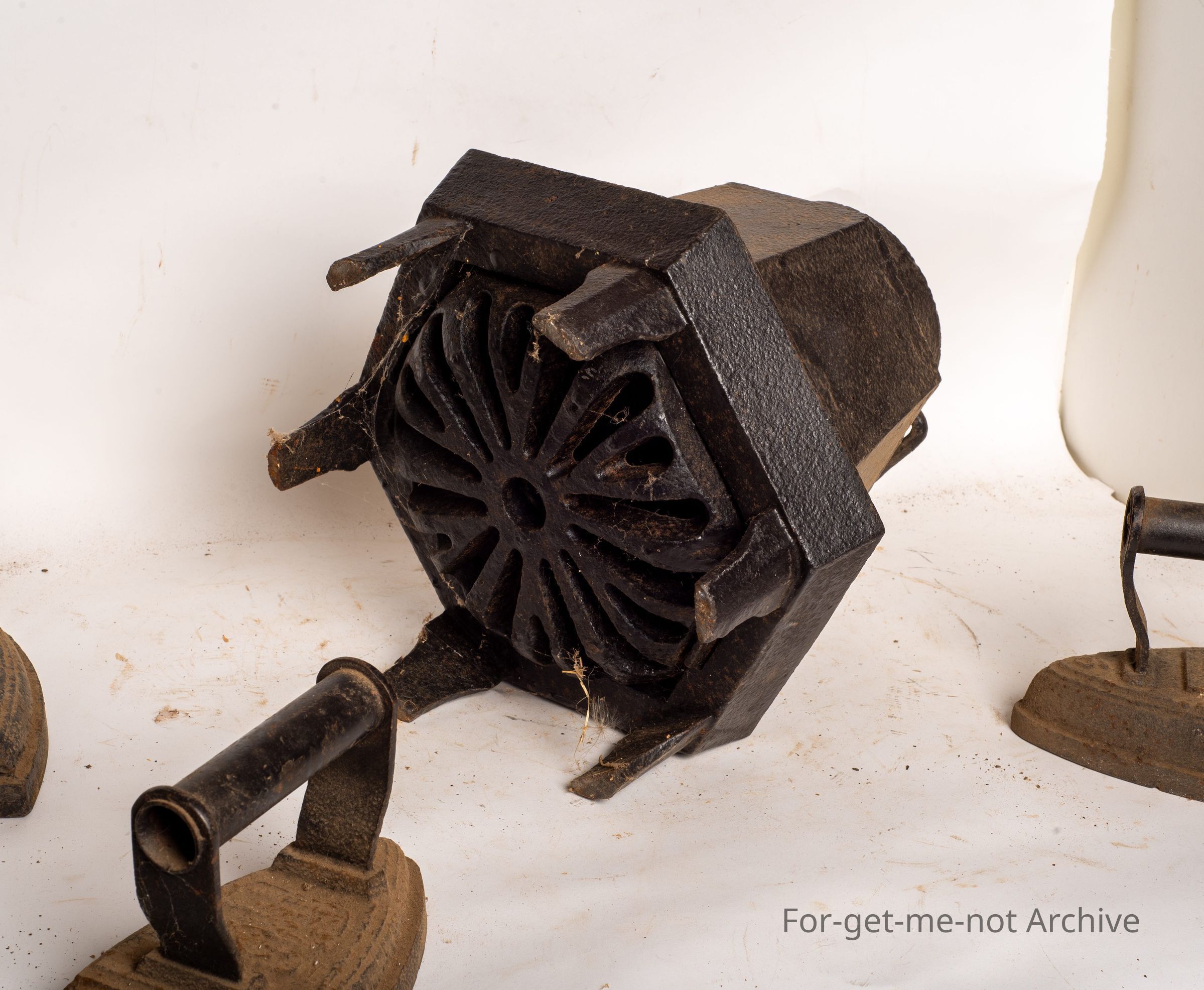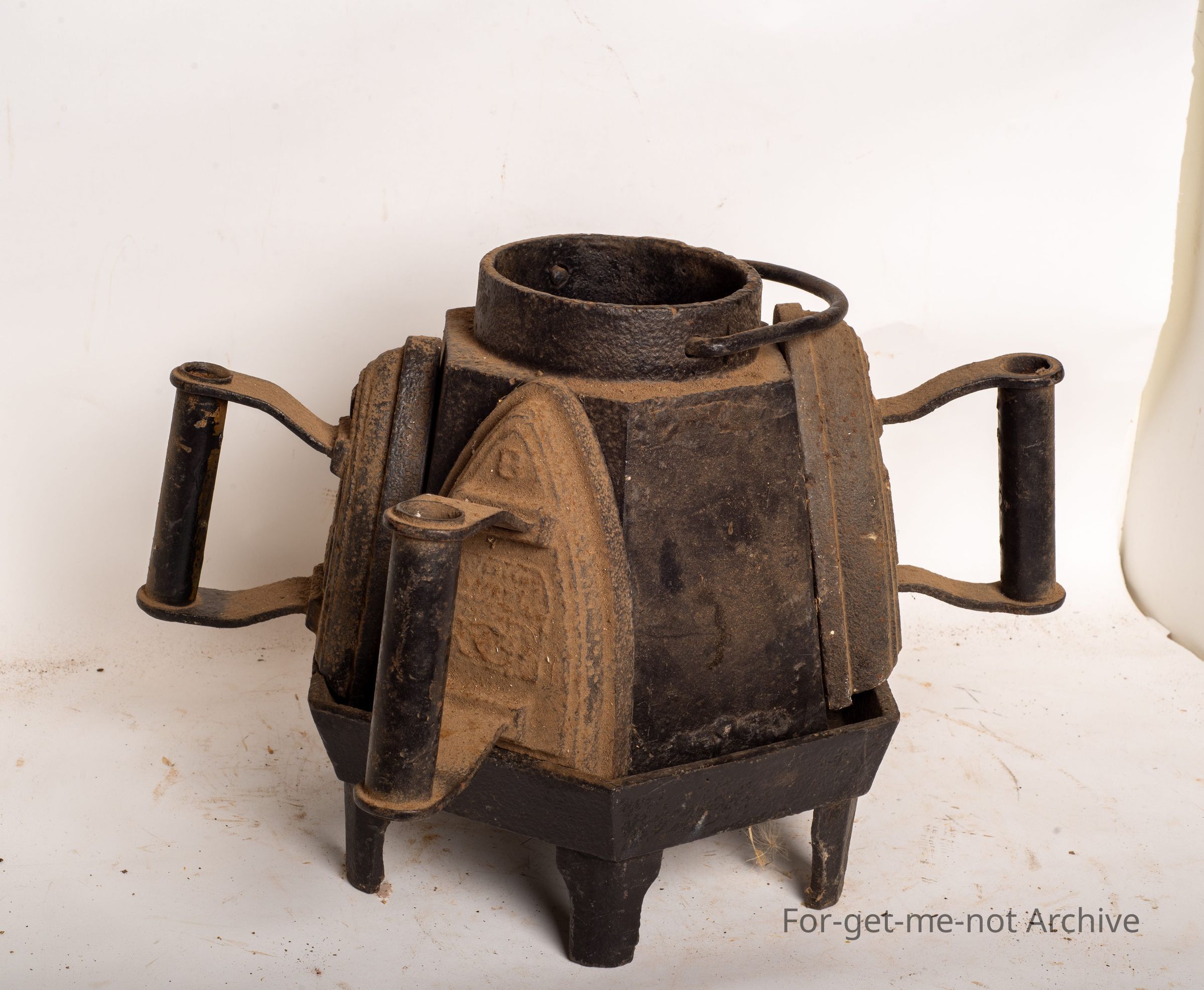 This is a Taylor's flat iron stove. 6 flat surfaces. A ring at the bottom to hold the iron so the heat from the coal fire is transmitted through the surface into the iron. Has a grate in the bottom. Very unusual and hard thing to find. Usually used by country tailors in small towns.Collection