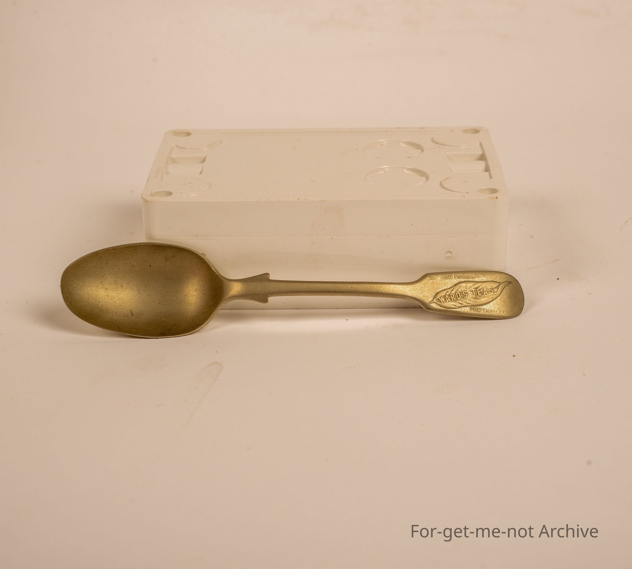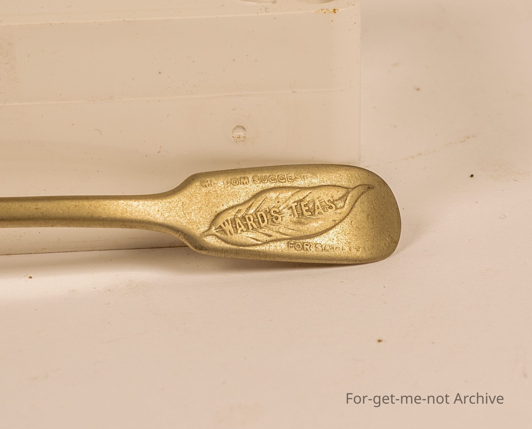 Teaspoon with advertising on handle for Ward's Tea. "Wisdom suggests Wards Tea for satisfaction guaranteed"