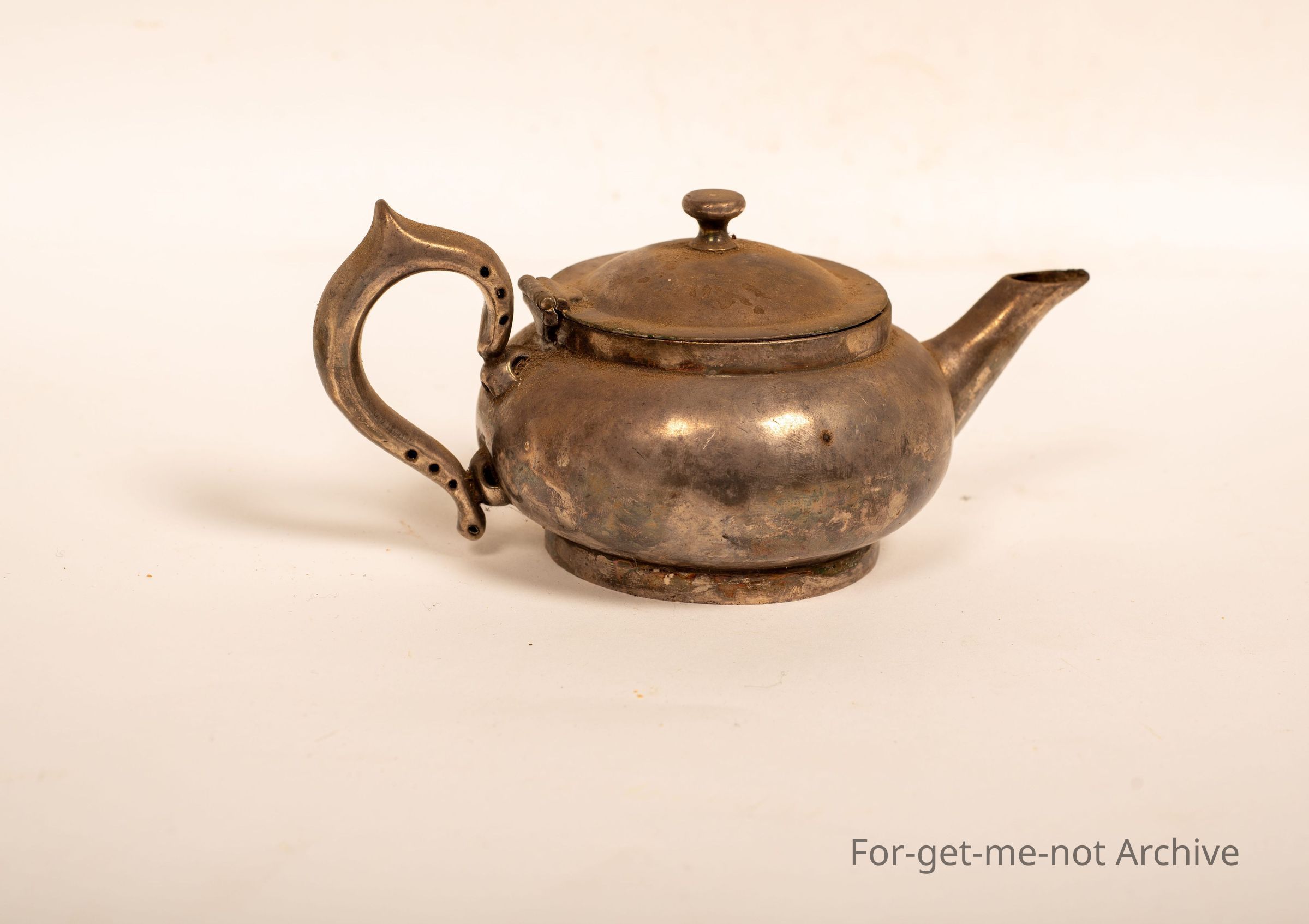 The smallest size over teapot metal missing the internal strainer. Stamped mire on the side.