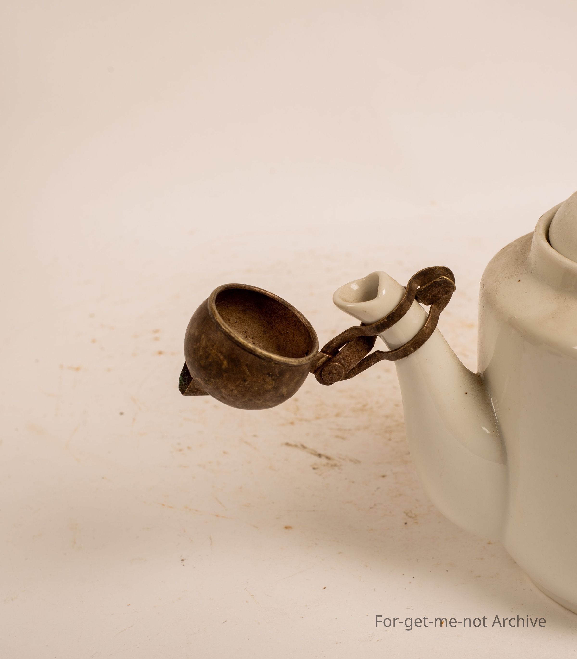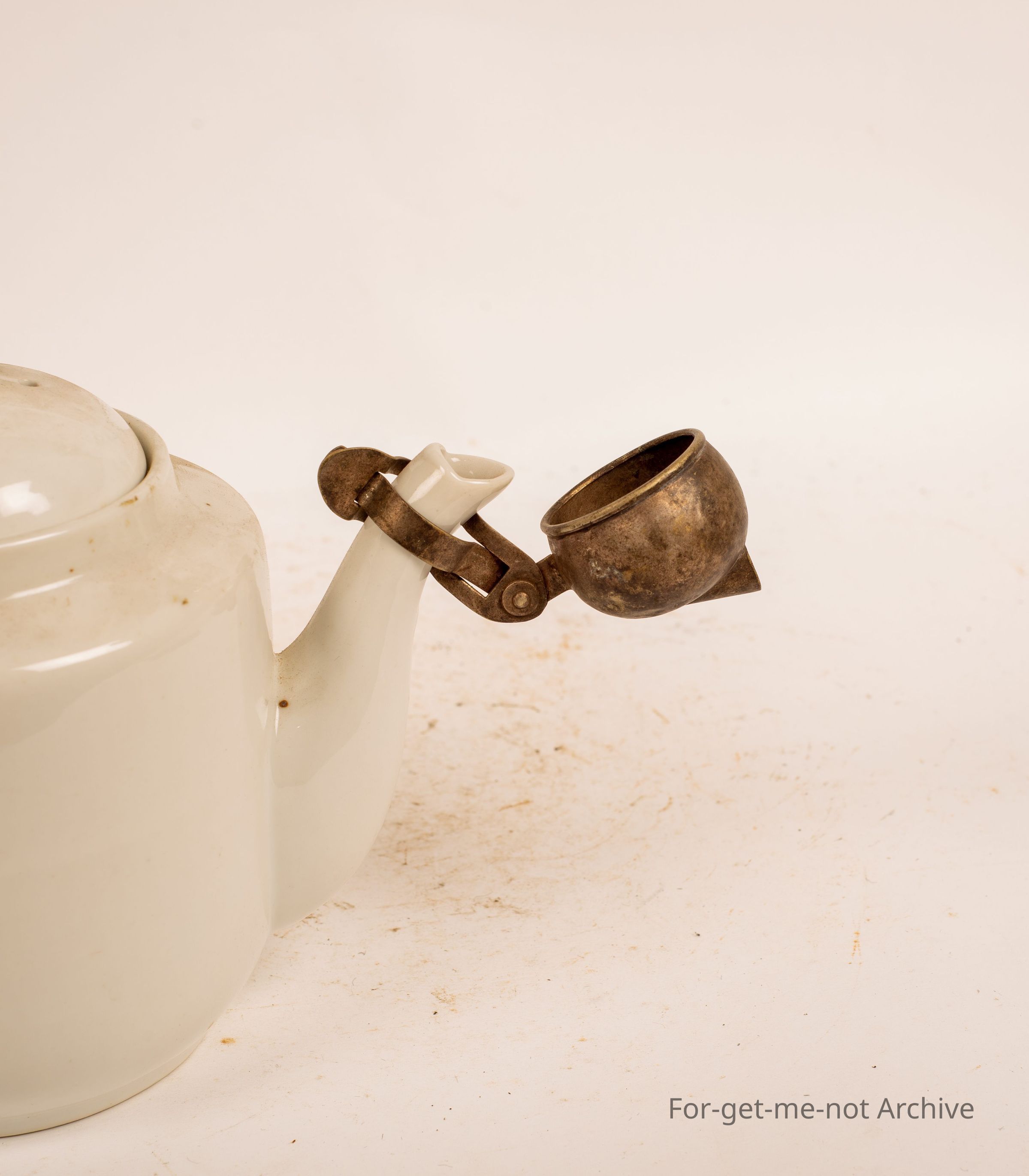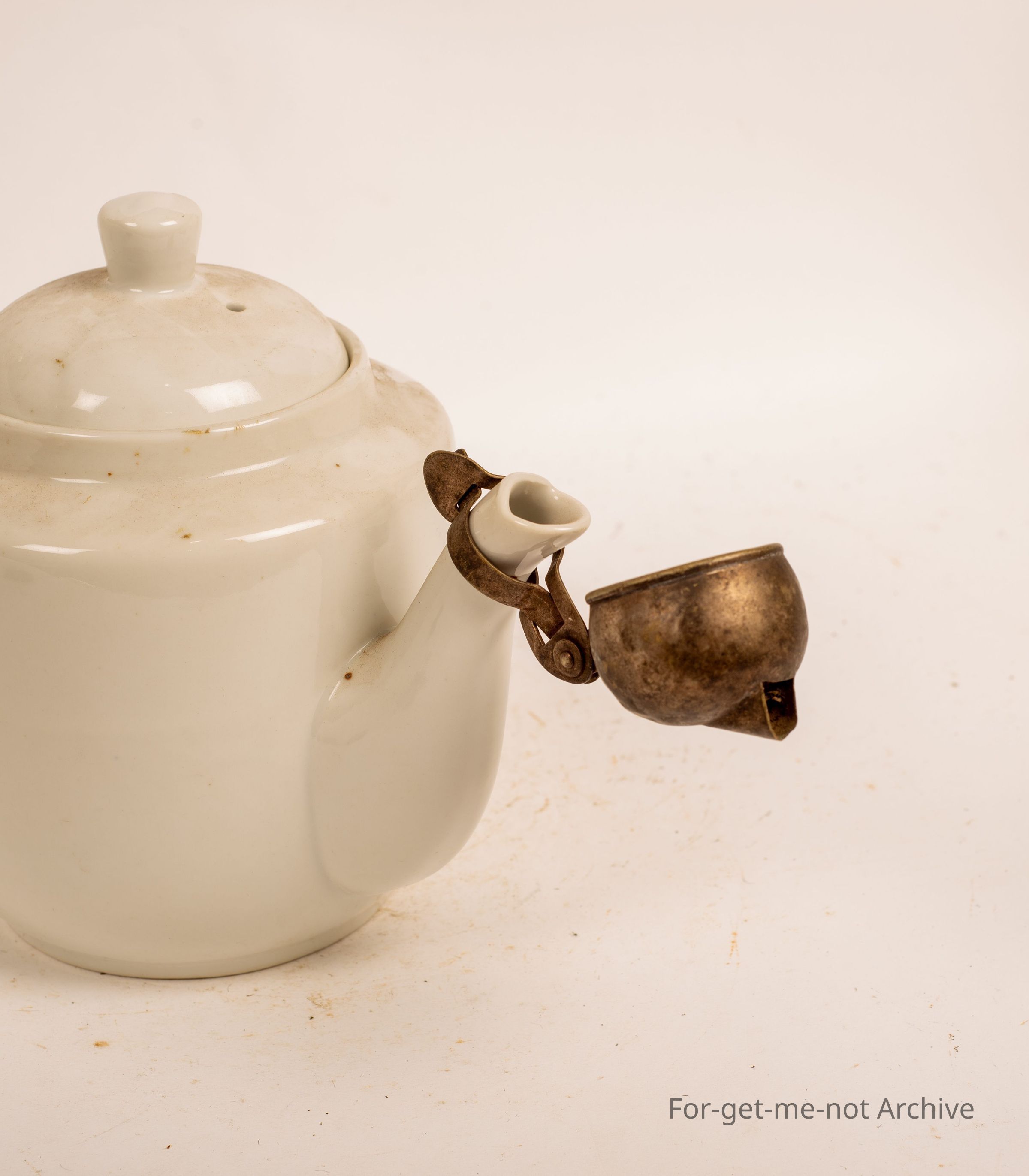 Plain white teapot with strainer attachment on end of spout.