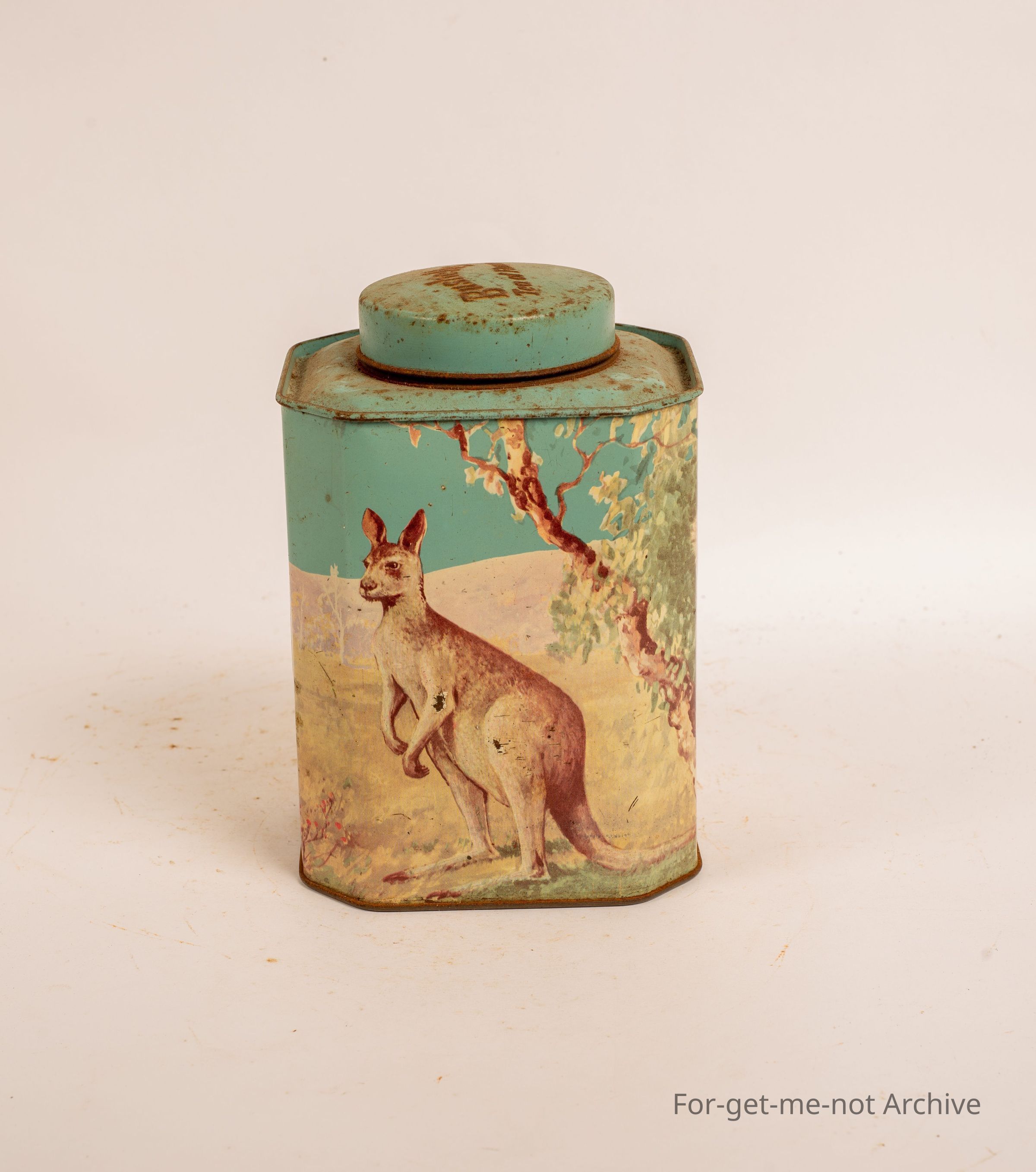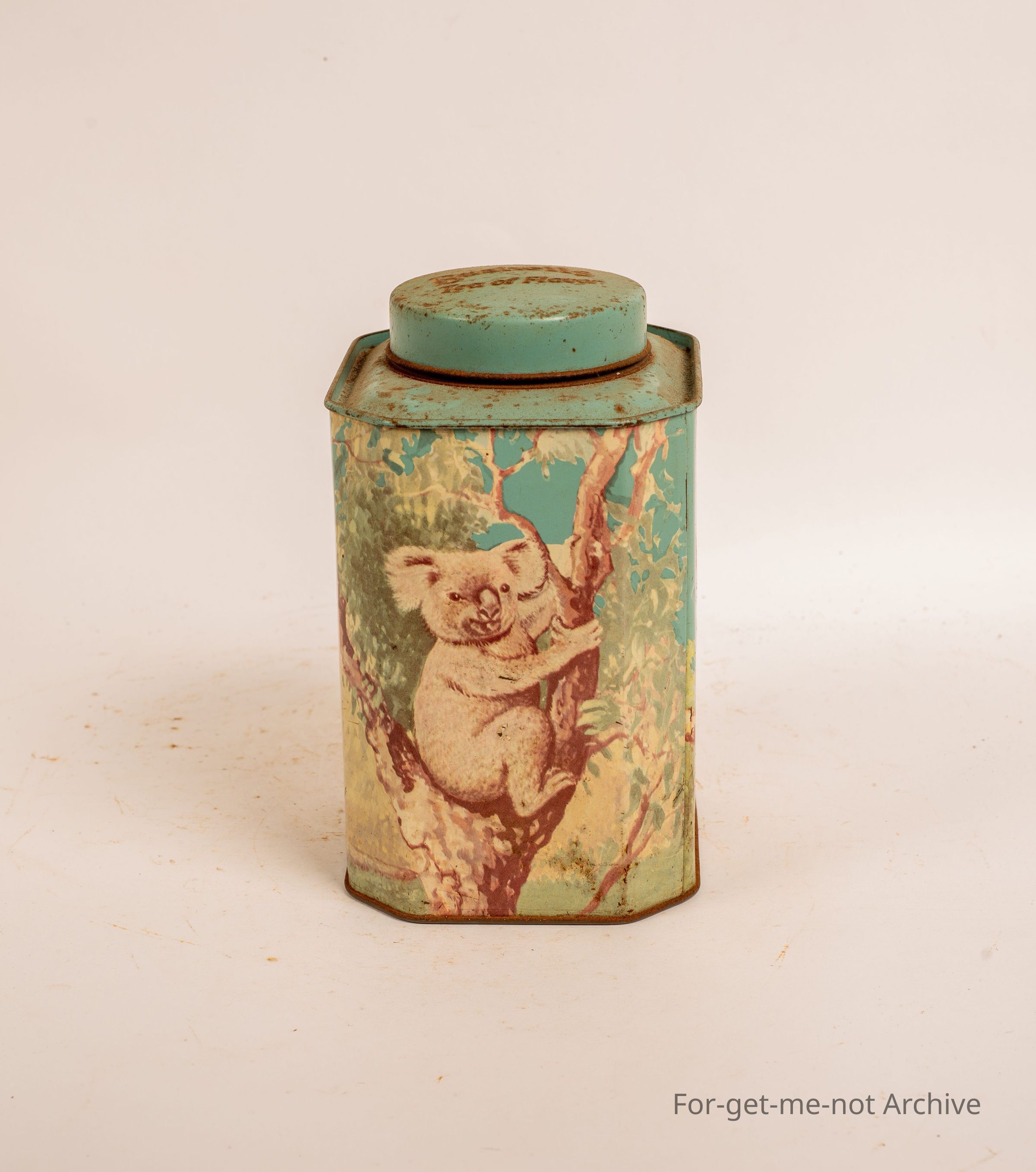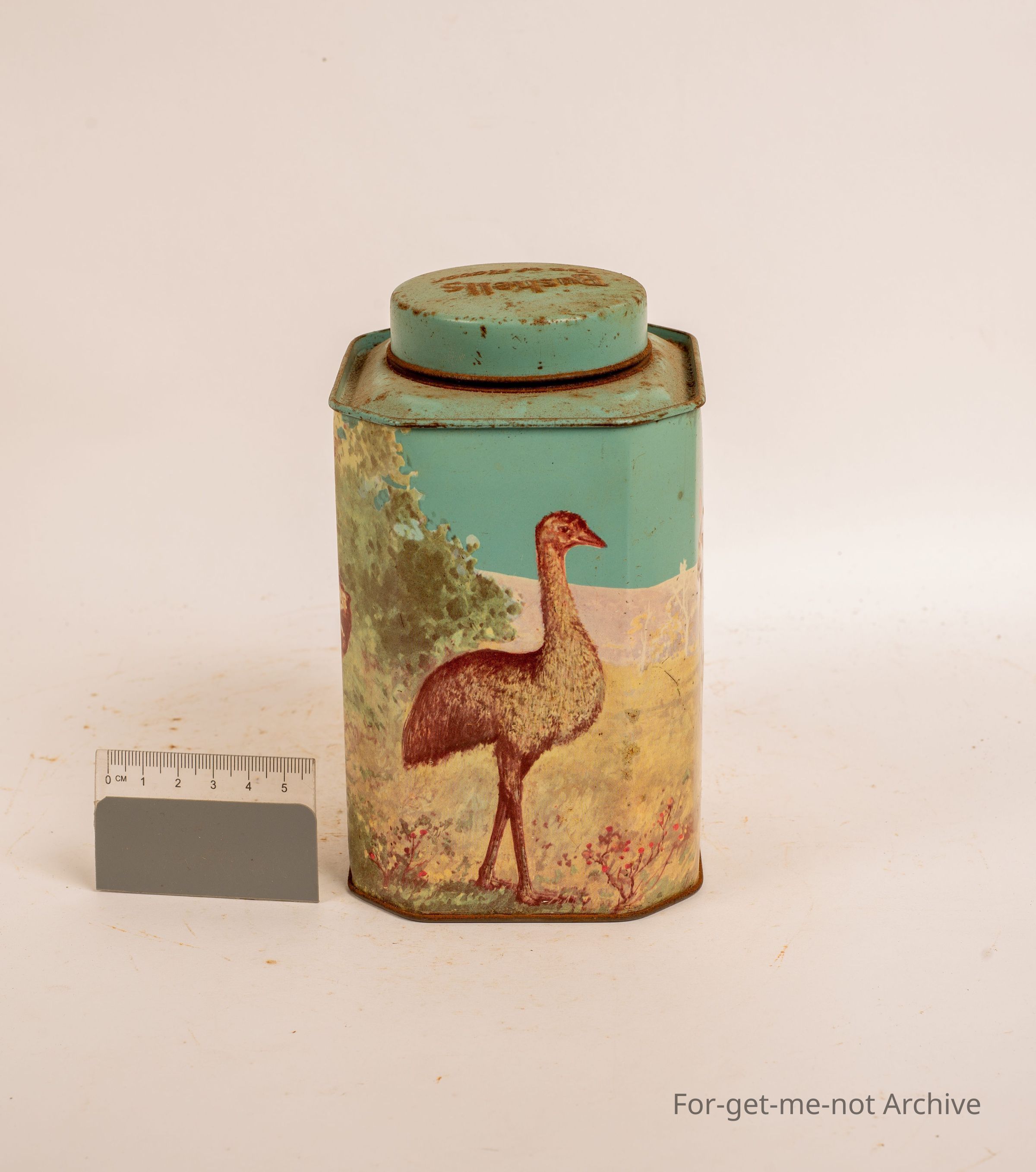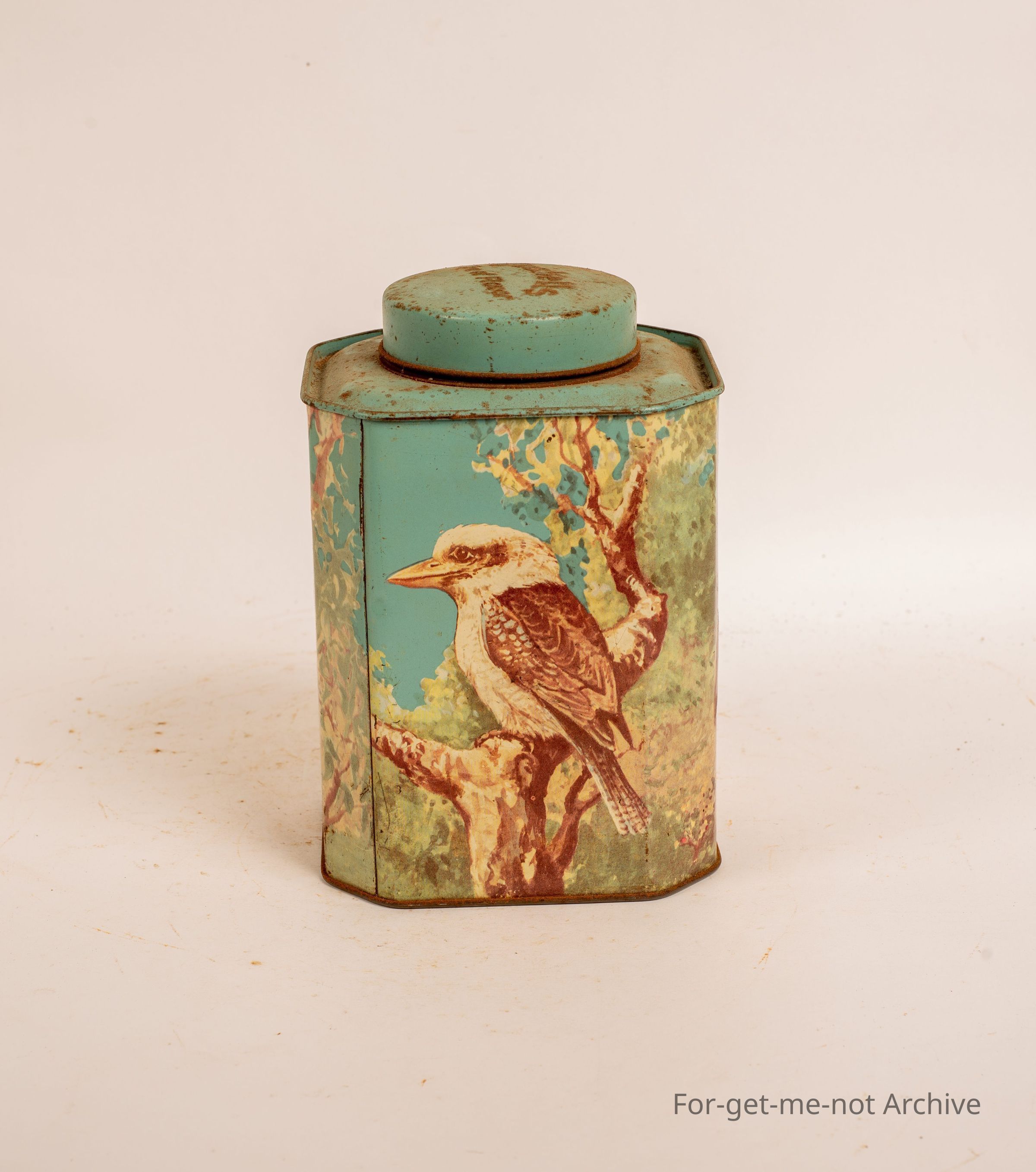 Bushels, domestic, household tea tin depicting Australian fauna and flora.