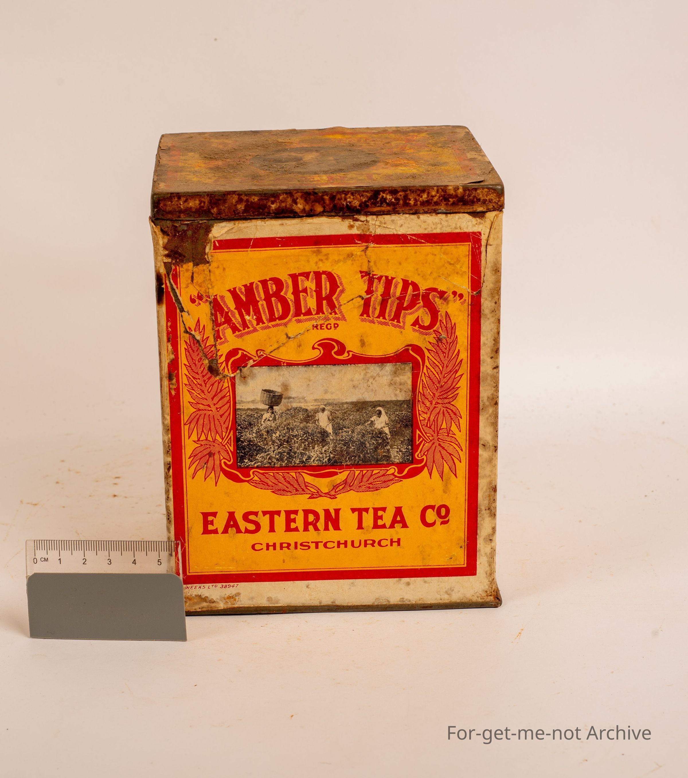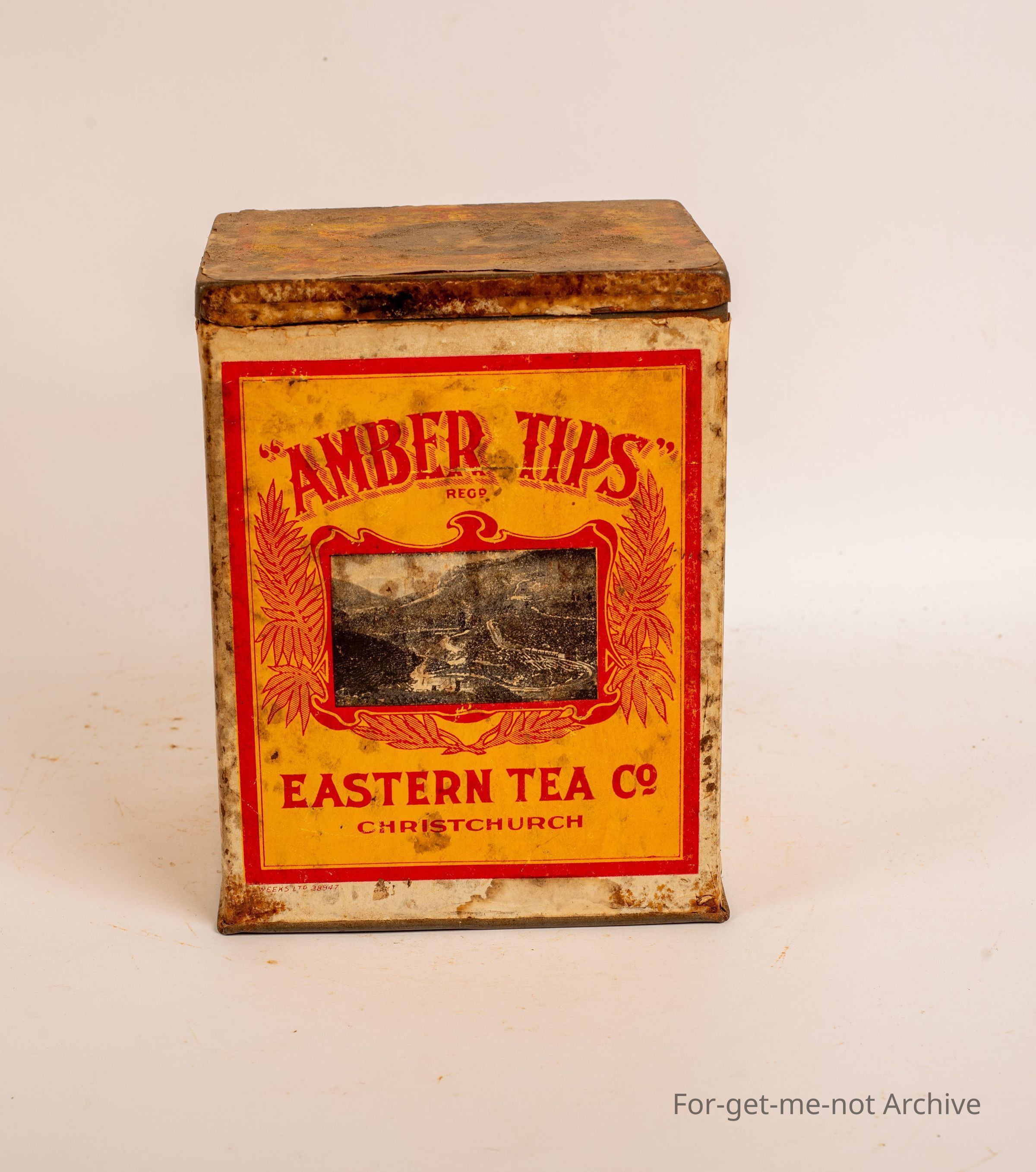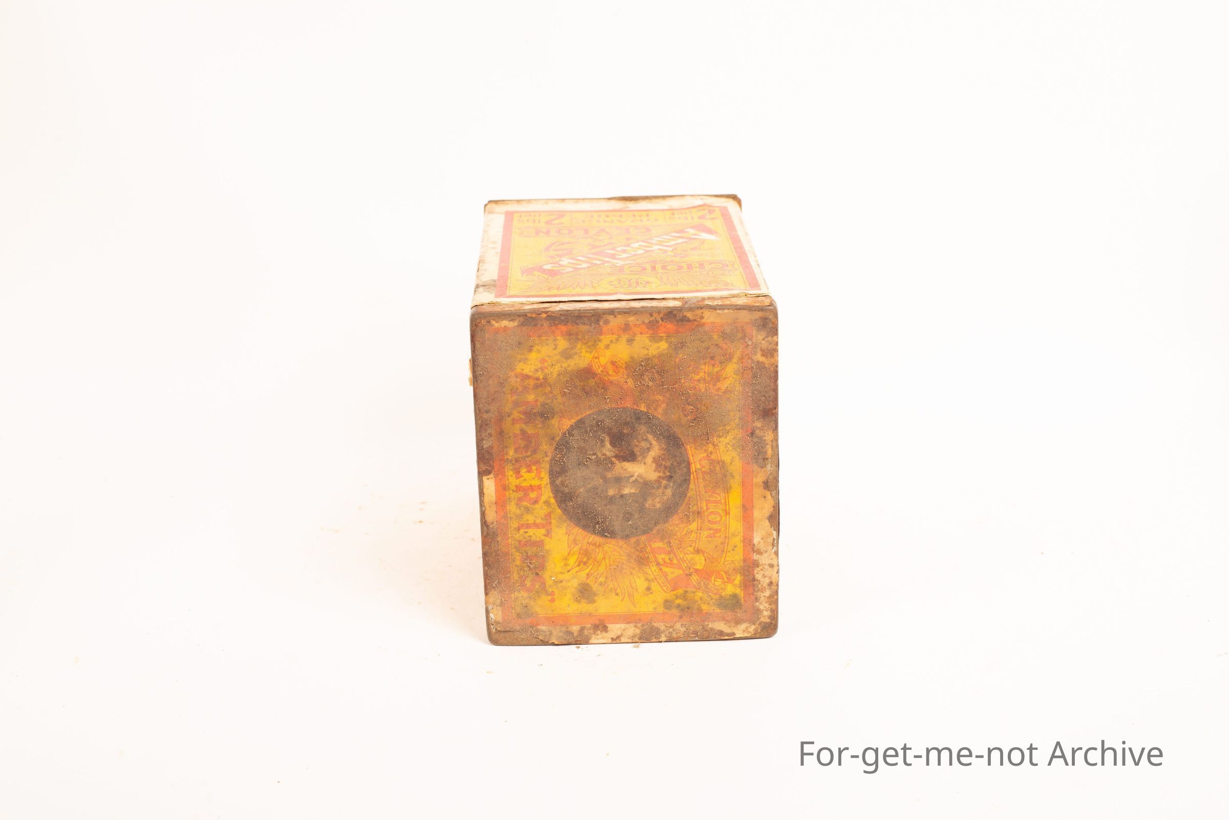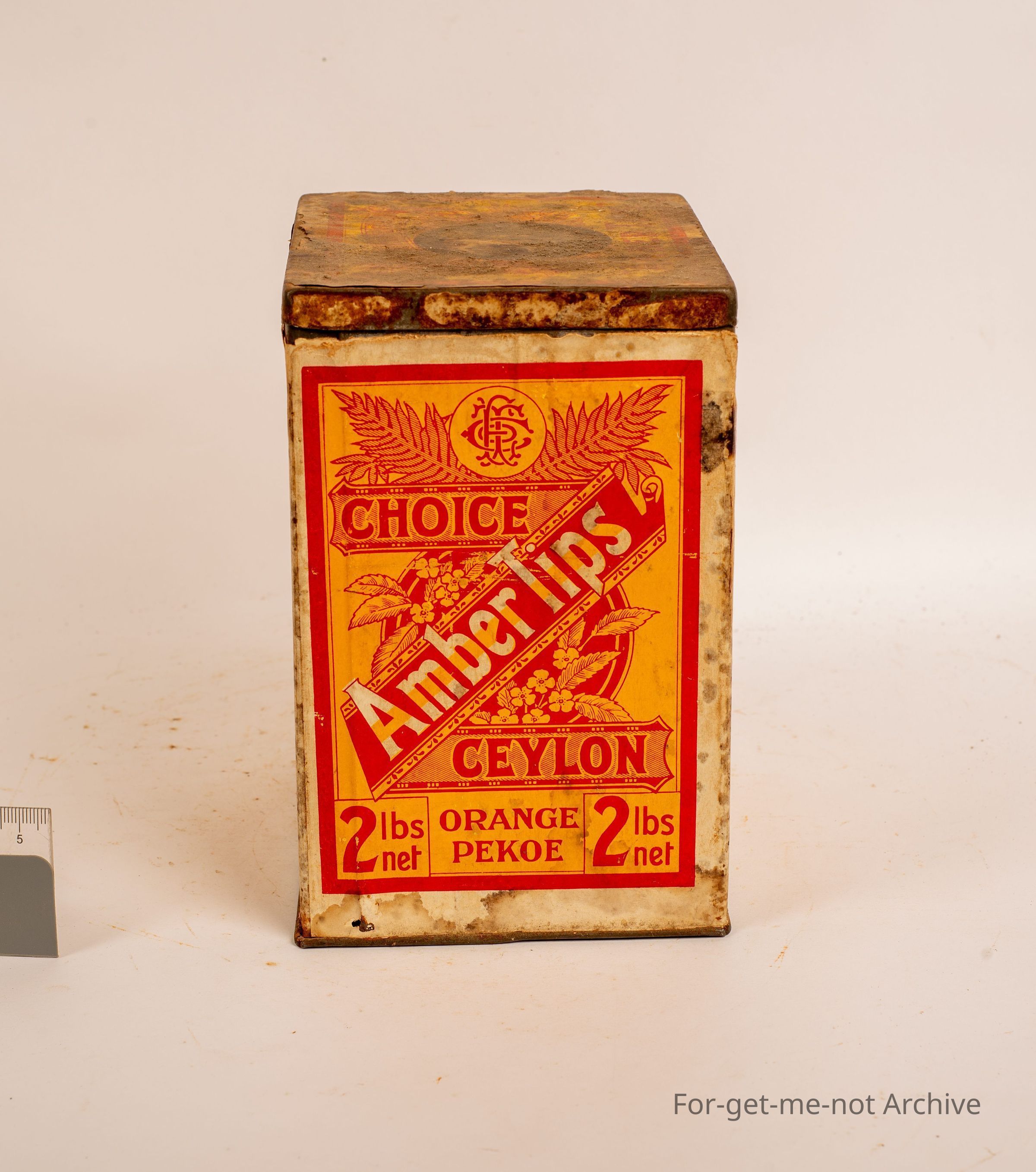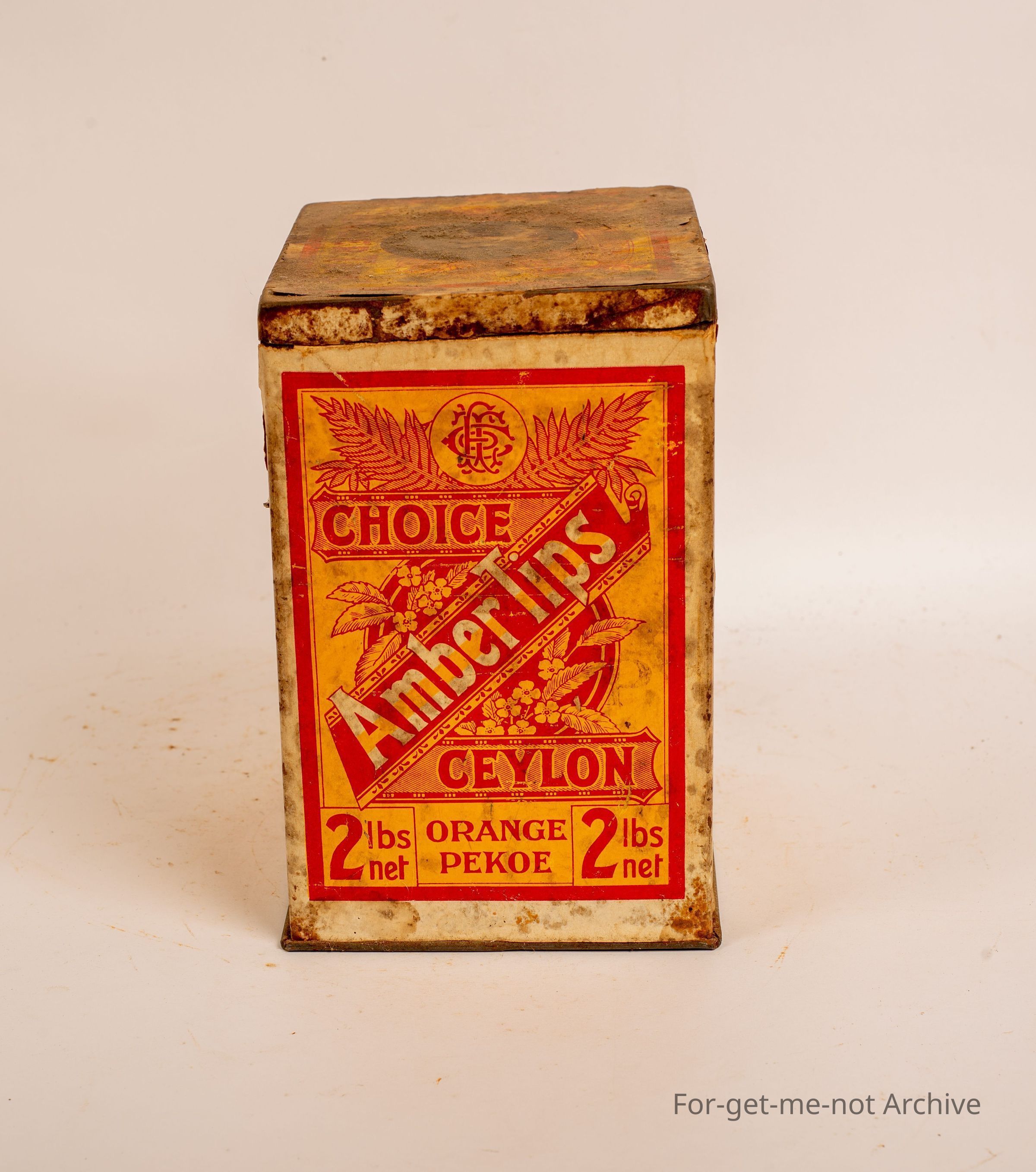 Tea tin 2 lb, Amber tips, Choice Ceylon Eastern Tea Co, quite an unusual tin, paper label Orange Pekoe