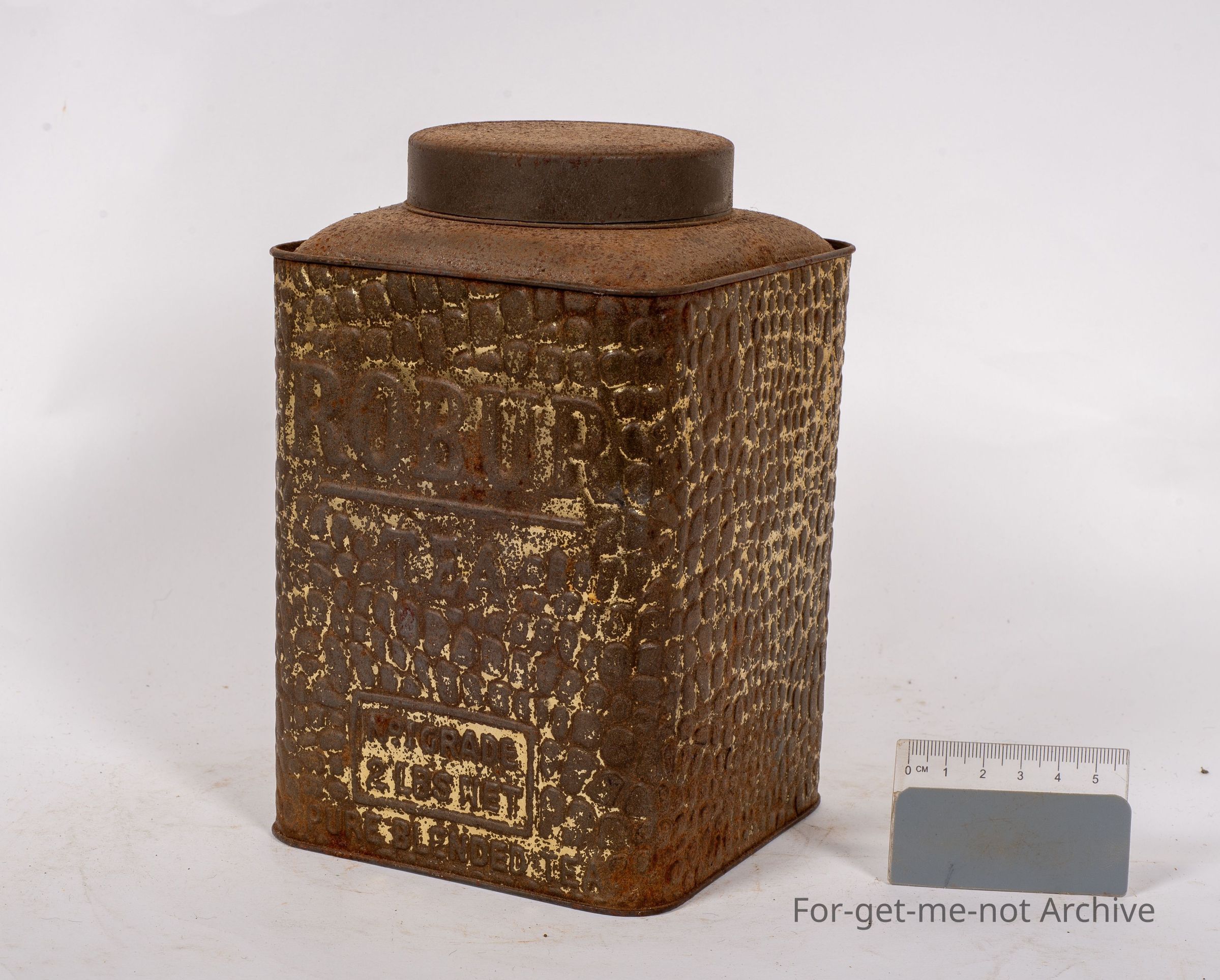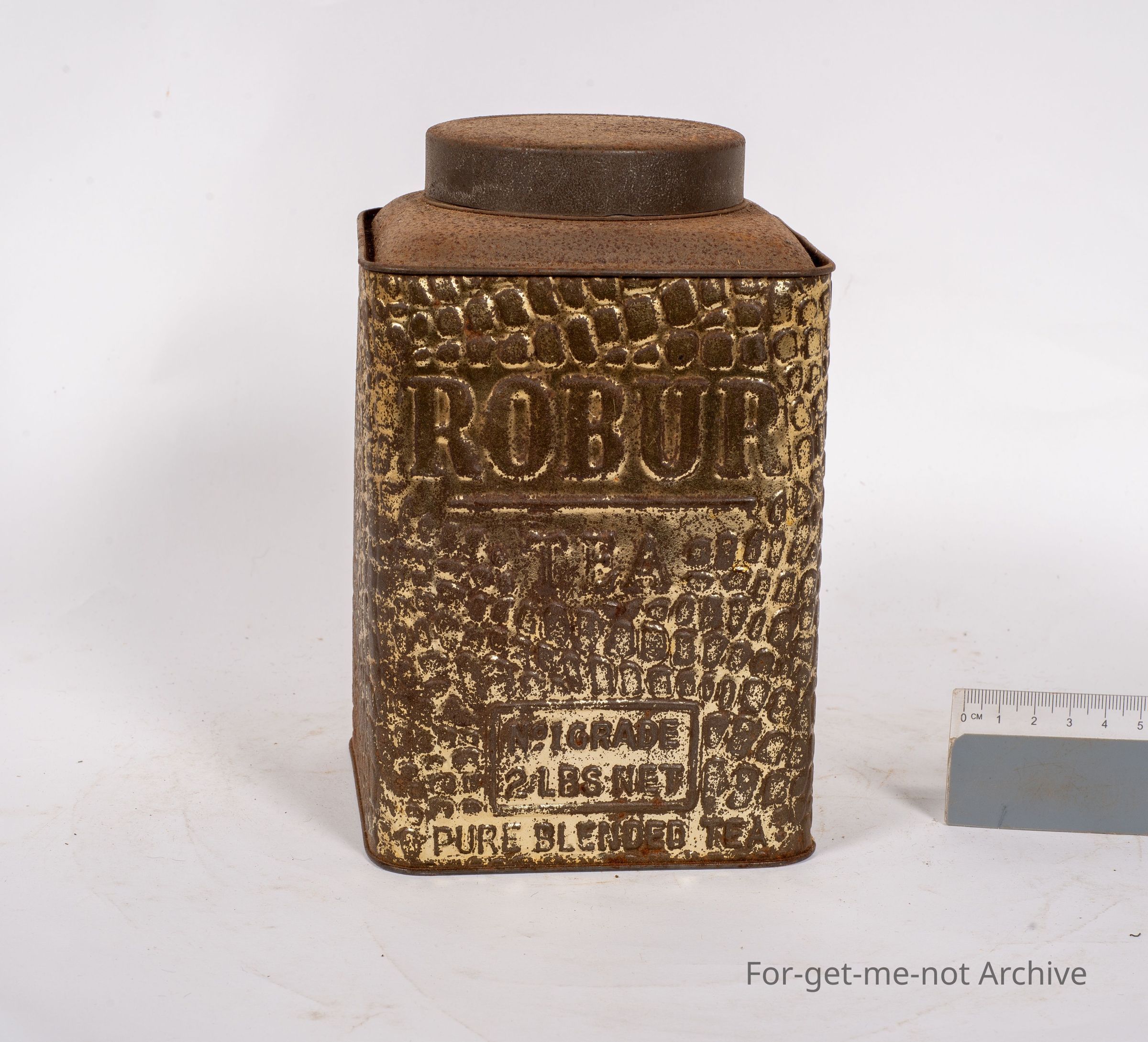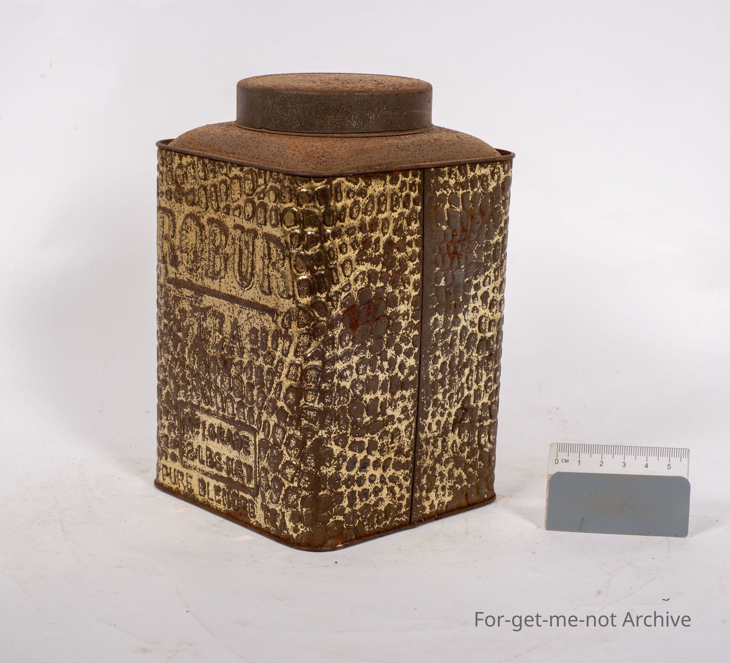 This is a tin of Robour Tea, a 2lb tin. This is heavily decorated with, pressed looking like crocodile skin on the outside. Has the lid.