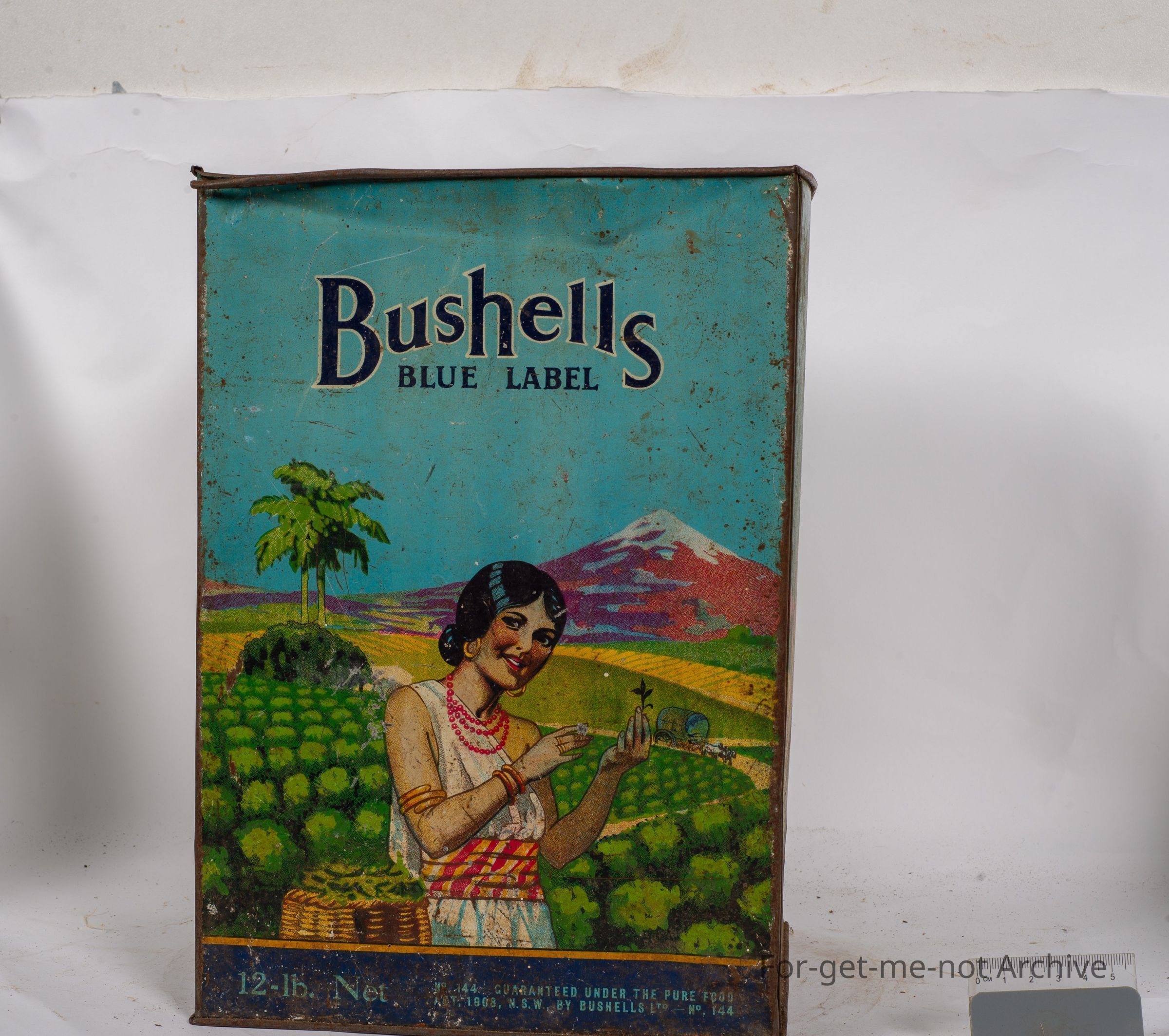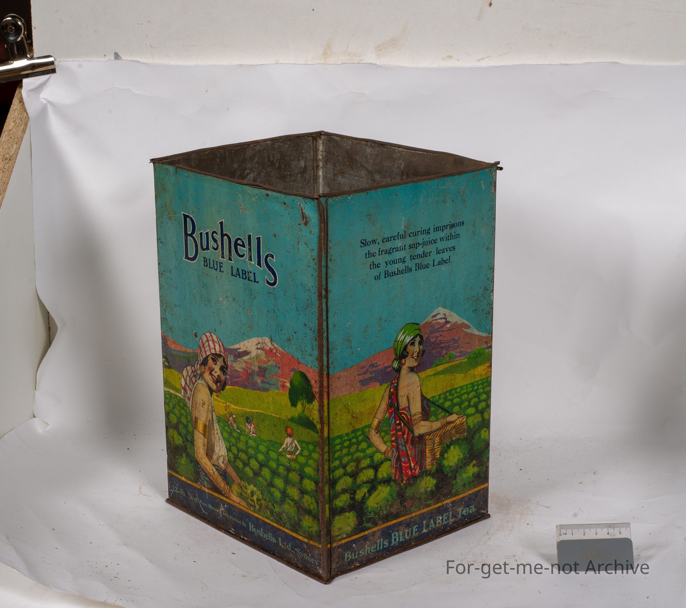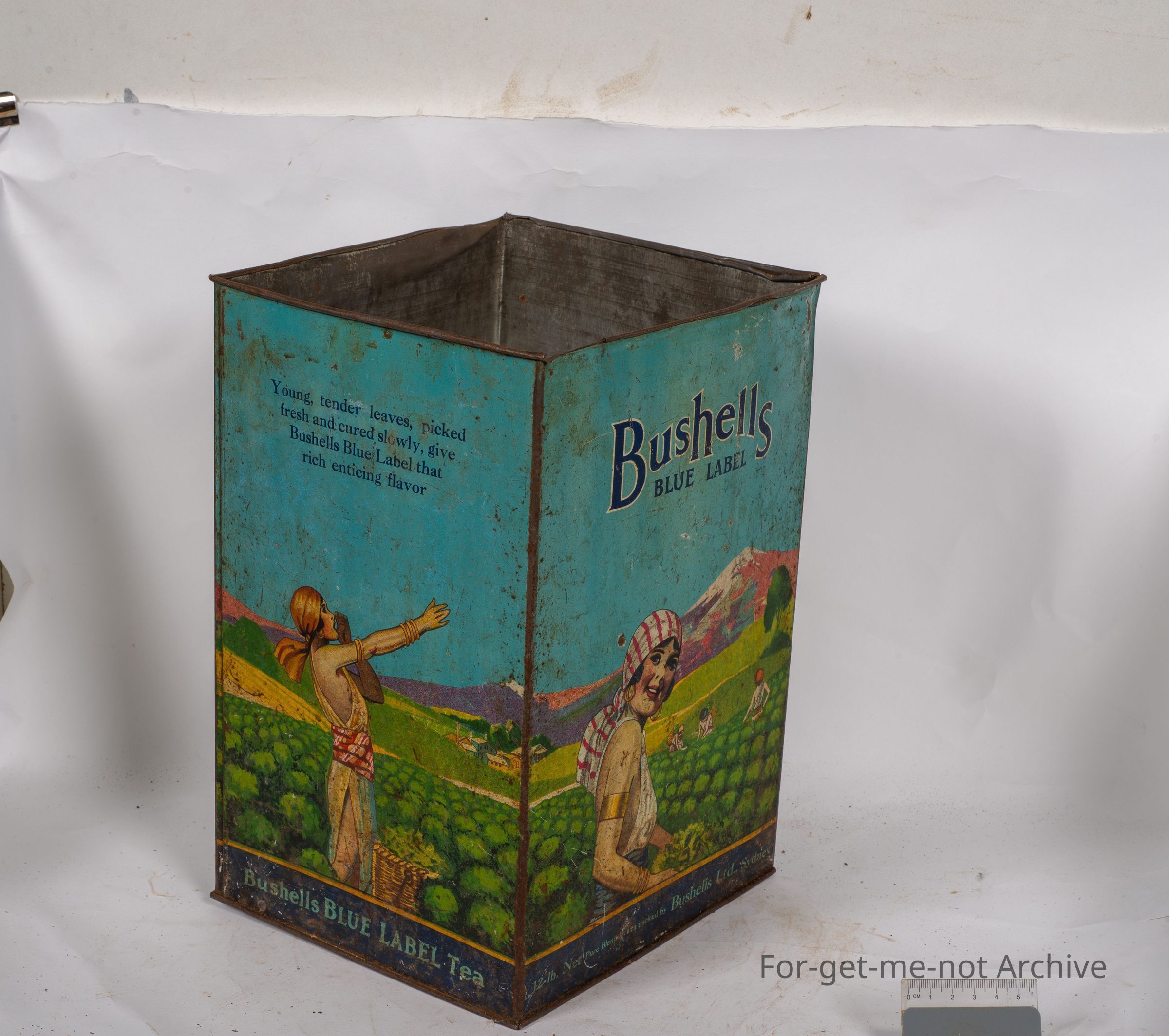 Large bushels tea tin. Square in shape. Graphics of tea pickers with mountains behind all around. This tin, for the age, is in pretty good condition. No lid, but everything else intact. Good day. He's put in a bad way, but he's been in a bad way for a long time. 12lbCollection