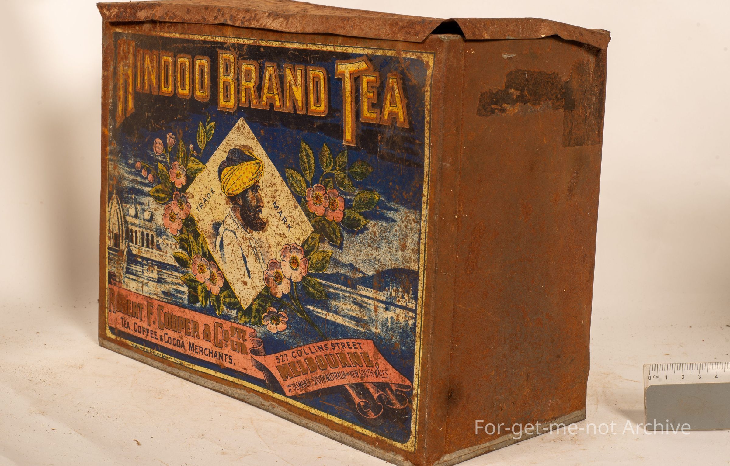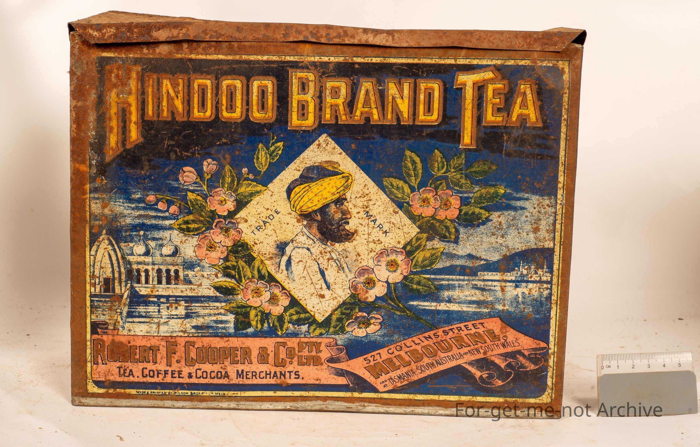 A tea tin, this is quite a rare tea tin as well called Hindoo Brand Tea with an image of a Indian on the front cover with a mosque in the background. The address is 527 Collins Street, Melbourne. Packed by Robert F Cooper and Co Pty Ltd Tea and Coffee and Cocoa Merchants, this tin has been manufactured by Wilson Brothers, North Melbourne. Rare early tin,Collection