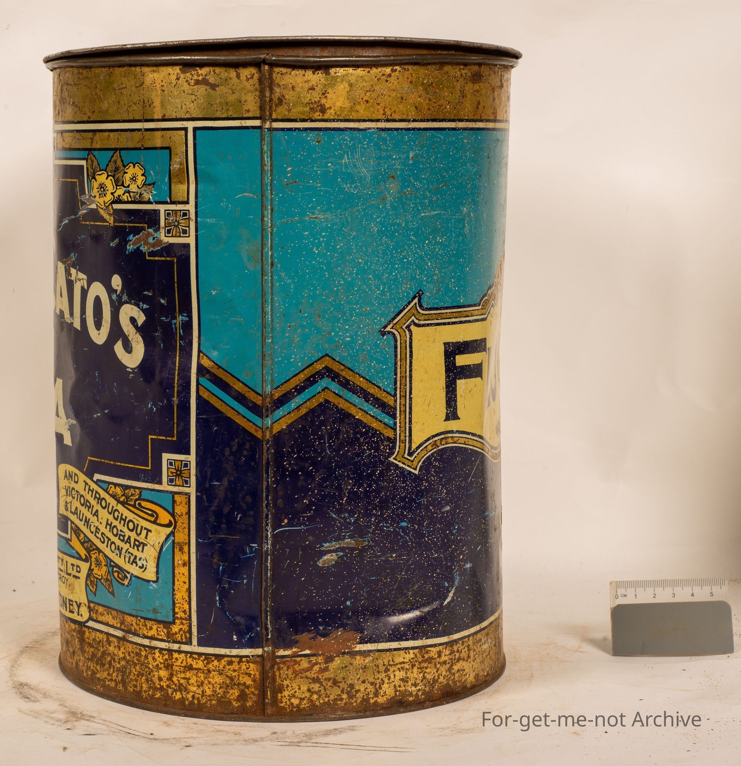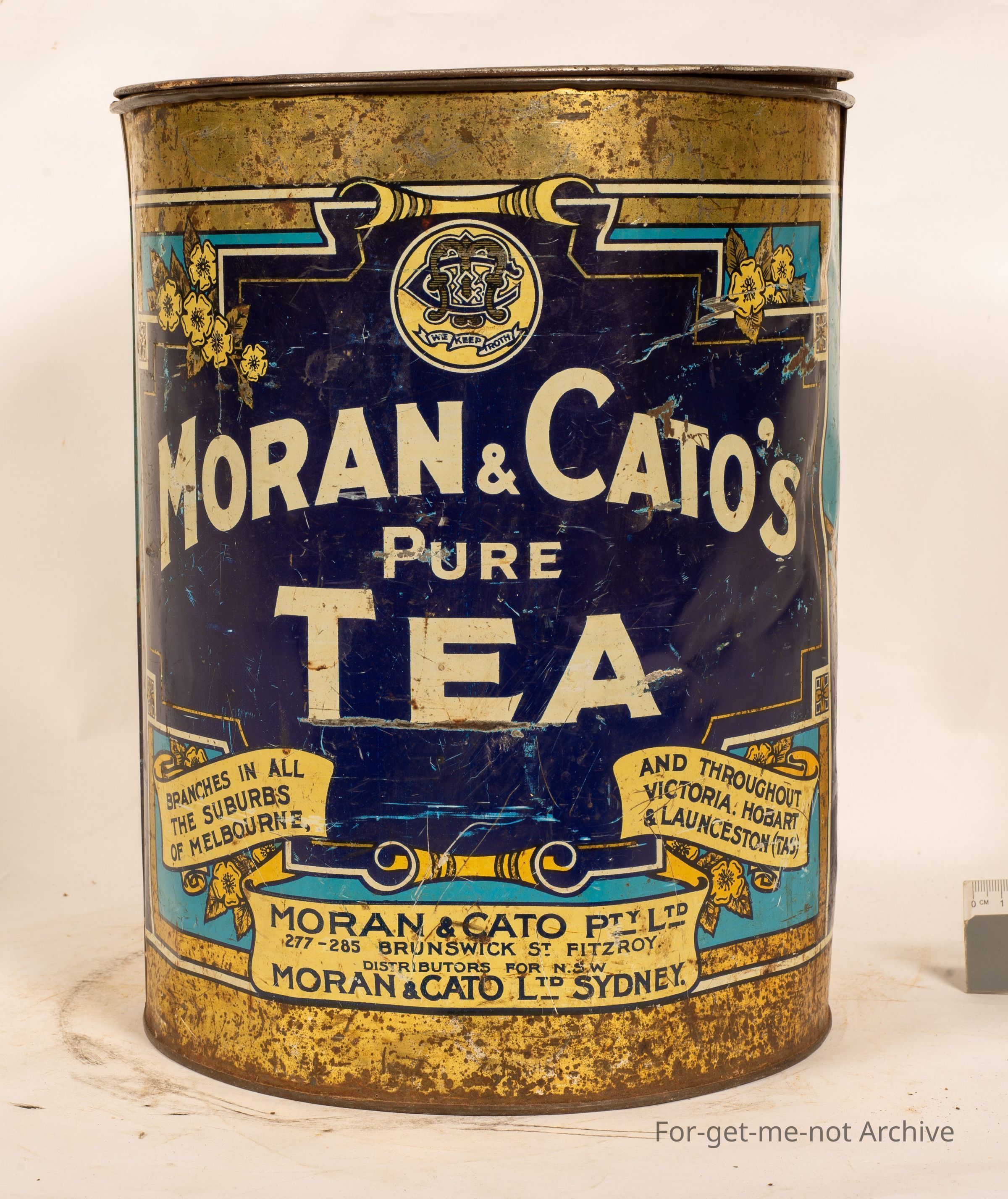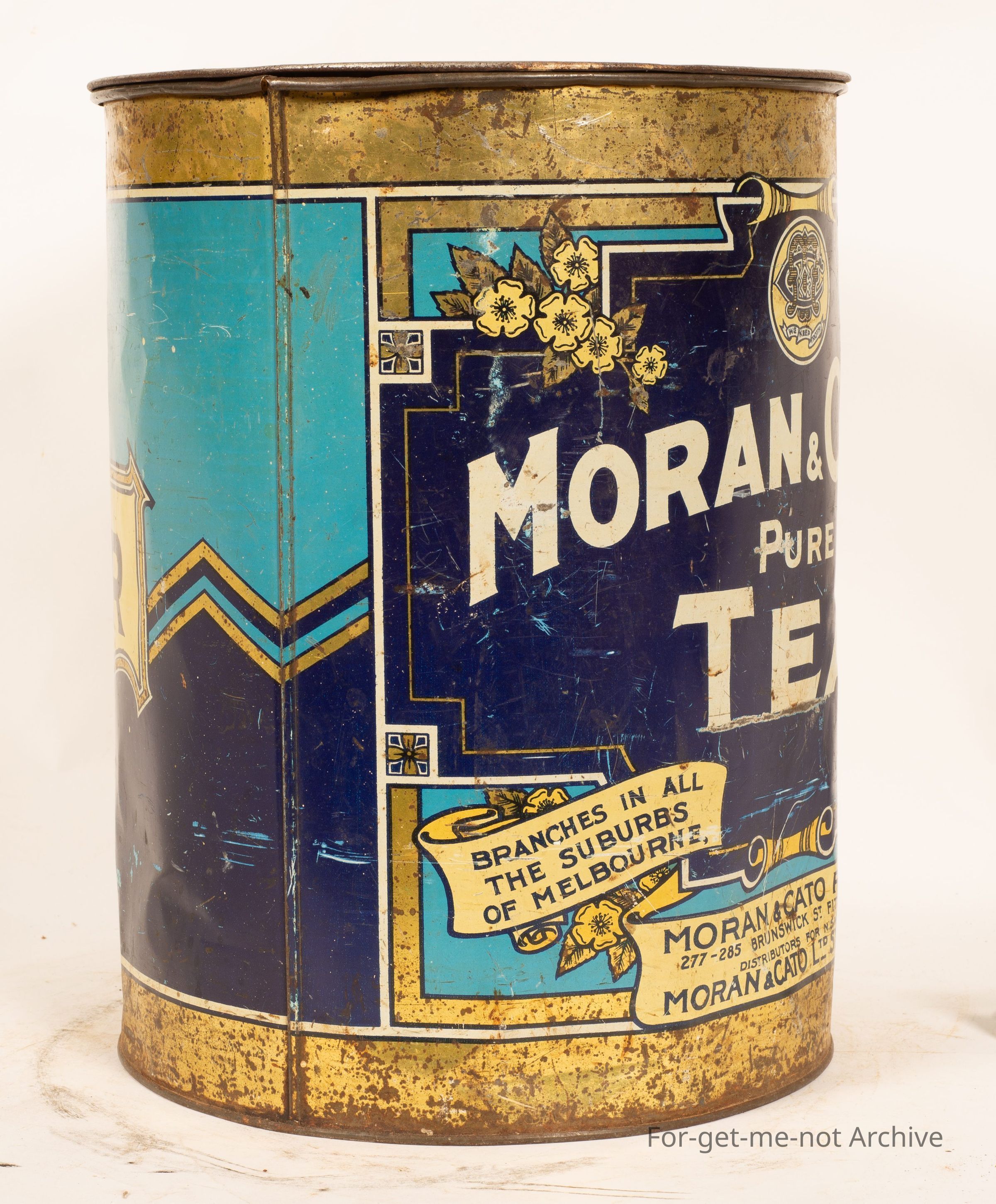 This is a large tea tin from Moran and Kato. They were from Brunswick Street, Fitzroy. Branches in all suburbs of Melbourne. On the other side of this tin, it can be used for storage for flour. In reasonable condition.Collection