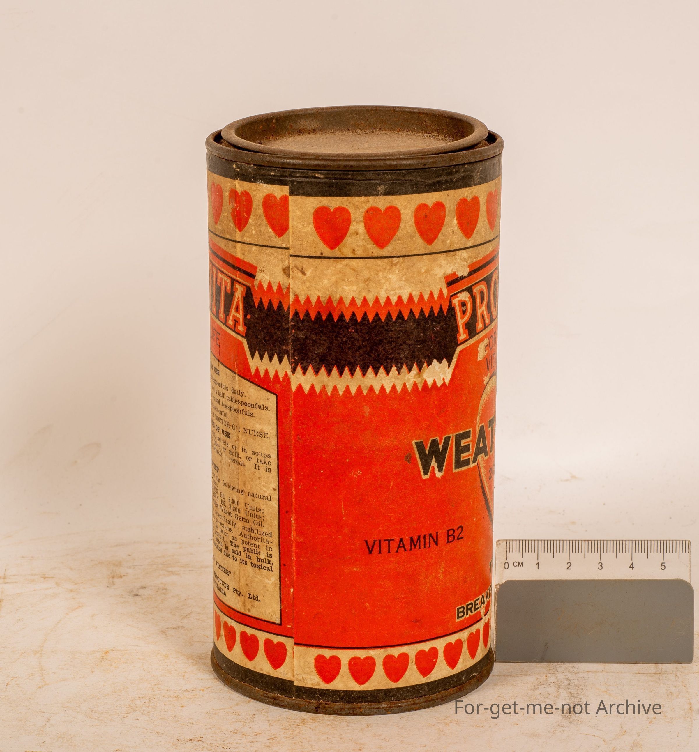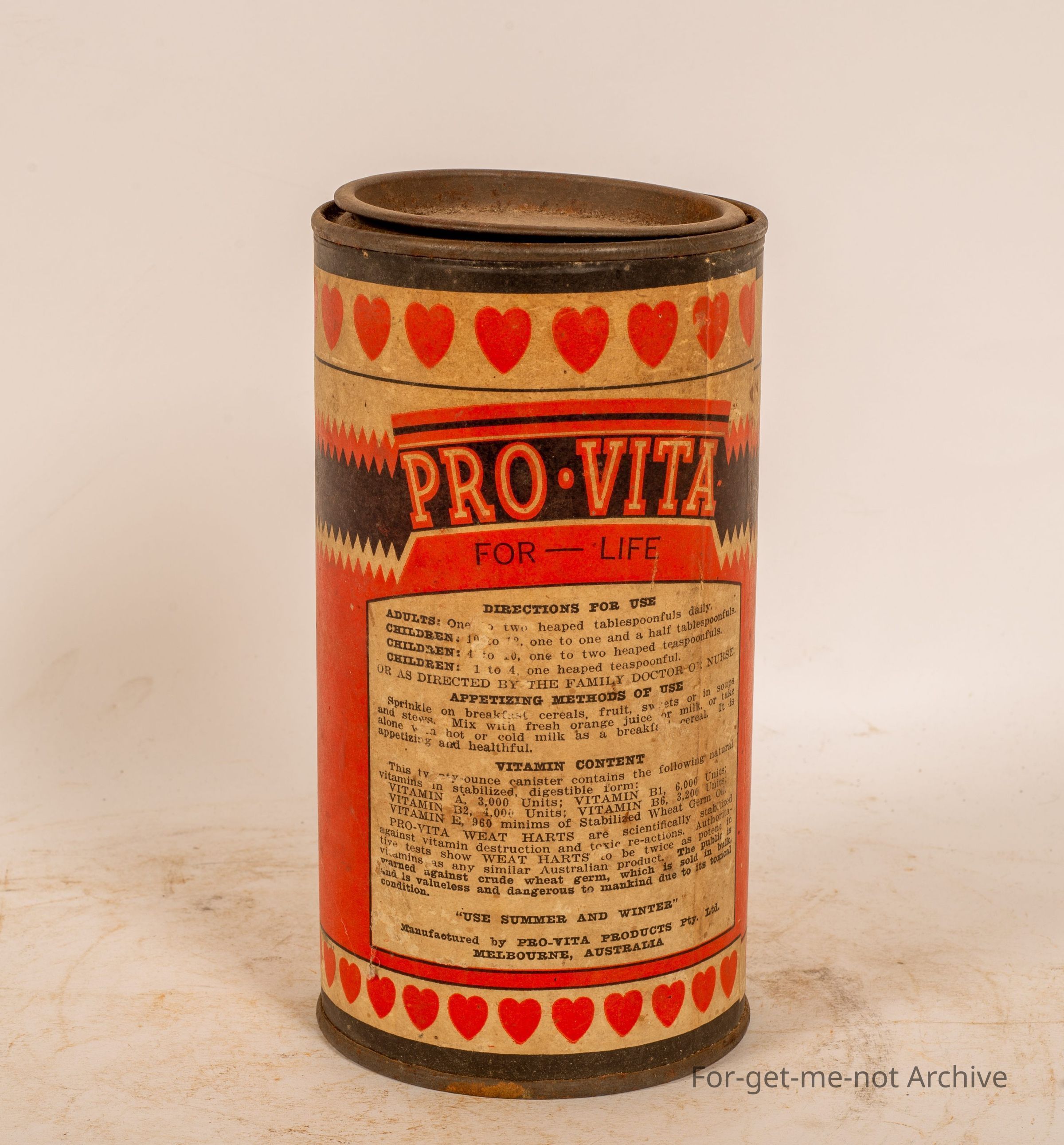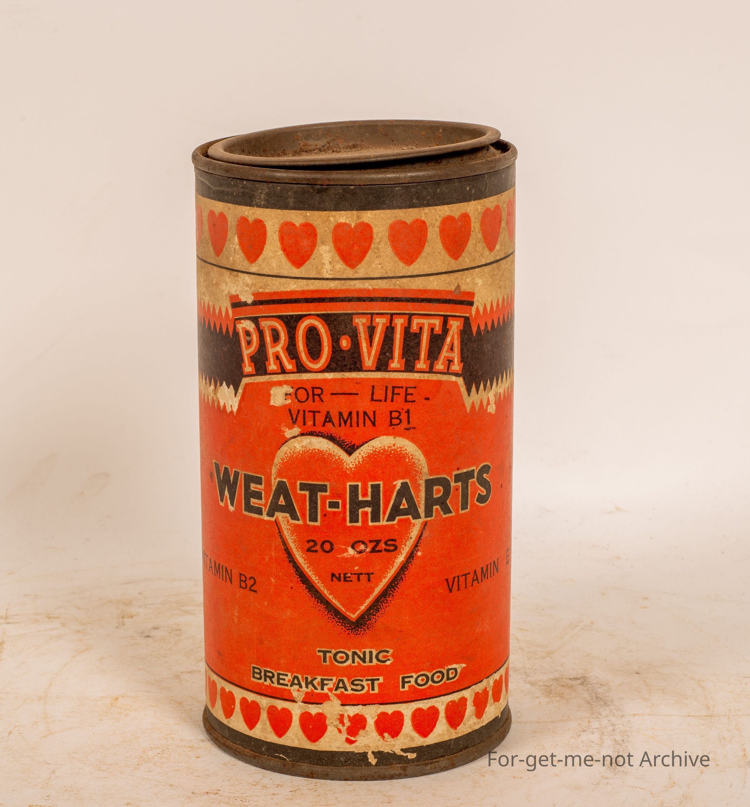 This is a tin of Pro-vita. Vitamin B1 Wheat Hearts 20 ounces net tonic breakfast food. This is probably not a very common tin. It is a paper label in very good condition considering it would be from an early period.Collection