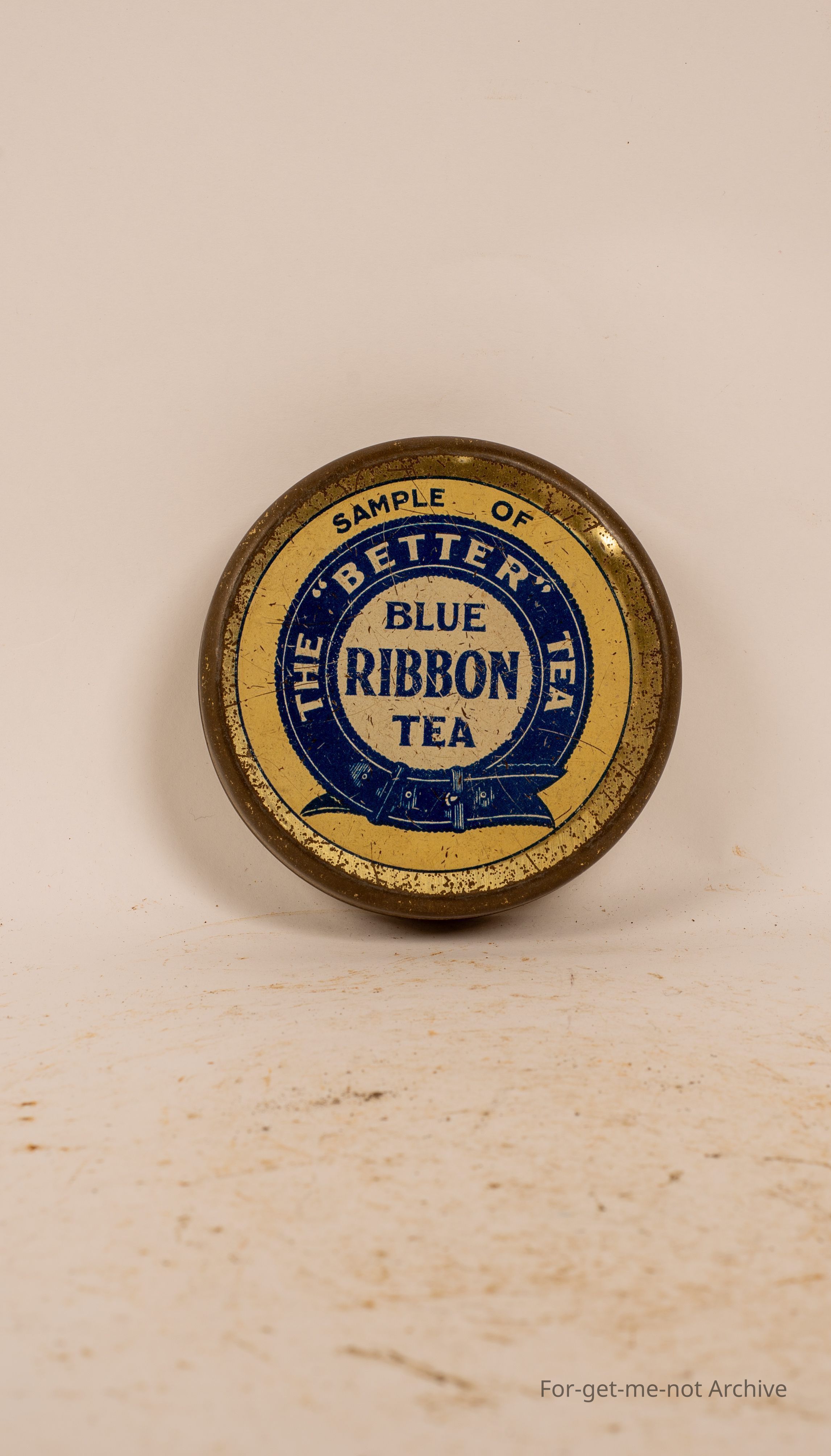 Sample tin of the Better Tea, Blue Ribbon Tea. Lovely sample tin. Package of the tea depicted on the back of the tin.