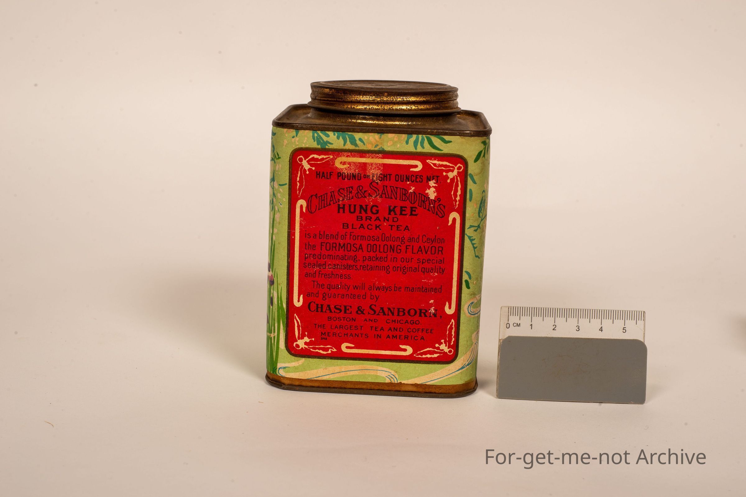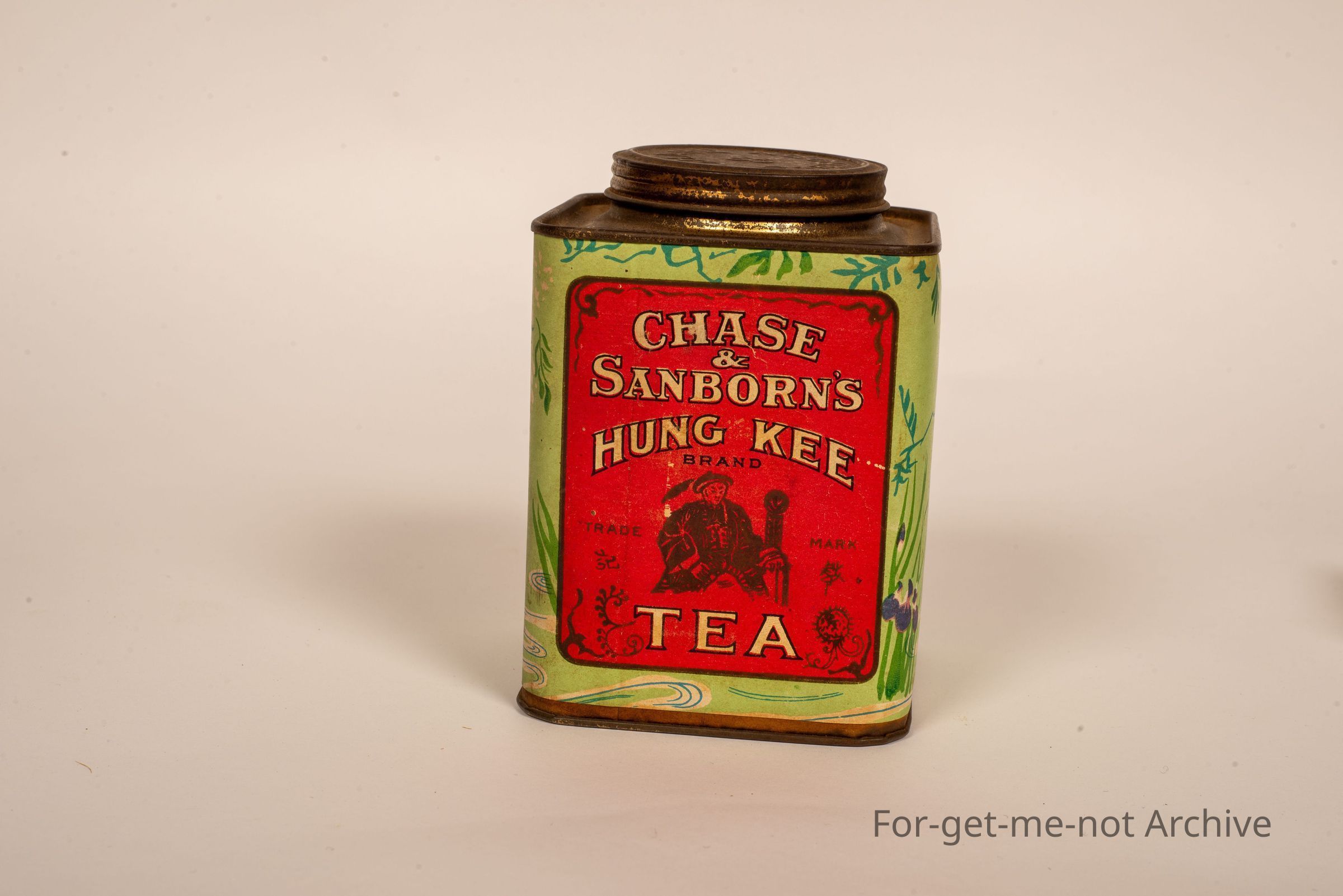 Is a tea tin from Chase and Sanborn's Hung Kee Brand Tea. Paper label packed in Boston and Chicago, the largest tea merchant in America. An interesting tin embossed on the lid with Chase Sanborn,Collection