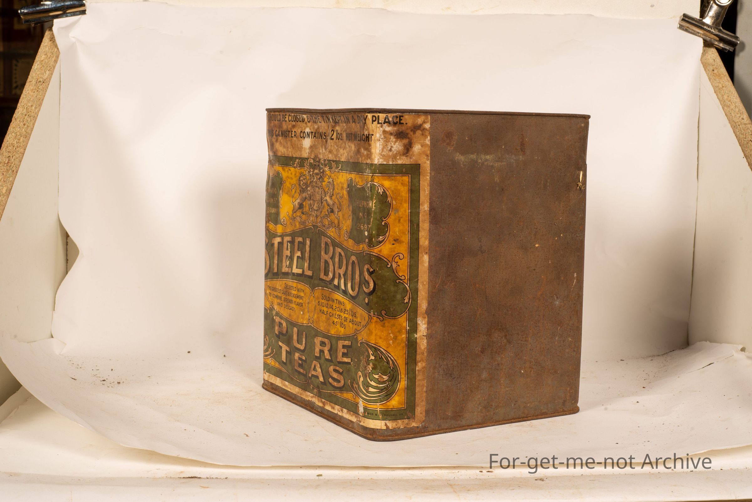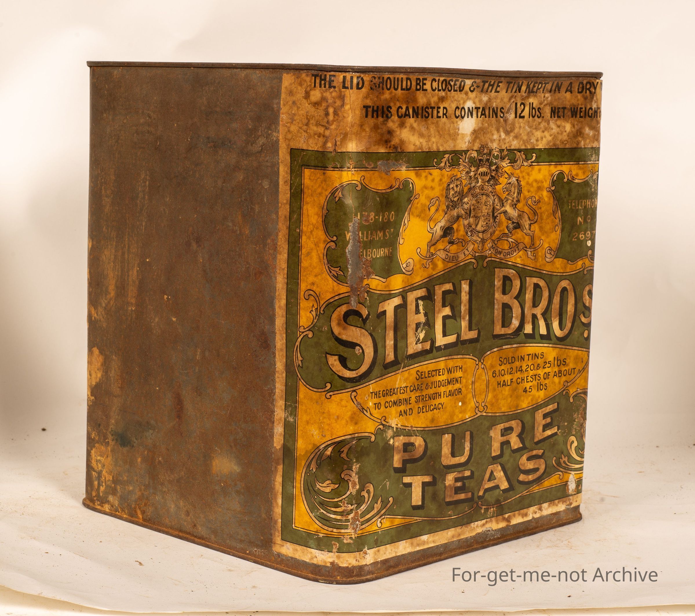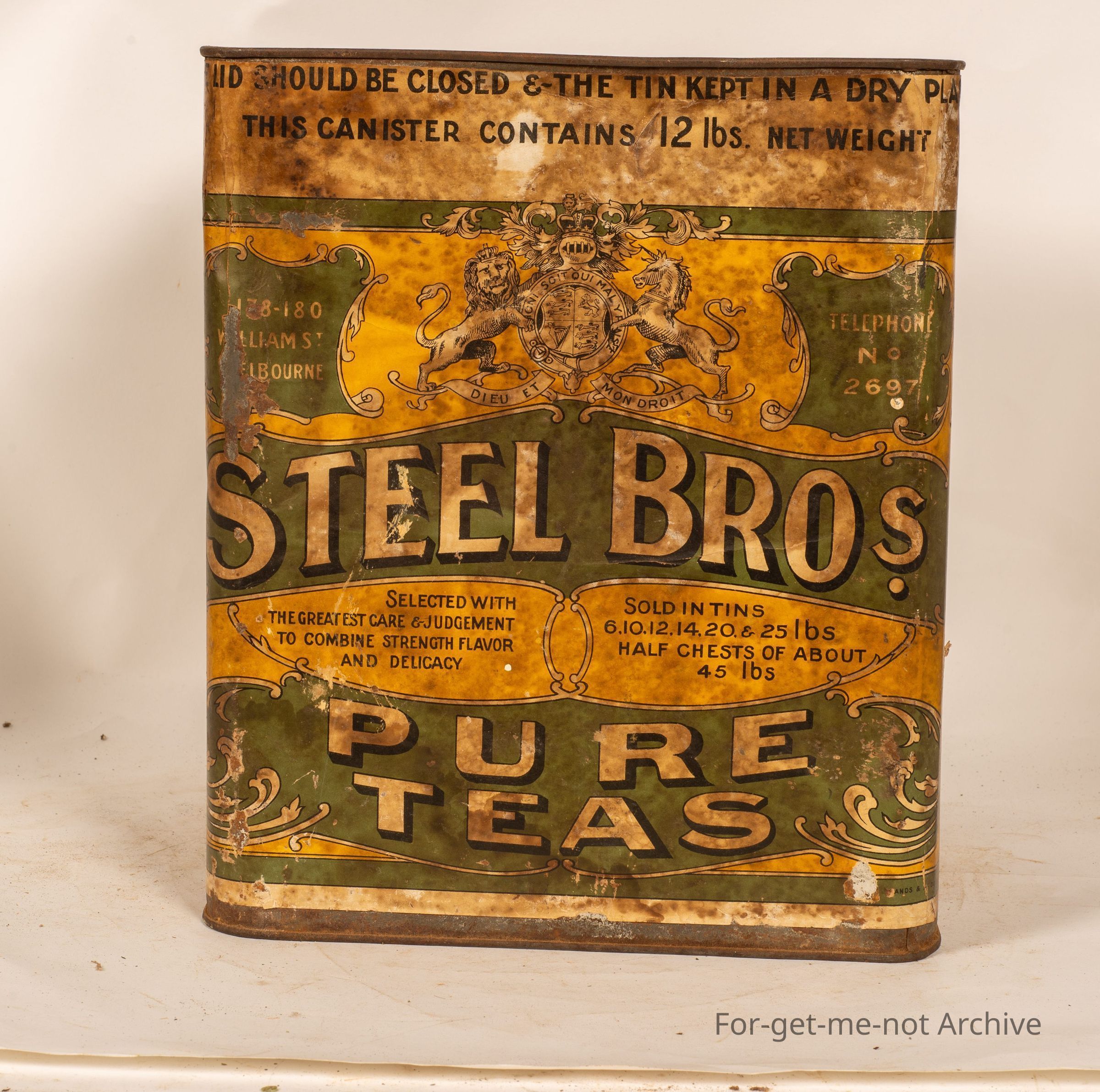 This is a large I should imagine, about a 12lb tin of tea from Steel Brothers Pure Teas. The British coat of arms, on the paper label. The tin itself is in pretty good order. This is meant to be quite a rare Melbourne tin, 180 William Street, Melbourne with a phone number of 2697. This is a 12 pound tin. This tin came from, Bill at Oraroo in South Australia.Collection