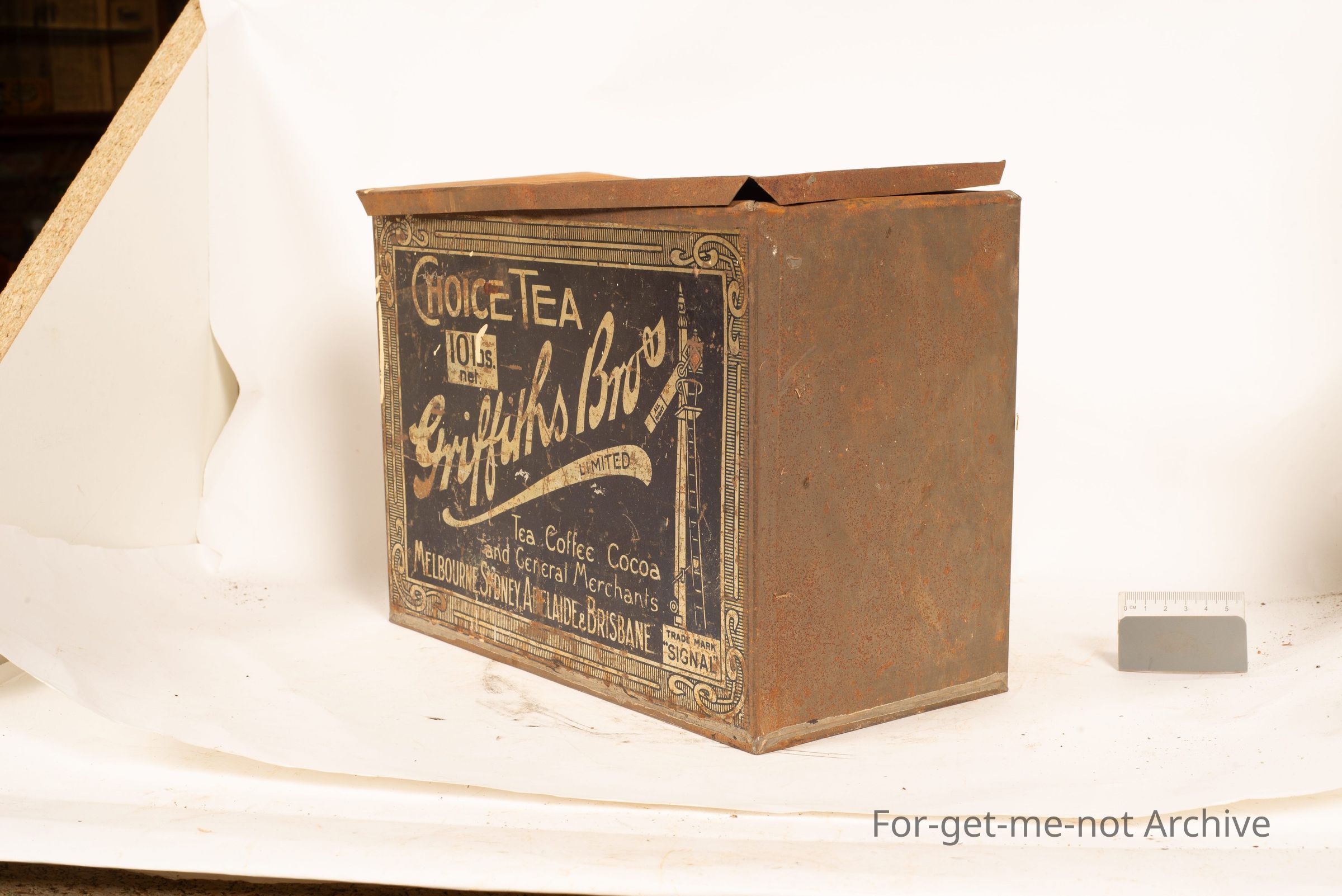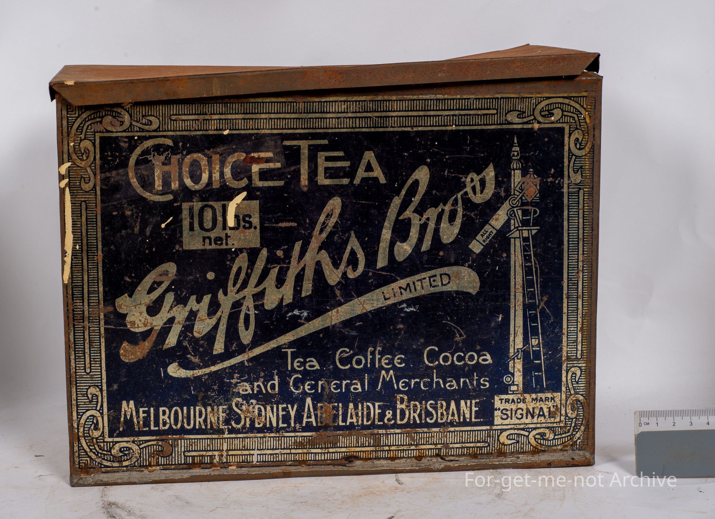 This is a tin, a tin of Griffiths Brothers, Choice Tea, Melbourne, Sydney, Adelaide, and it trades under the Signal brand. The unusual feature of this is the shape of the tin and the black paint. Not a common tin from Griffiths Brothers. This would be very early.Collection