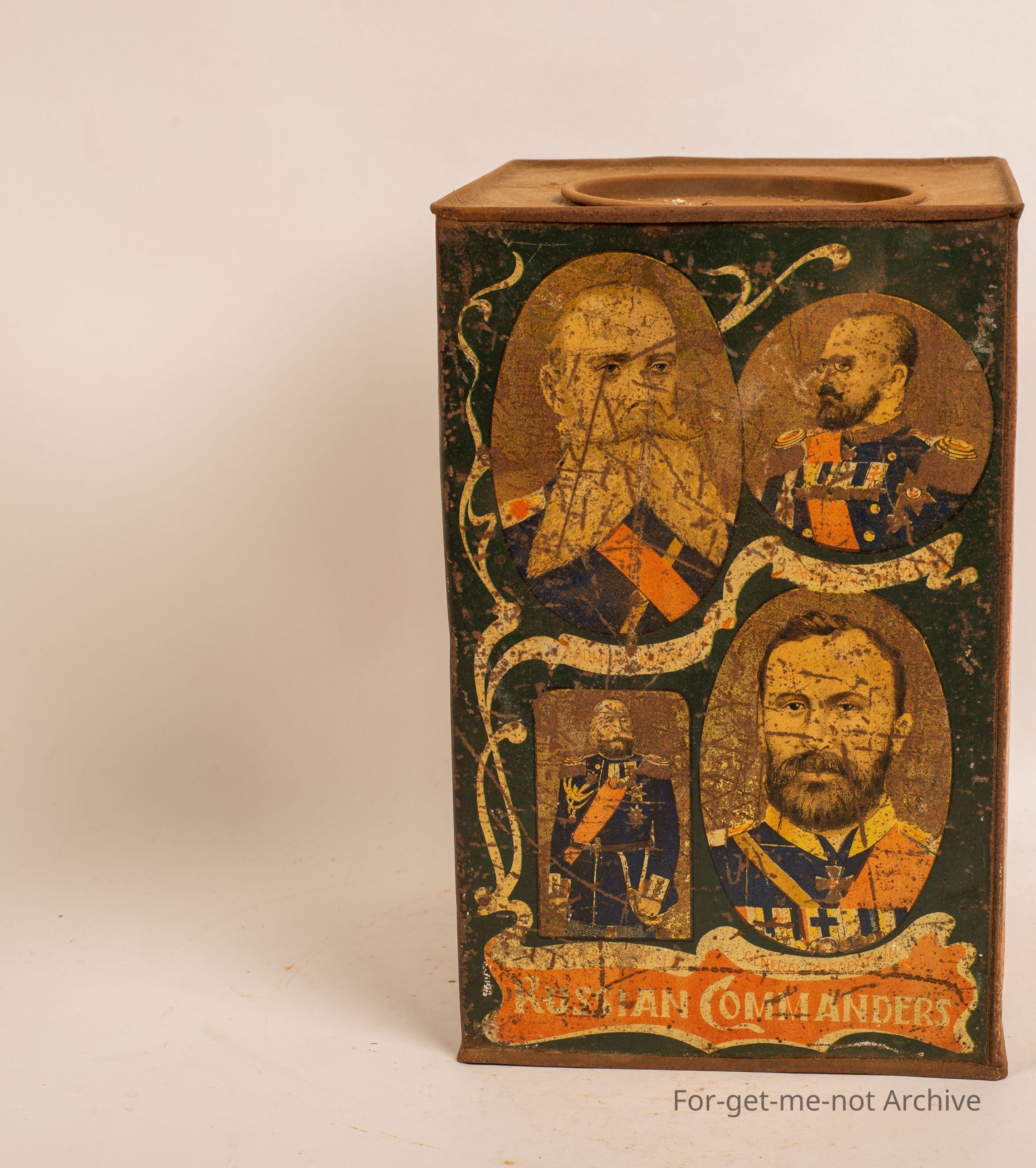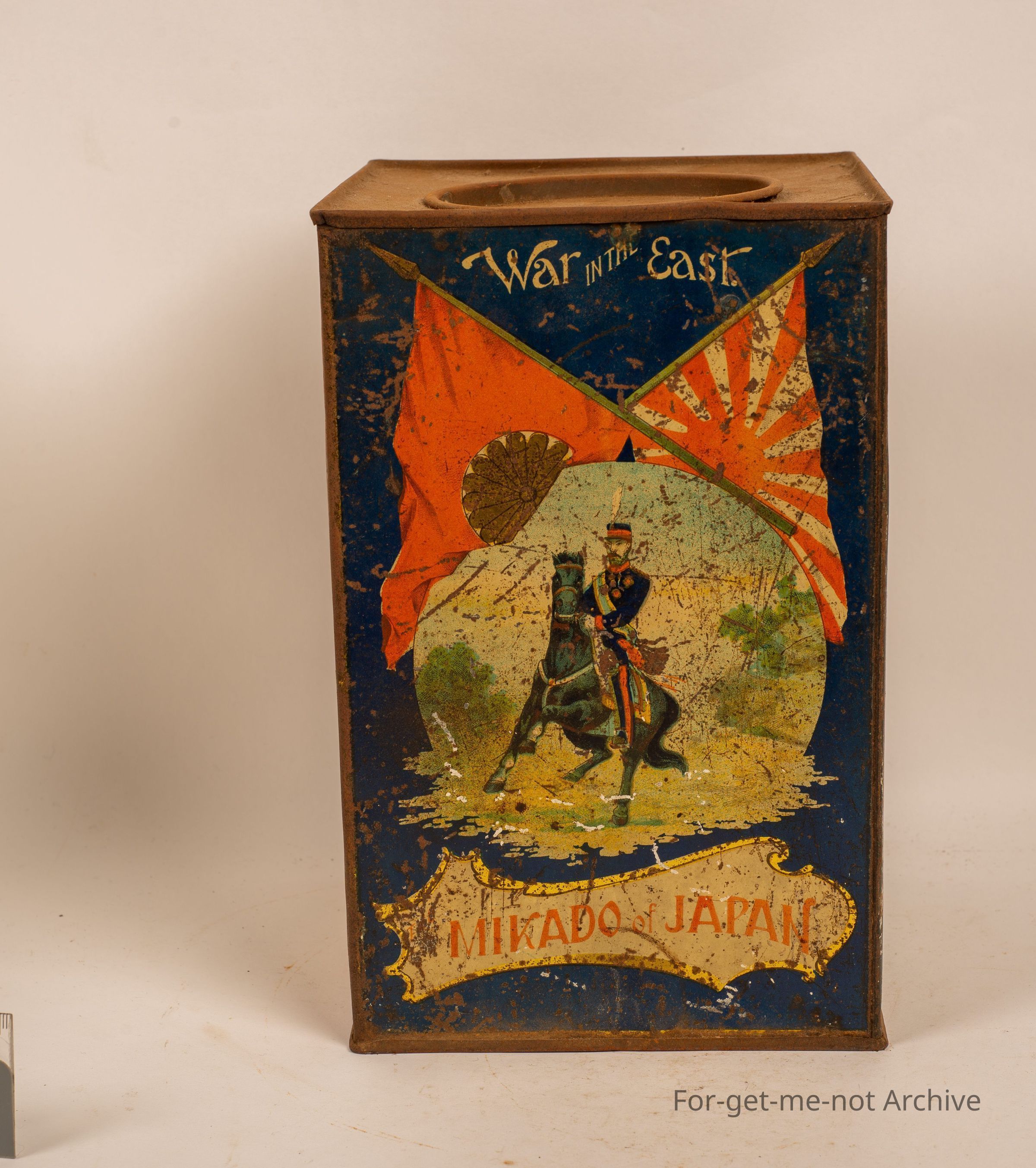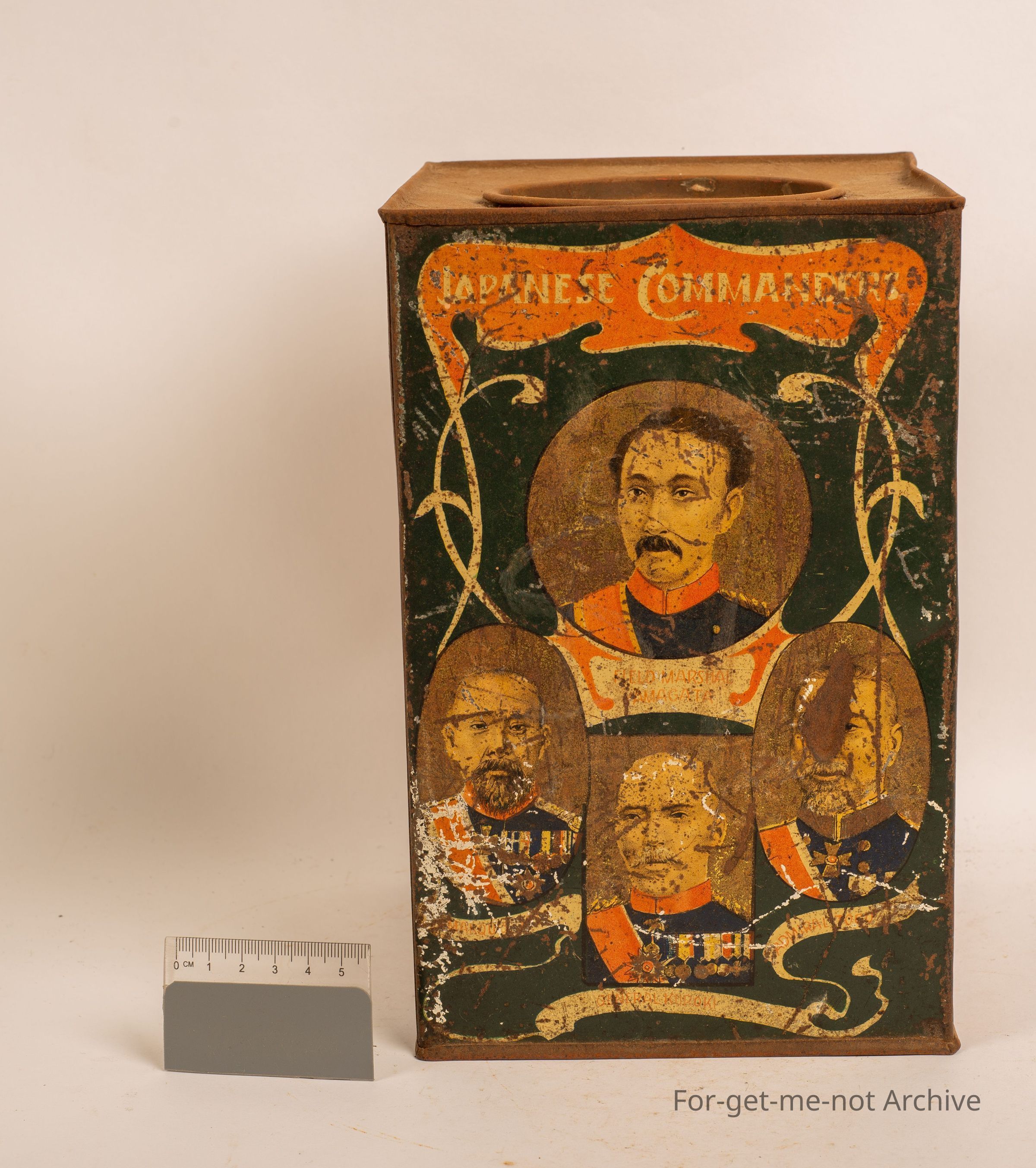 Large tea tin depicting images from war in the East, depicting Japan. The Sino War. With scenes from and generals from the Sino War. it's unusual.