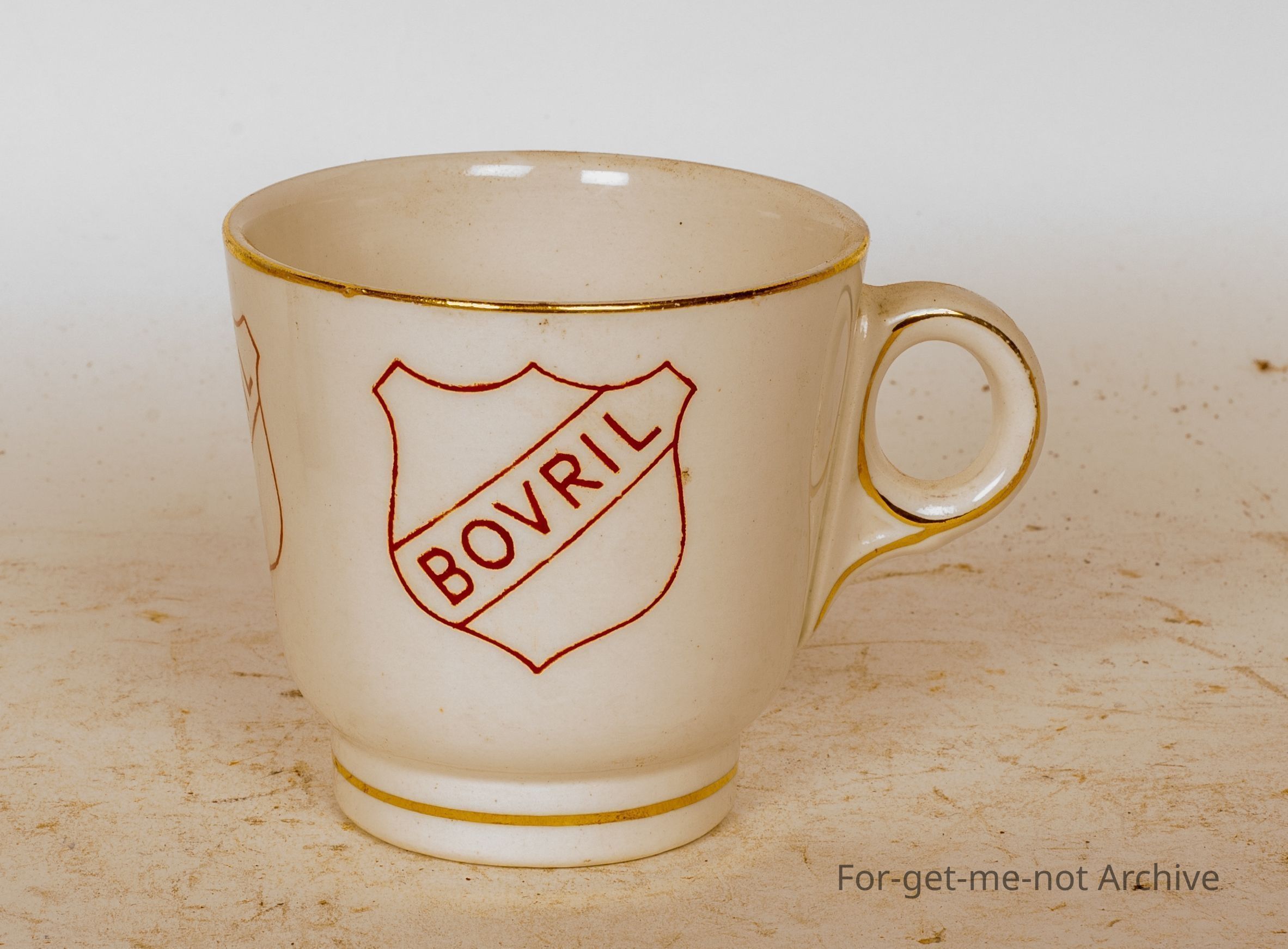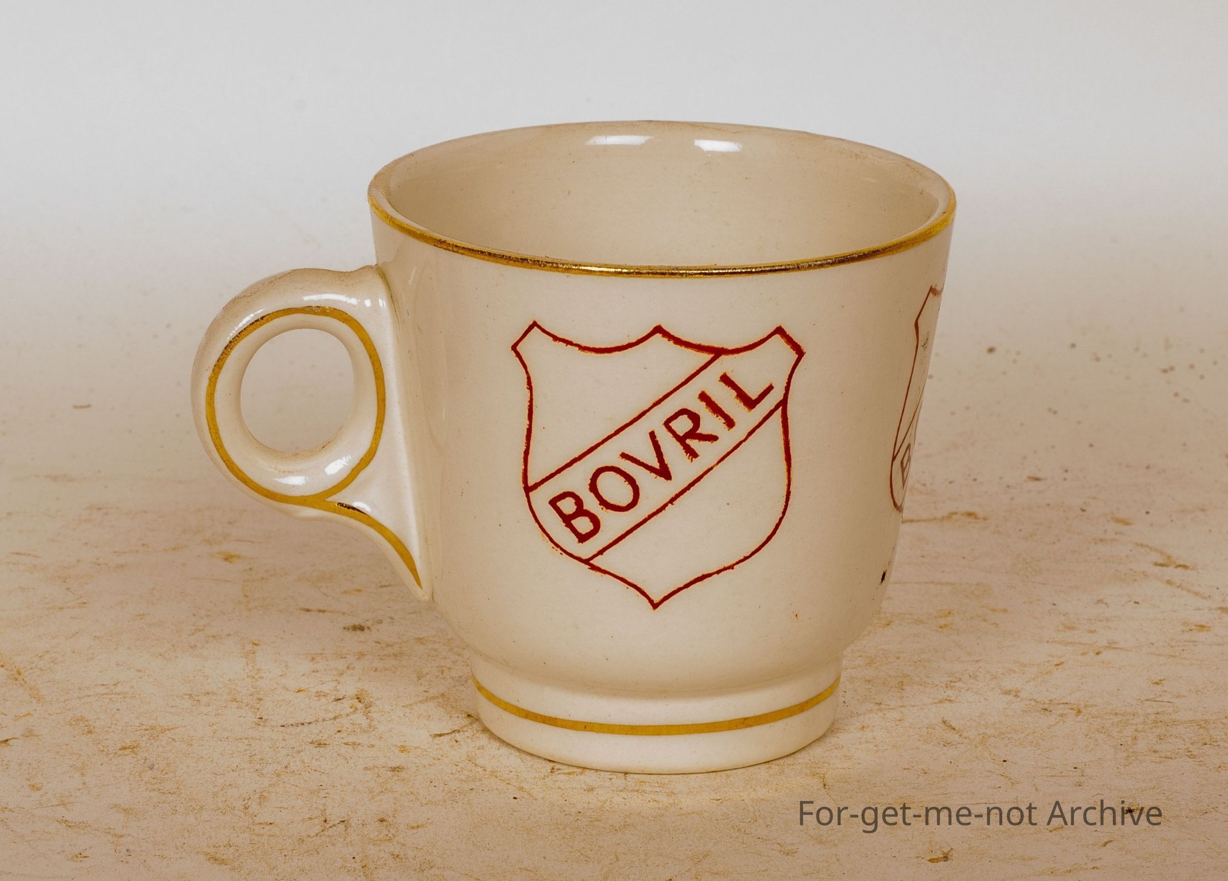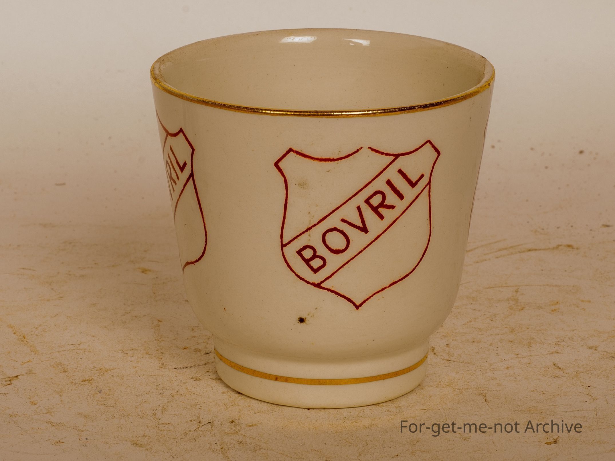 This is a small teacup, ceramic advertising, "Bovril" in, shields around the perimeter of the cup.