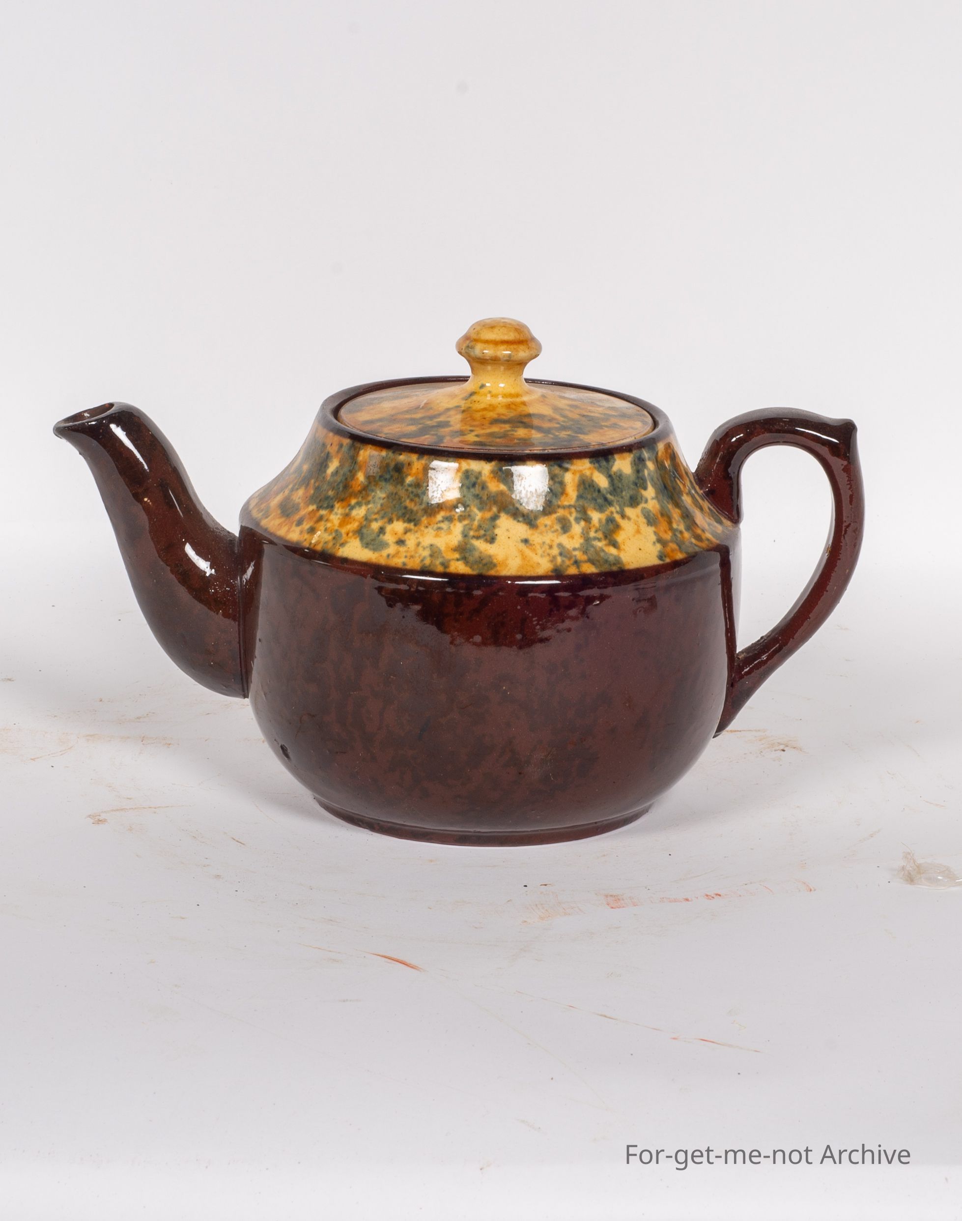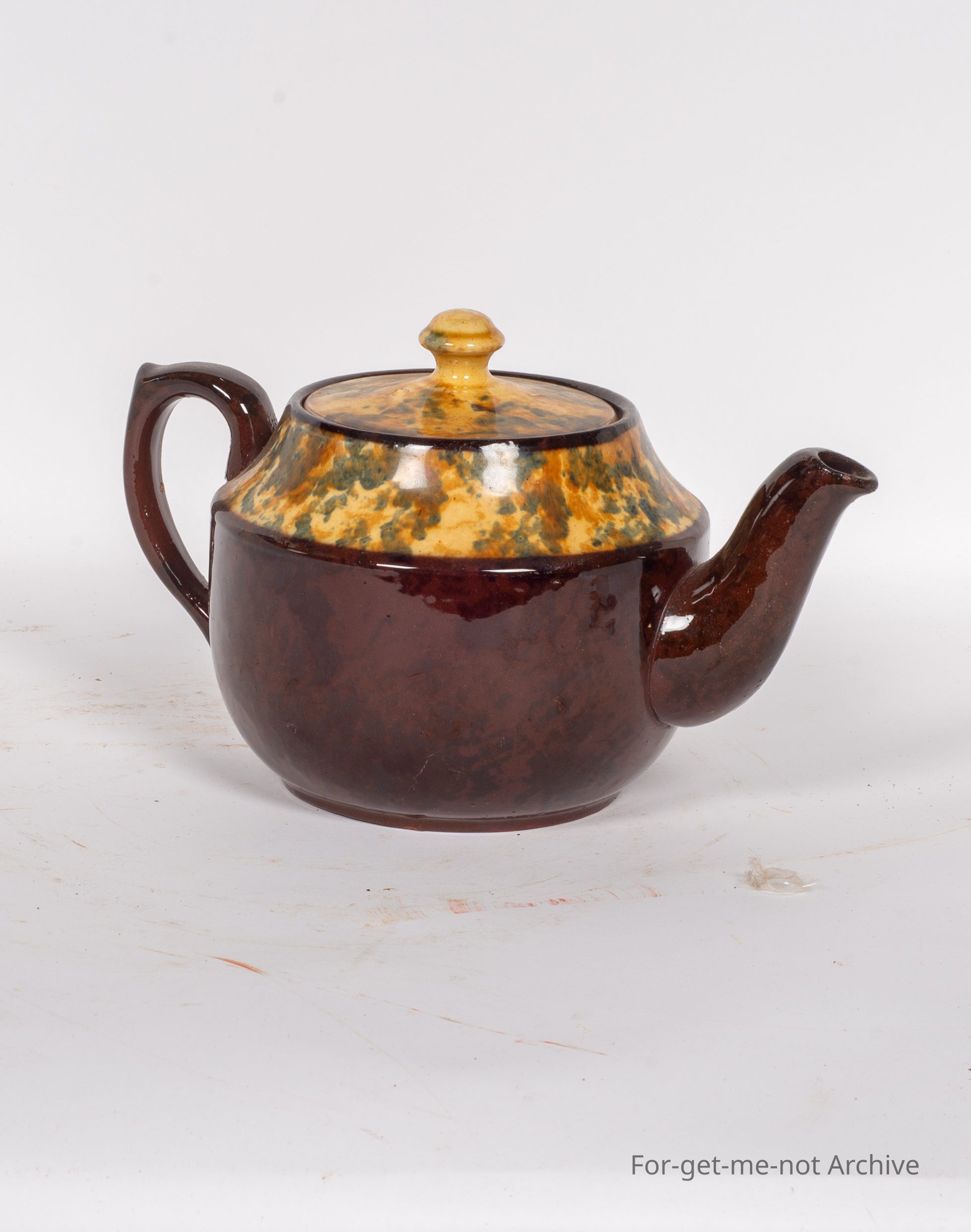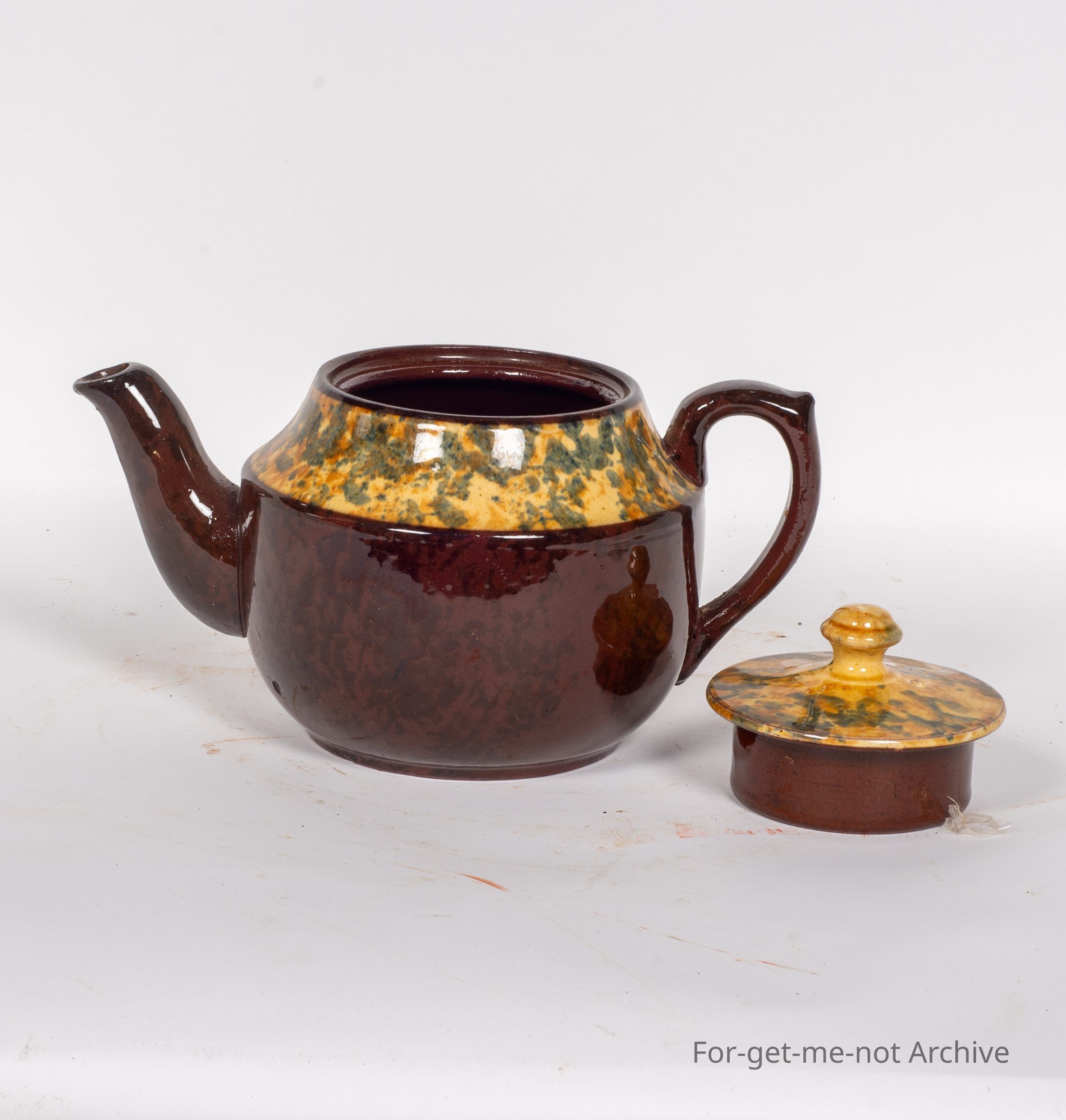 This is a ceramic teapot, of English origin. Quite an attractive pot, with a majolica type top, ring glaze, and on the lid, the rest of it is a rich chocolate brown.