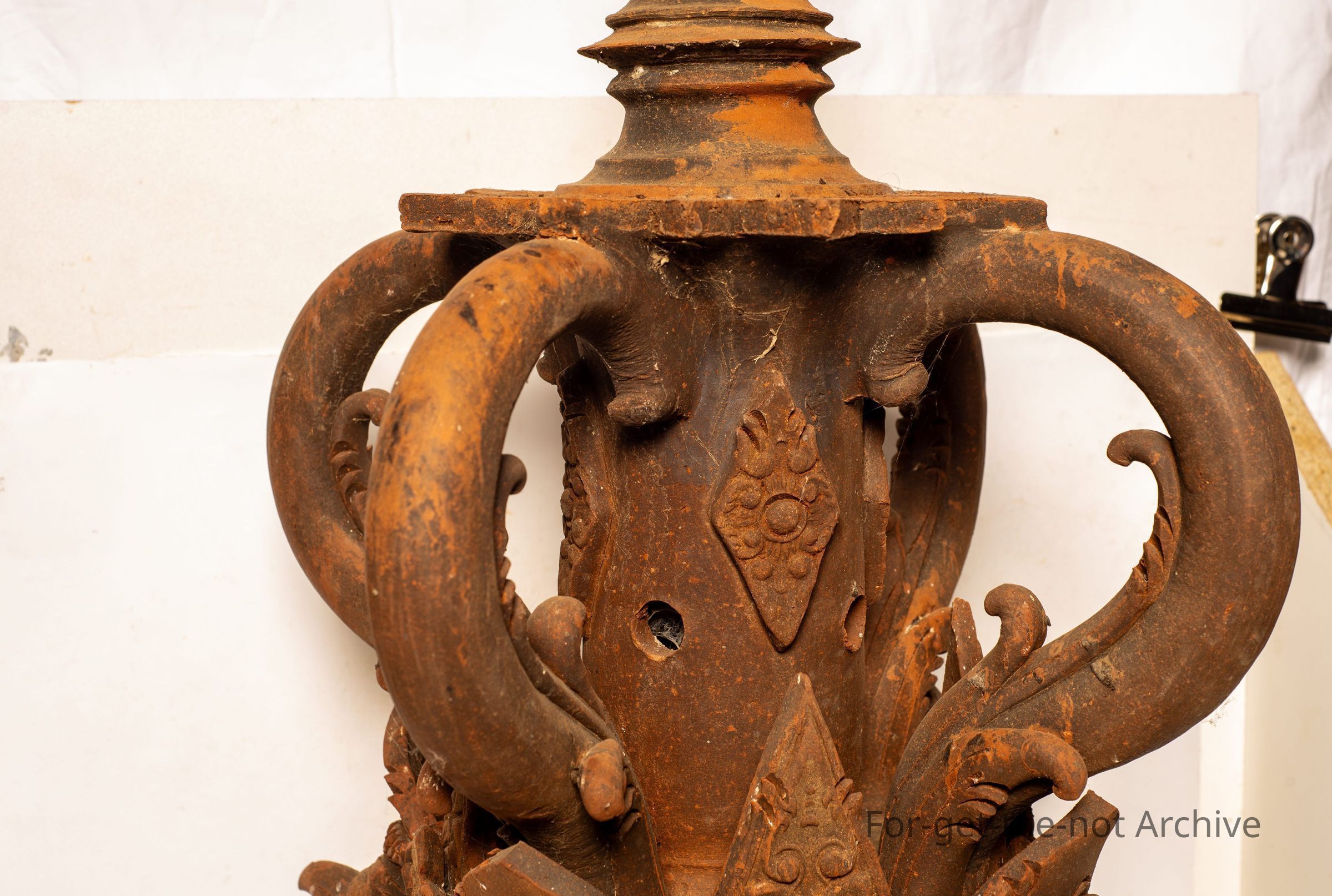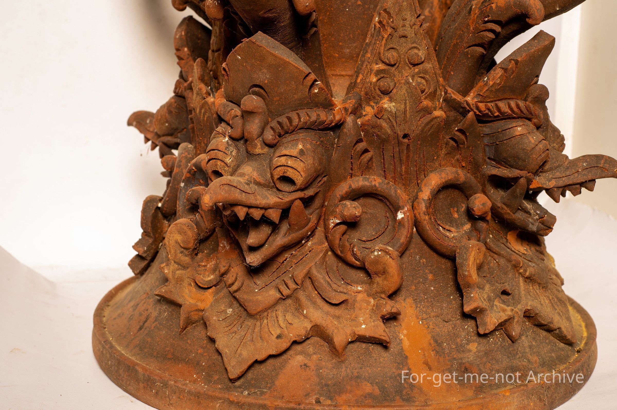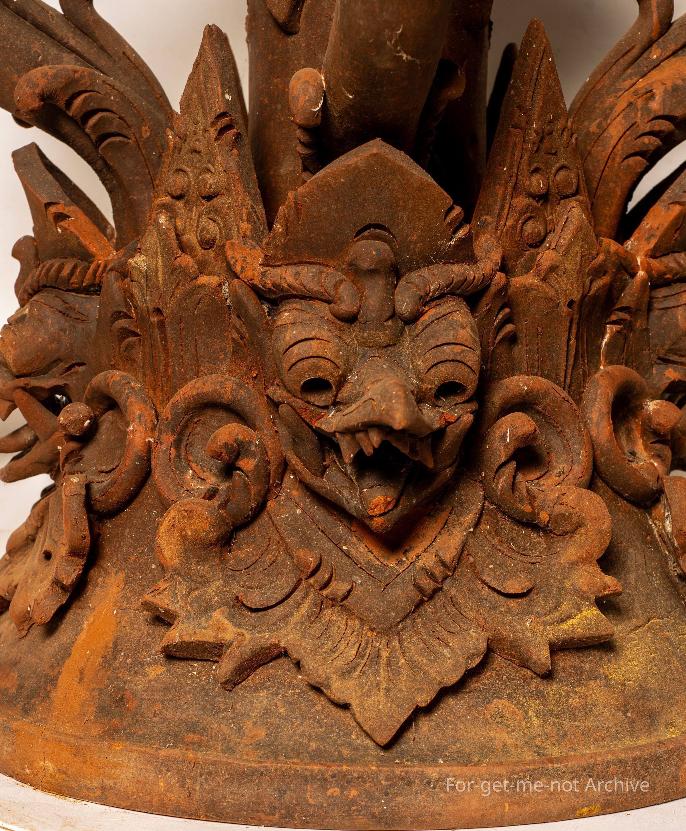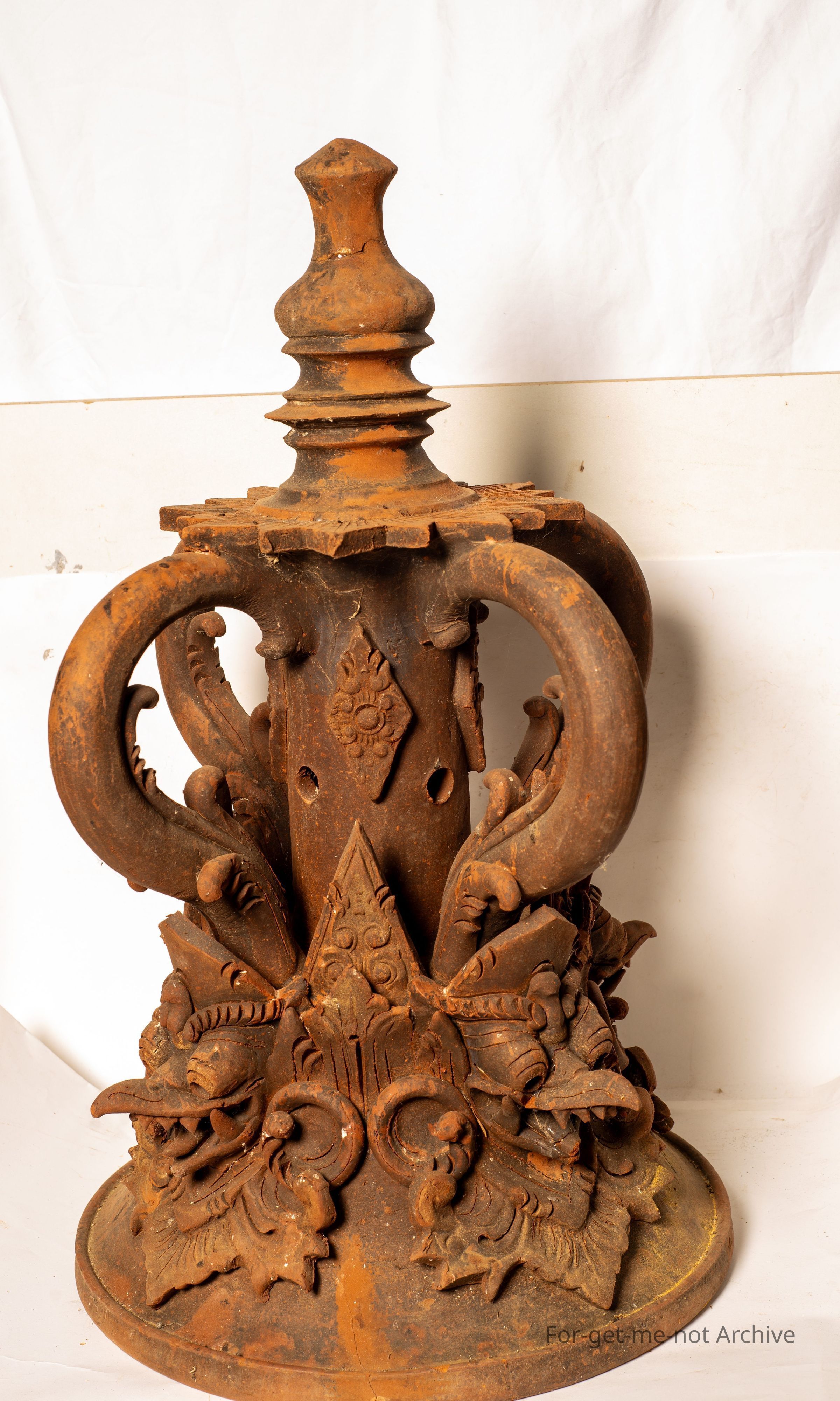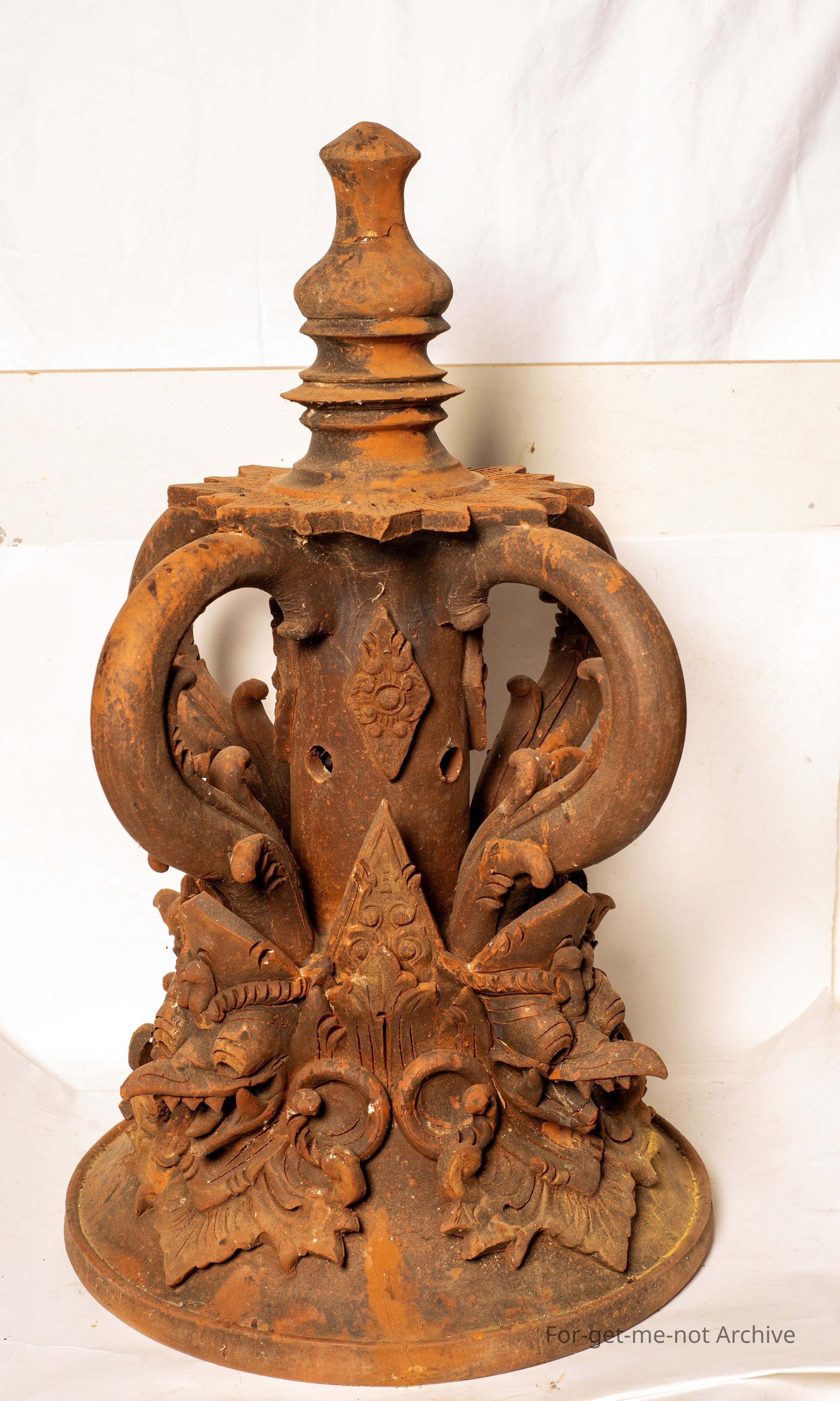 A complex finial from the from a Balinese temple. This is the larger one of the 2. Both are very intricate with a lot of work. These are of a terracotta type firing. Quite extraordinary pieces and extremely well made. Both these have a hollow column to house a candle.Collection